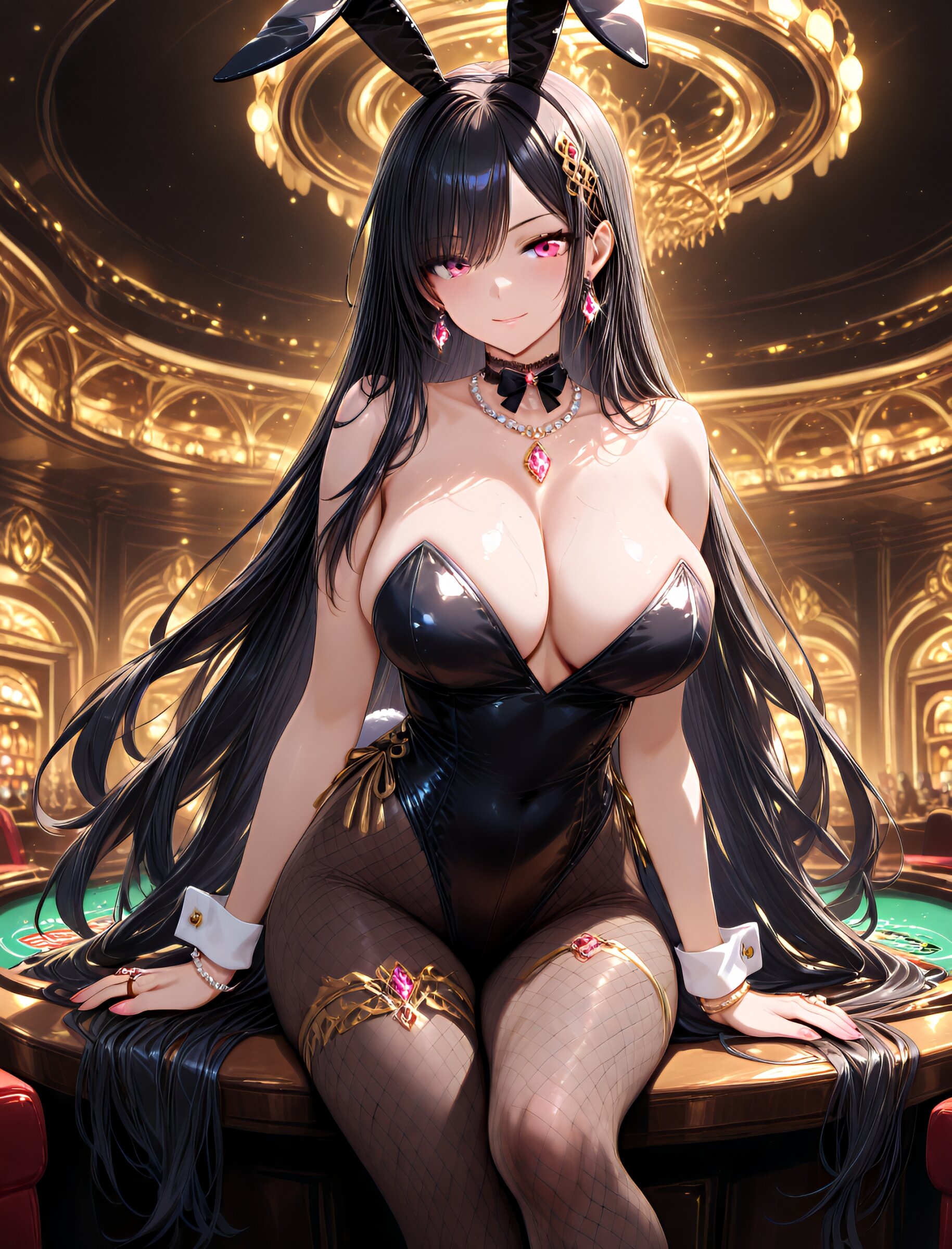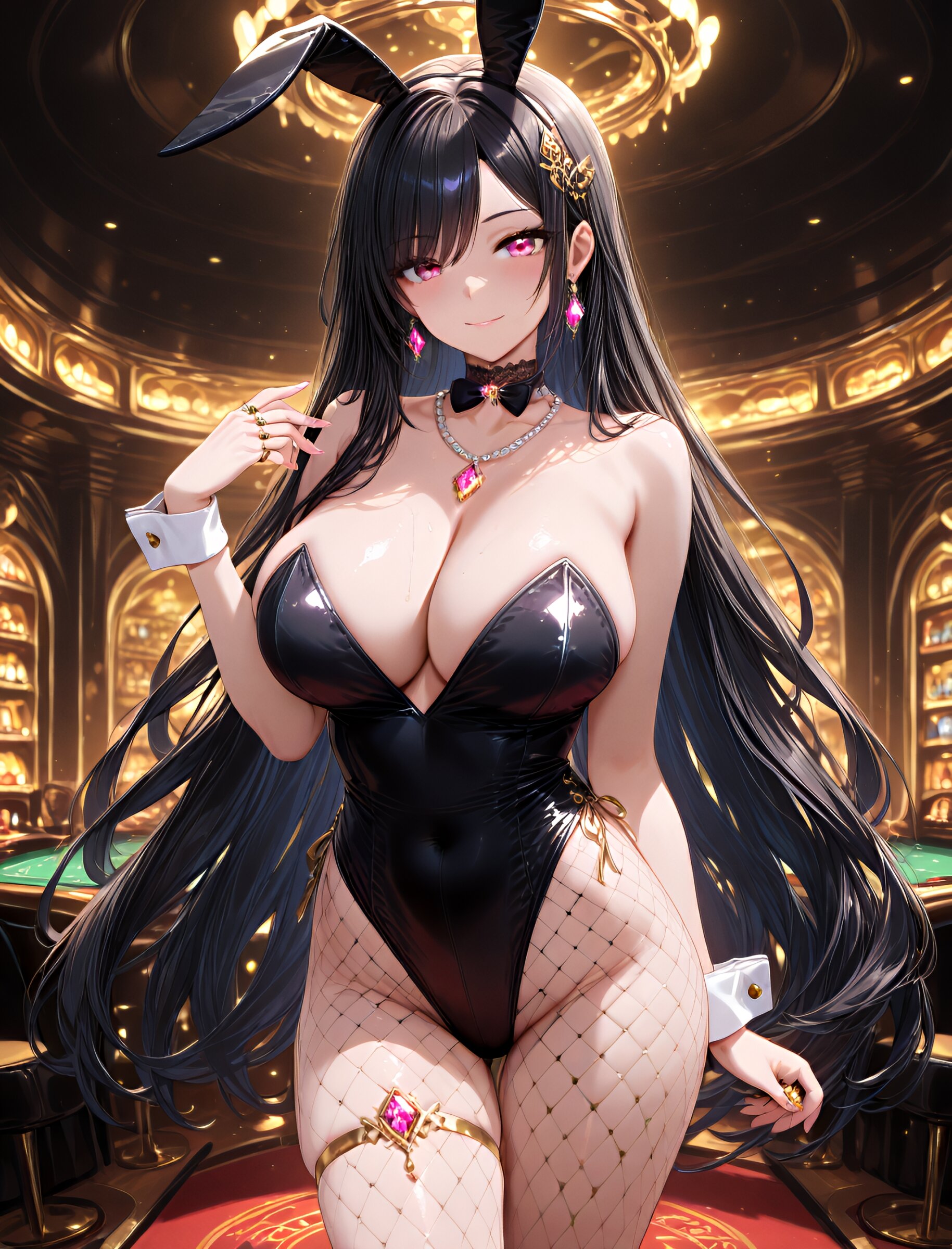 (upper body:1.8),solo, glowing and smooth skin, delicate and soft facial features, radiant smile, charming and feminine pose, pastel tones, heartwarming and cheerful atmosphere, ultra-detailed shading, high contrast and sharp clarity, playful and lively expression, (long flowing black hair),pink eyes,(long legs:1.6),cute girl,(large breast and hips:1.2), bunny ears headband, fishnet tights, high heels, elegant cuffs, bowtie choker, lace choker, pearl necklace with gemstone pendant, layered gold chains, diamond earrings, intricate hair ornaments, sparkling brooch, statement rings with precious stones, detailed finger bracelets, thigh chain), (dynamic lighting), (soft neon glow), (casino VIP lounge or luxurious club background:1.2), (masterpiece, best quality, 8k resolution, cinematic lighting, very aesthetic, visually stunning) <lora:noobai_ep11_stabilizer_v0.11_fp16:0.7> <lora:StS-Illustrious-Detail-Slider-v1.0:2.> <lora:sdxl-hairdetailer_02:2> <lora:xl_more_art-full_v1:1.4> <lora:spo_sdxl_10ep_4k-data_lora_webui:0.7>