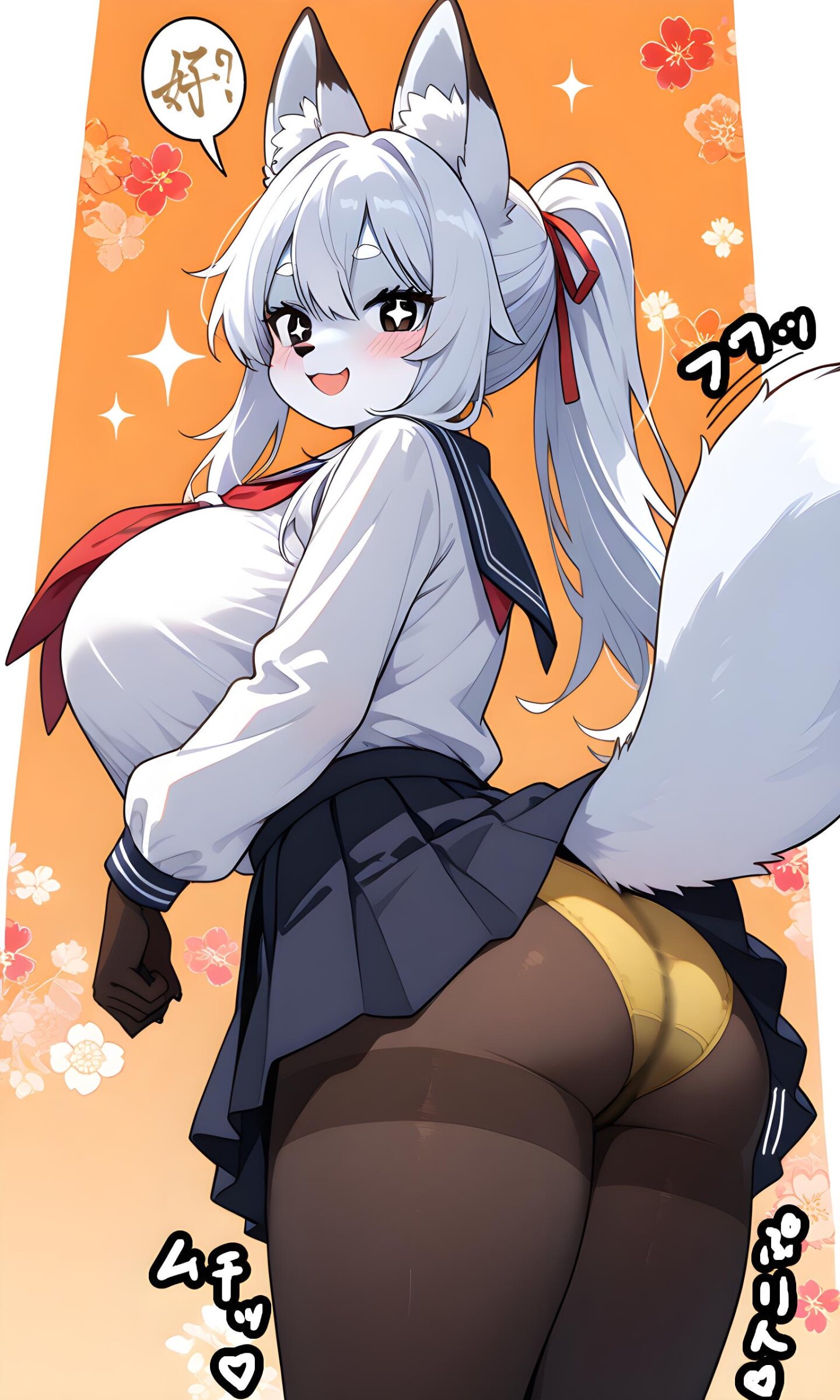 best quality,ultra good anatomy,ultra detailed,good depth,(deep shadows),absurdres,very aesthetics,UHD,HDR,(stylized),(kawaii),xnalara,matte,shader,(anime coloring),(cute),beautiful face,1girl,oppai loli,(fox girl),(furry female),white fox ears,white fox tail,(huge breasts),slim,thick thighs,big ass,fox muzzle,white hair,long hair,ponytail,white eyebrows,hair between eyes,black eyes,tsurime,+_+,smile,open mouth,school uniform,serafuku,red neckerchief,white sailor suit,sailor suit tucked in,black pleated skirt,black pantyhose,yellow panties through pantyhose,standing,forward fold,closed mouth,orange background,plum blossom patterned background,looking at viewer,from front,furry,(two tone fur),(furry body),perfect body,detailed face,high quality,cute clothes,hot,animal tail,animal ears,solo,masterpiece,seductive mischievous expression,eductive demeanor,gddw,((correct_anatomy)),(Sparkle shaped eyes),Sparkle shaped pupils