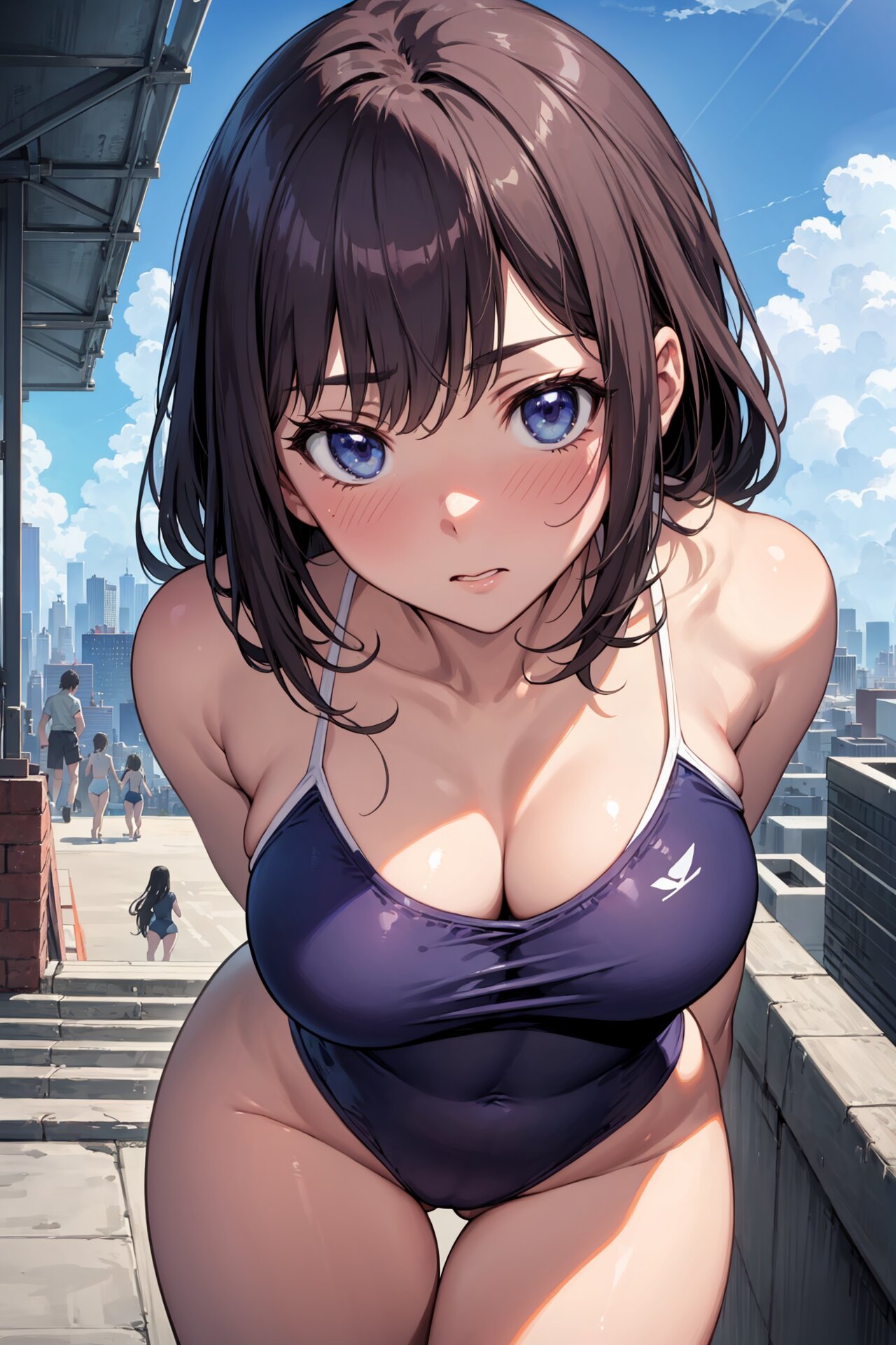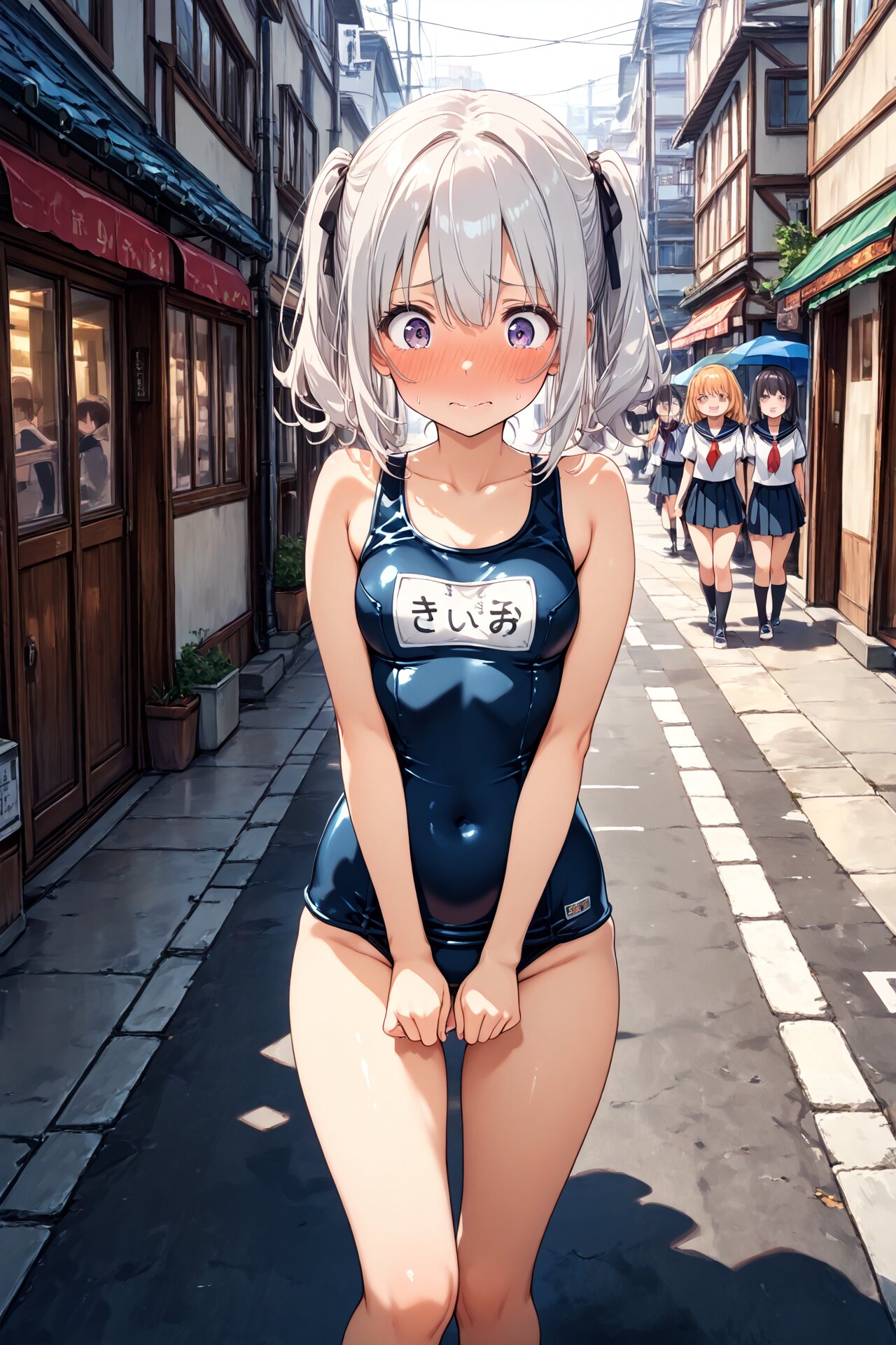 ((masterpiece)), ((high resolution)), ((best quality)), (ultra-detailed), anime, ((kawaii)), cute, (lovely), ((extremely detailed)), best quality, dynamic angle, (beautiful), ((New York cityscape)), downtown, embarrassed face, clear sky, school swimsuit, crowd,