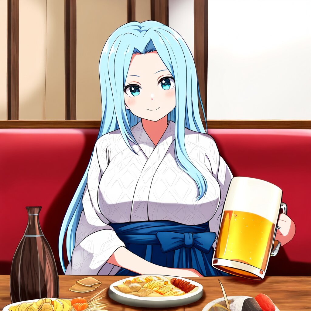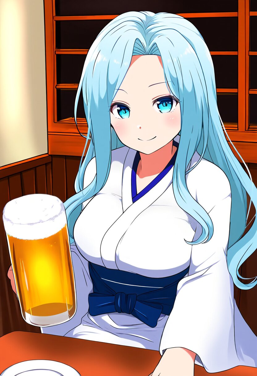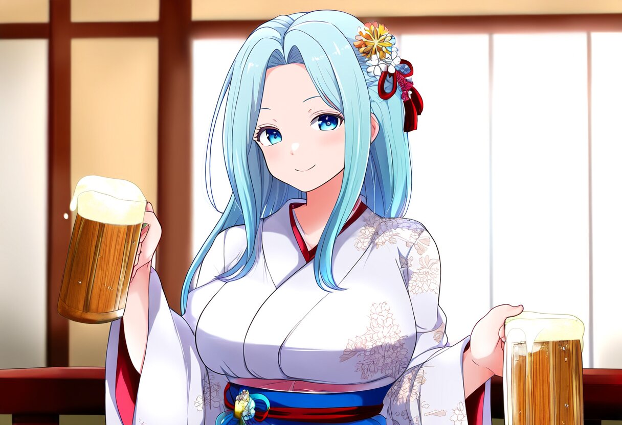 {{{highly detailed}}}, {{official style}}, {100-layer}, {{ultra-high resolution}}, {{{hi-vision anime}}}, {{intricate}}, {{25 year old women}}, {{adult women}}, {{kenka hyakken, girlfriend (kari)}}, 1girl, solo, long hair, aqua hair, light blue eyes, forehead, large breasts, {{happy, smile}}, {{{white kimono, blue obi}}}, sitting, {{hold the beer mug}}, {{restaurant}}, table, indoor, {{{masterpiece}}}, {{{best quality}}}, {{{very aesthetic}}}, {{{ultra-detailed}}}, {illustration}, {{{extremely detailed}}}, {{{an extremely delicate and beautiful}}}