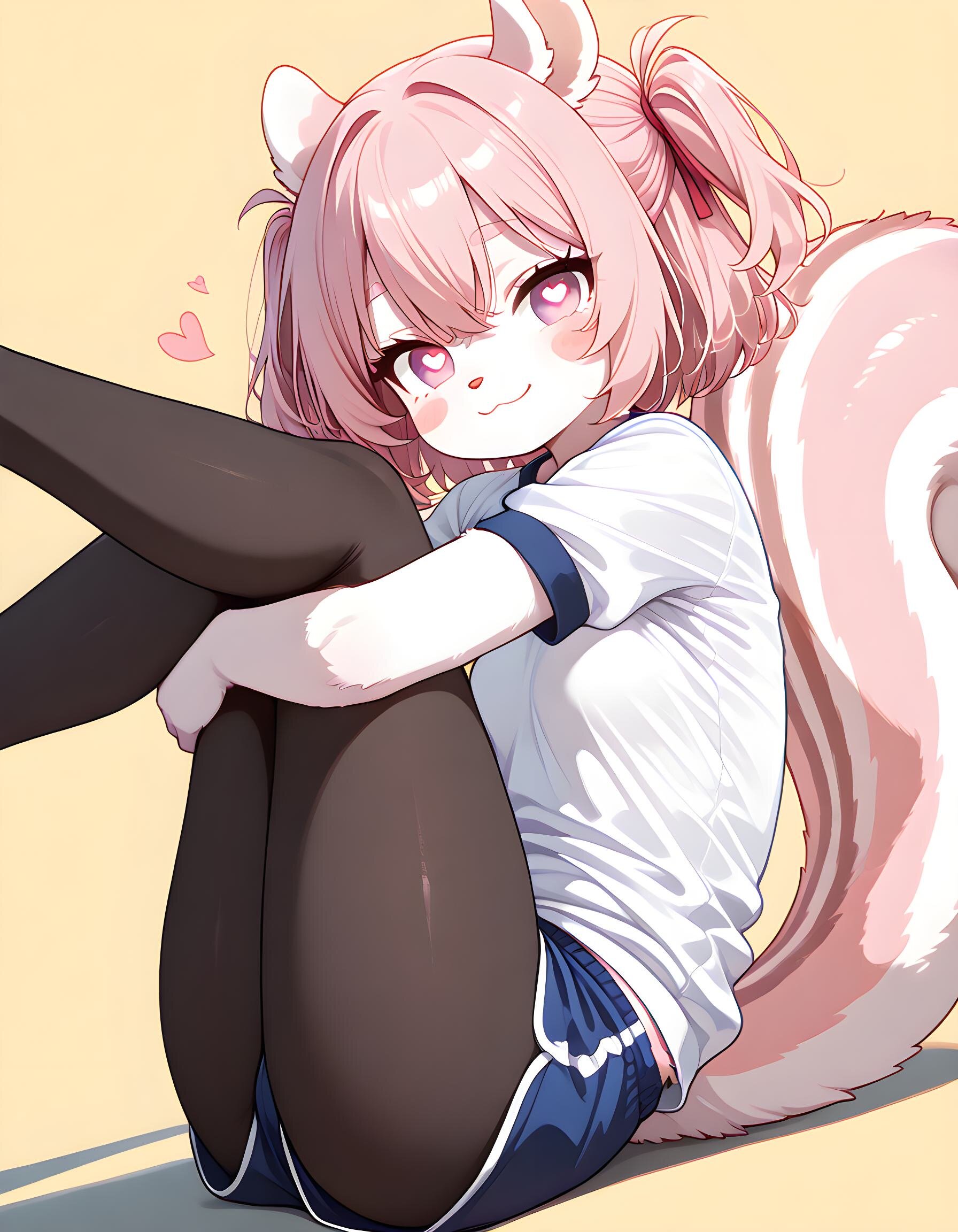 beautiful face,solo,short female,oppai loli,(squirrel girl),(furry female),pink squirrel ears,pink squirrel tail,(flat breasts),slim,thick thighs,wide hips,pink hair,short hair,two side up,pink eyebrows,hair between eyes,pink eyes,tsurime,round eyes,smile,blush stickers,closed mouth,a gym uniform,white gym shirt,blue gym shorts,black pantyhose under shorts,sitting,hugging own legs,closed mouth,yellow background,white frame,looking at viewer,from side,(stylized),(kawaii),(cute),furry,gddw,furry,(two tone fur),(furry body),perfect body,detailed face,visible wide hips,high quality,cute clothes,animal tail,animal ears,solo,voluminous thighs,masterpiece,seductive mischievous expression,eductive demeanor,((correct_anatomy)),cute pastel colors, soft pastel colors, ,heart eyes, heart-shaped, shiny heart eyes