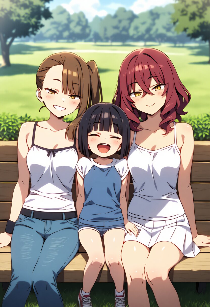 {ai-generated}, ai-assisted, {{{Japanese anime coloring}}}, {{year 2024}},3girls,2mothers and daughter,sitting side by side,midday,shiny,{in sunny park},from front, masterpiece, best quality, ultra detailed, perfect fingers, high resolution, absurdres, perfect anotomy, detailed background, unity 8k wallpaper