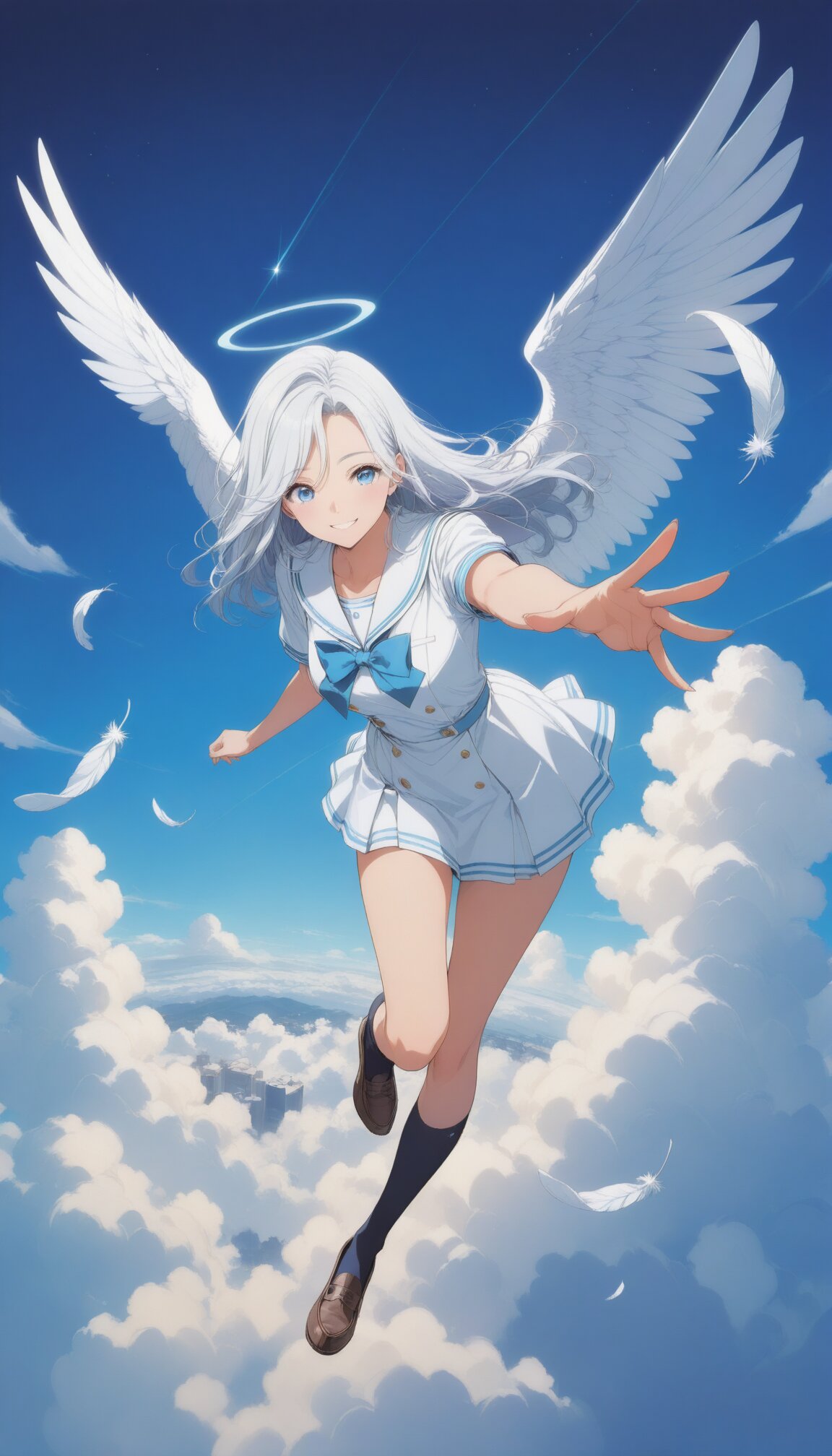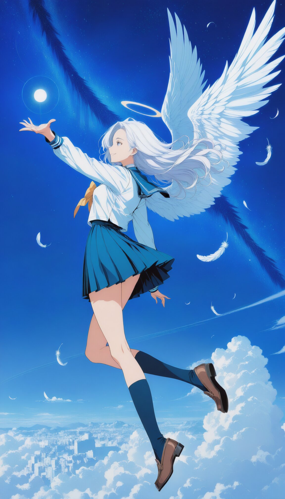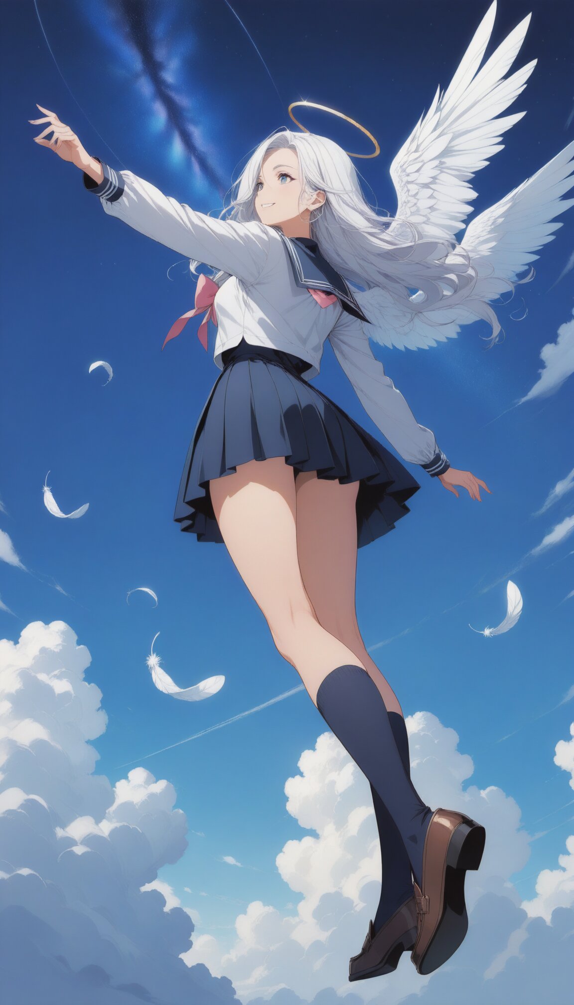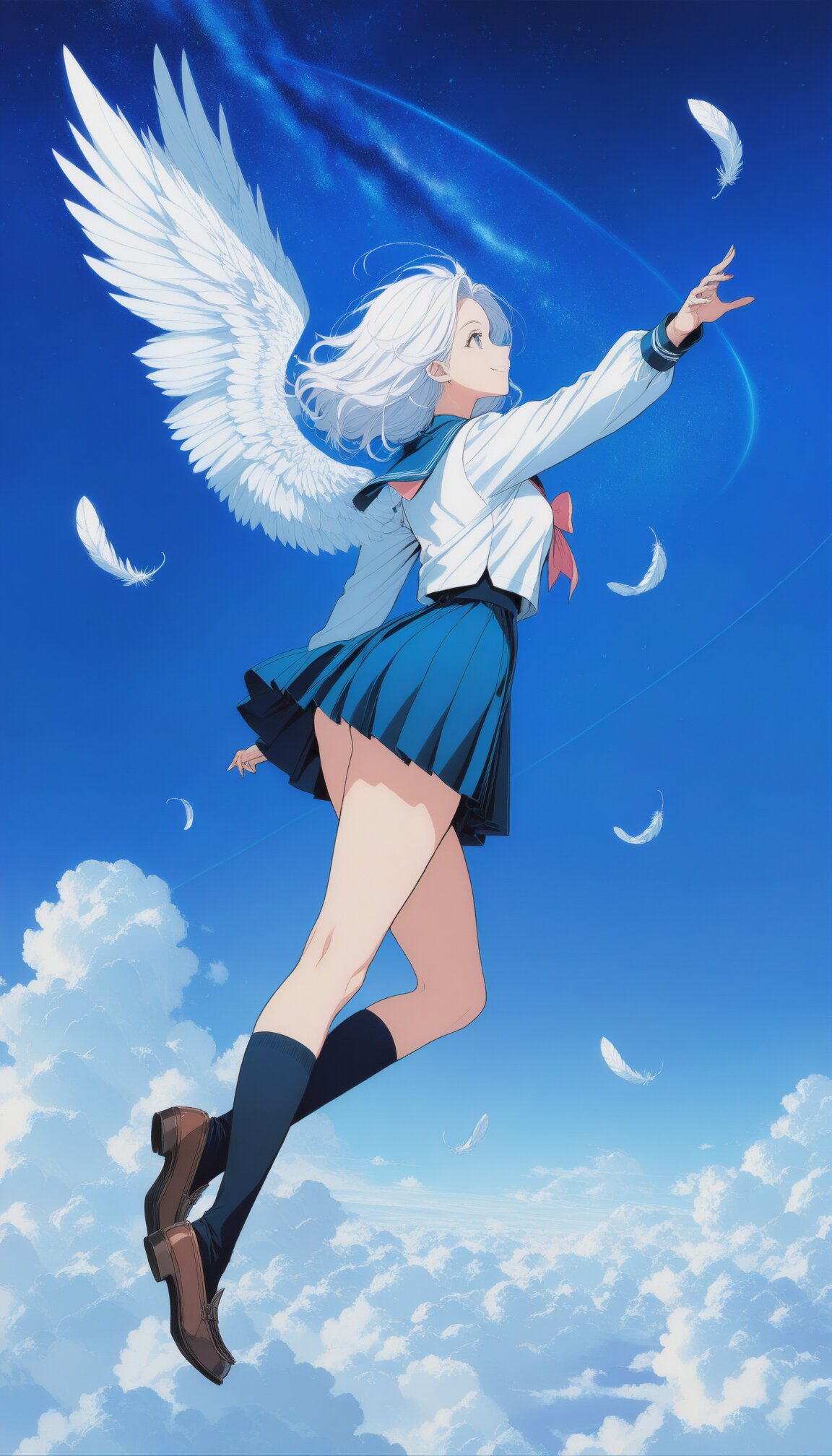 Masterpiece, Best quality,ANIME style,line art,sense of depth,best quality,high resolution,ultra-detailed,a pretty girl,smile,Cream hair,high school sailor uniform,dark blue,high socks,loafers,large Angel wings on the back.flying sky,(from above),dynamic pose,dynamic angle,((reaching)),Feathers are scattering.fisheye lens