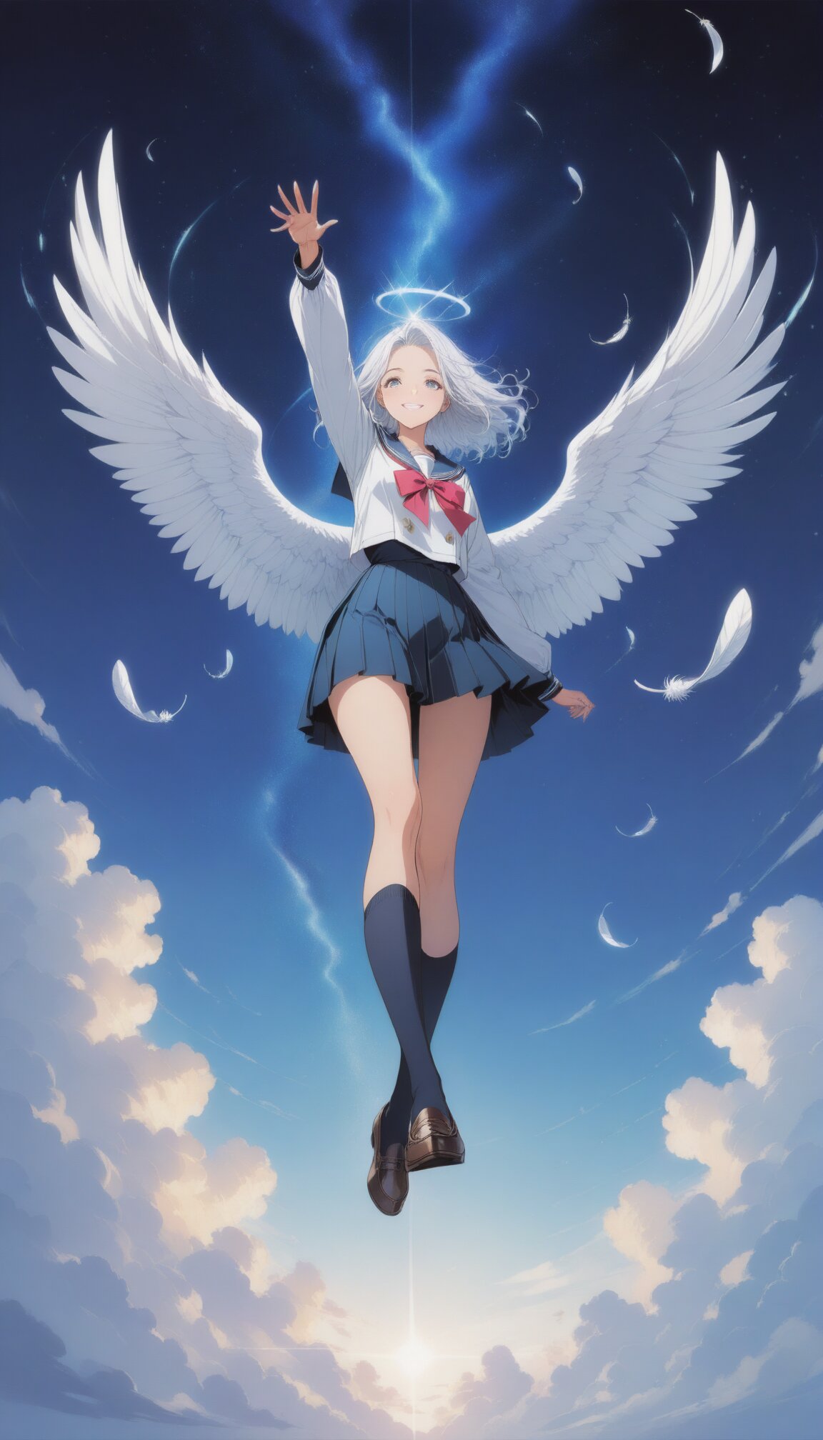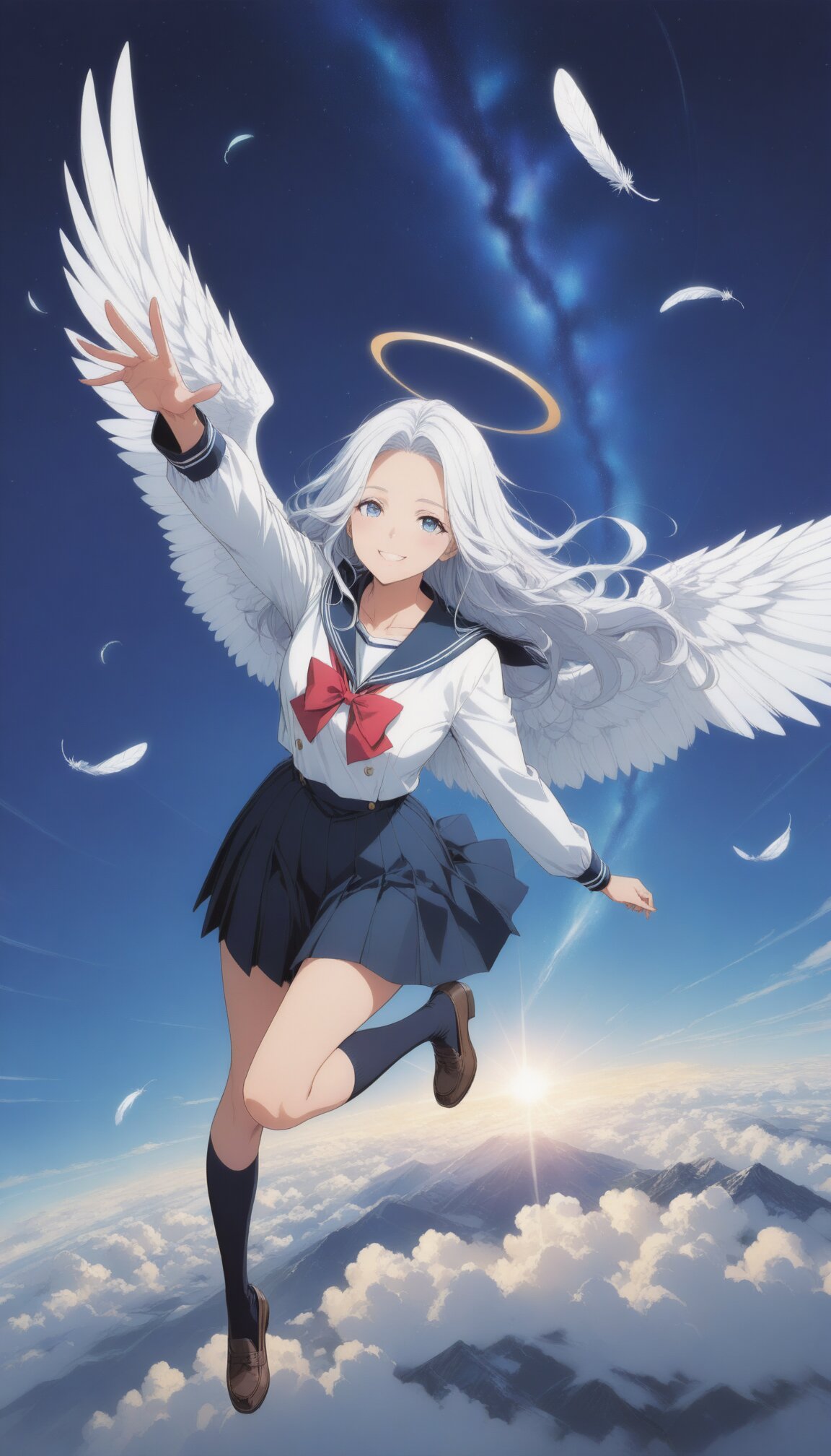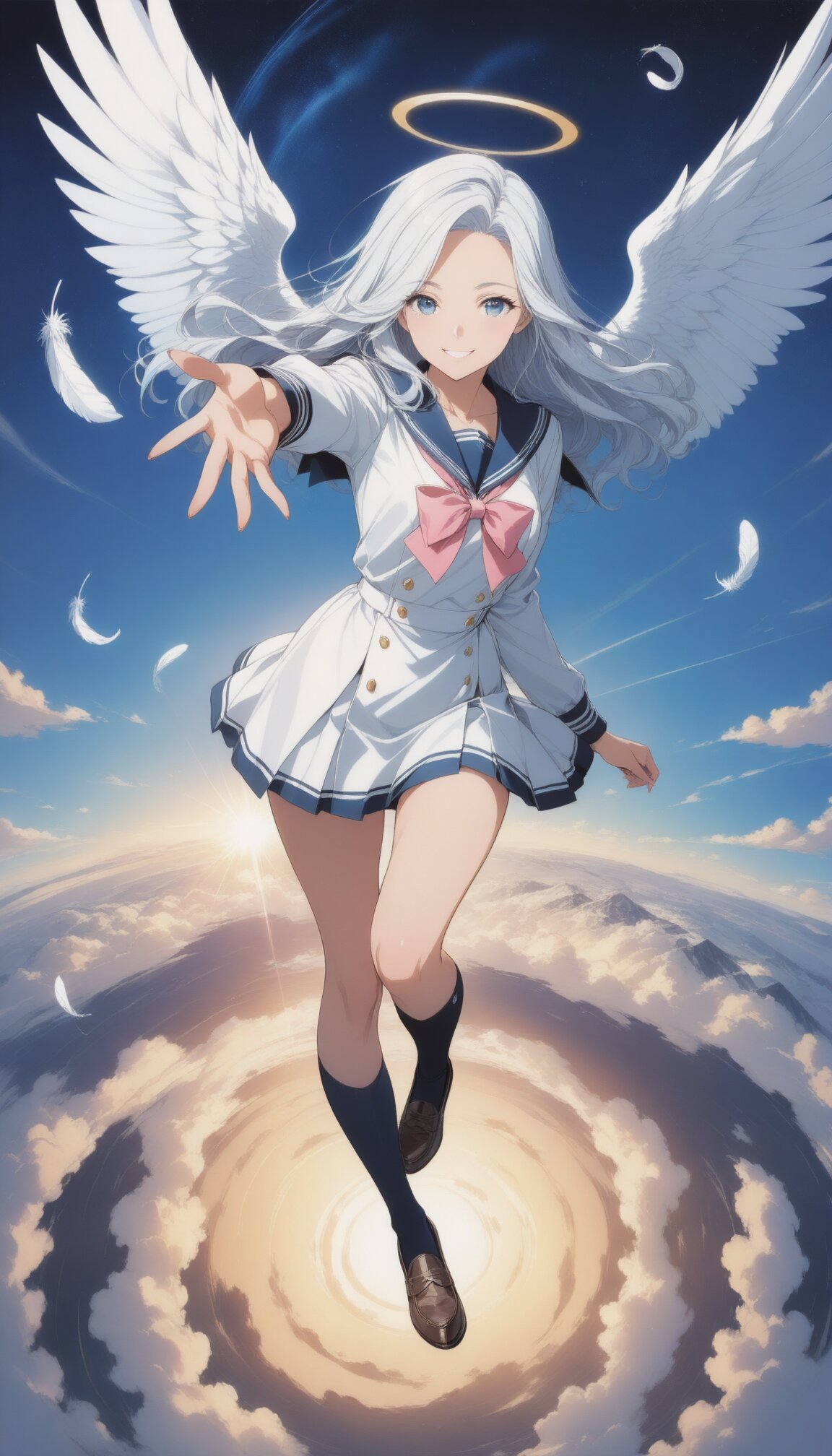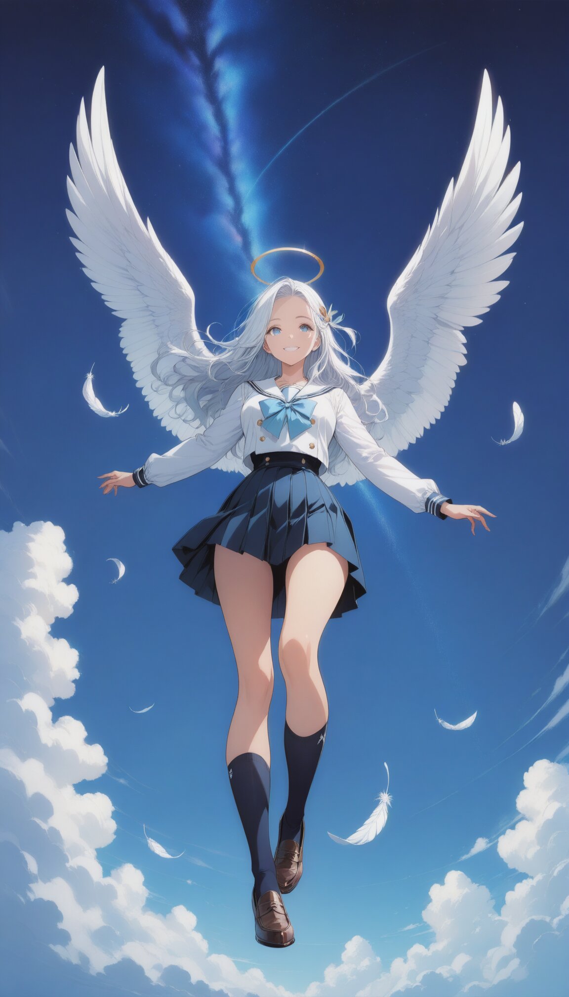 Masterpiece, Best quality,ANIME style,line art,sense of depth,best quality,high resolution,ultra-detailed,a pretty girl,smile,Cream hair,high school sailor uniform,dark blue,high socks,loafers,large Angel wings on the back.flying sky,(from above),dynamic pose,dynamic angle,((reaching)),Feathers are scattering.fisheye lens