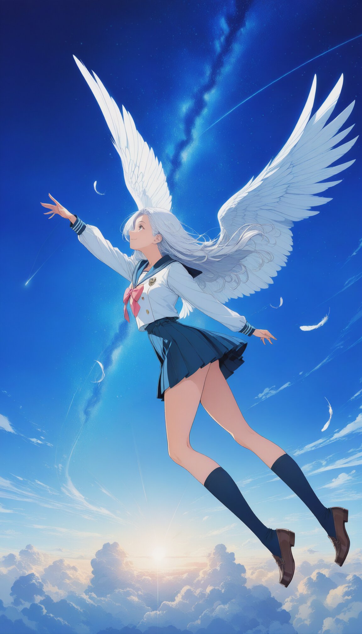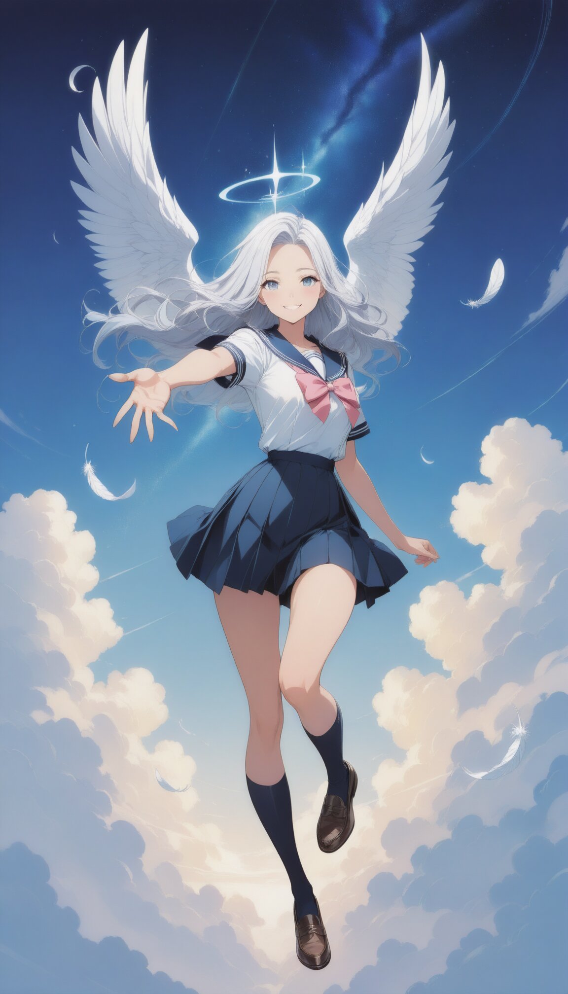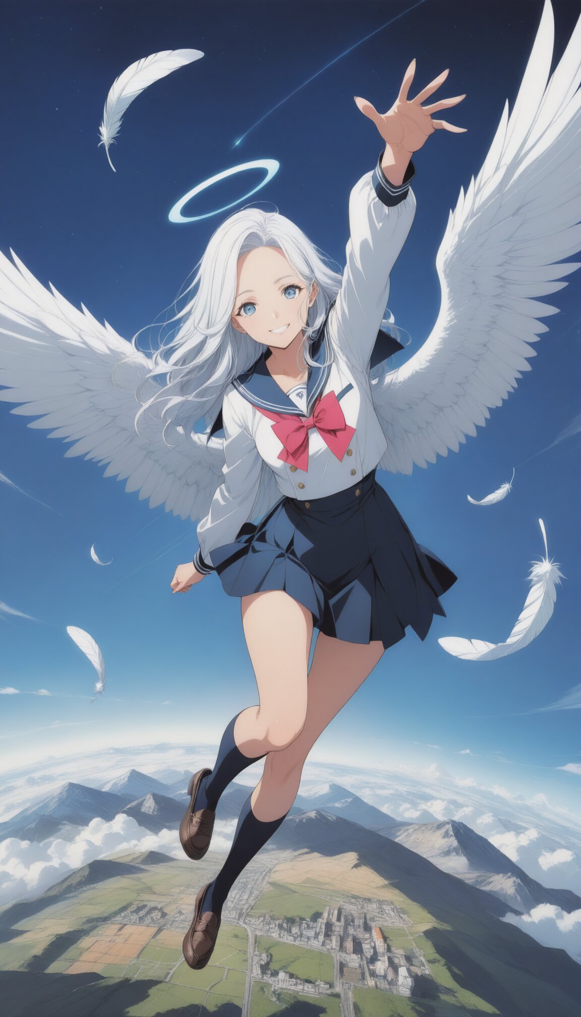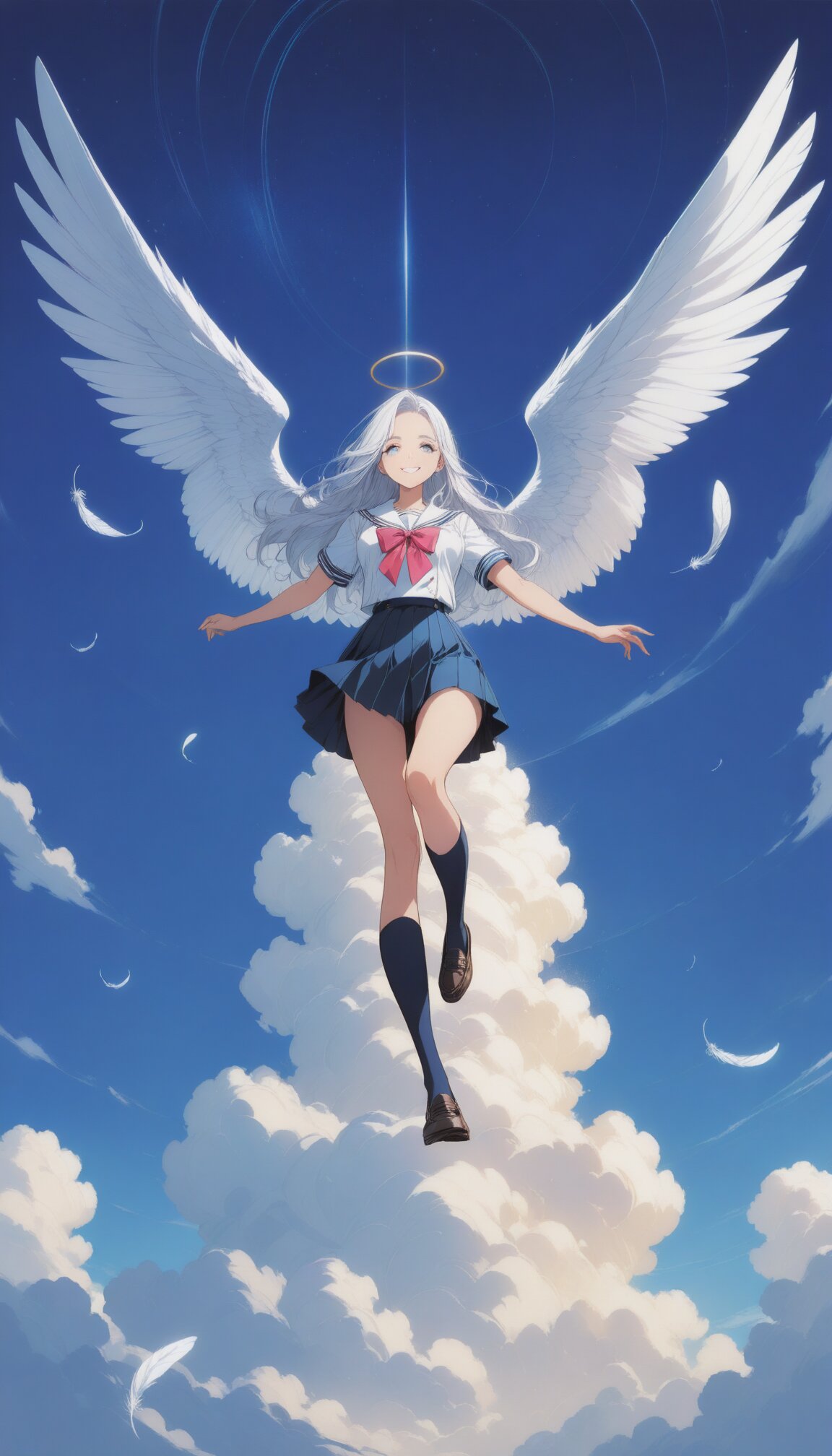 Masterpiece, Best quality,ANIME style,line art,sense of depth,best quality,high resolution,ultra-detailed,a pretty girl,smile,Cream hair,high school sailor uniform,dark blue,high socks,loafers,large Angel wings on the back.flying sky,(from above),dynamic pose,dynamic angle,((reaching)),Feathers are scattering.fisheye lens