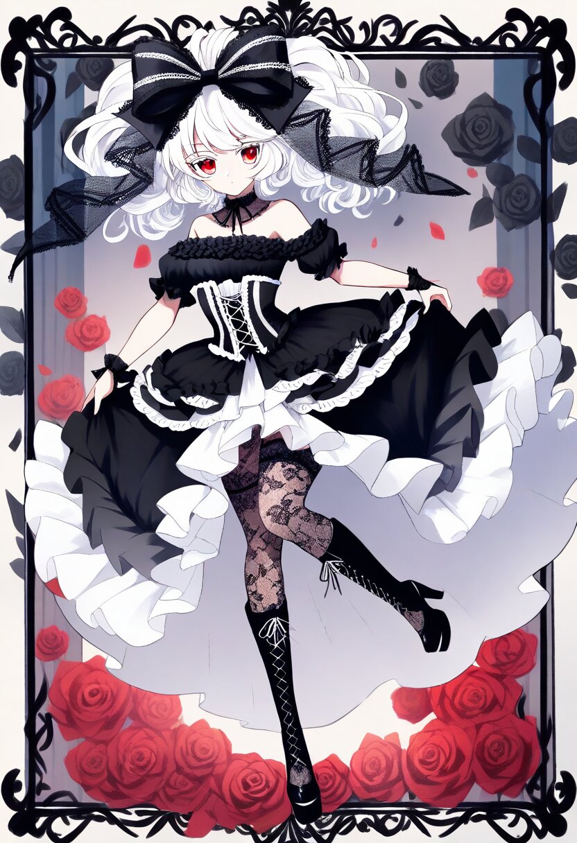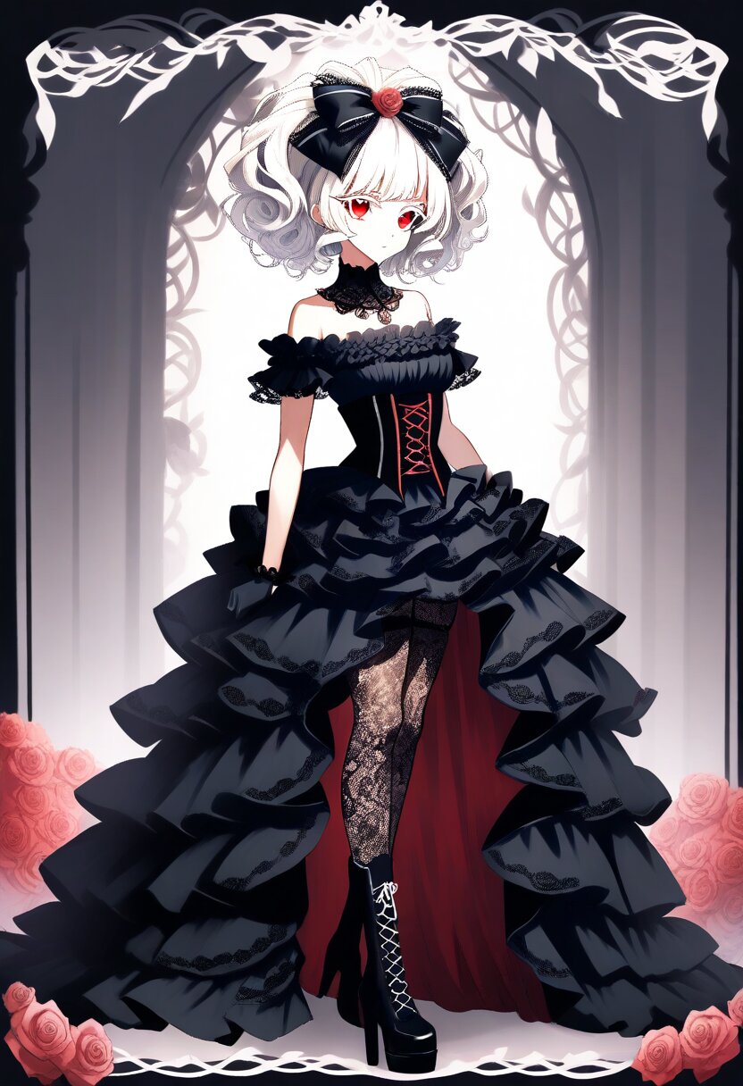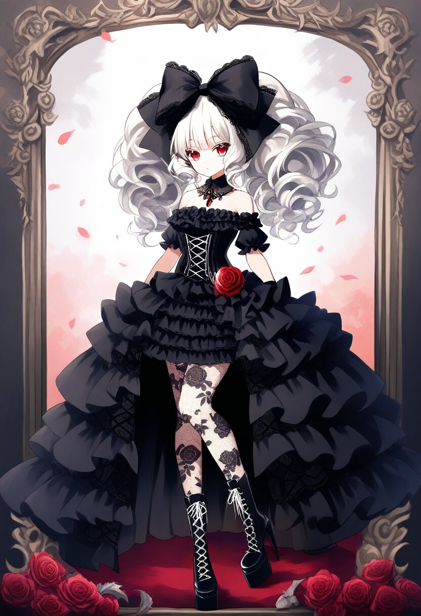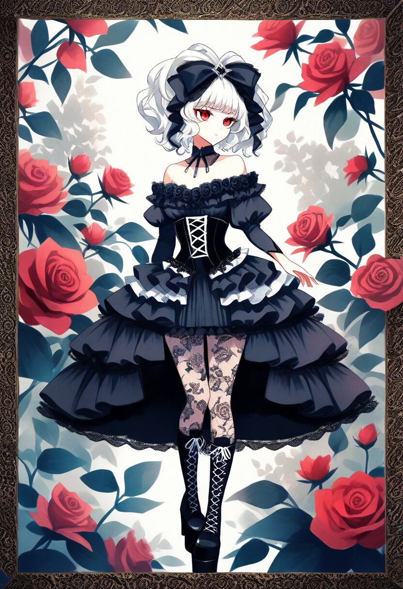 <lora:inmnsylexl4:1>best quality, masterpiece, very aesthetic, general, watercolor painting, 1girl, white hair, short hair, wavy hair, red eyes, large eyes, gothic lolita fashion, offshoulder black dress, black lace-up corset, black and white layered skirt, thigh, (wide crinoline spreading from the waist), black lace tights, black lace-up boots, thick heels, black head frill, big hair ribbon, many frill, many lace, surrounded rose, (decorative border:1.4)