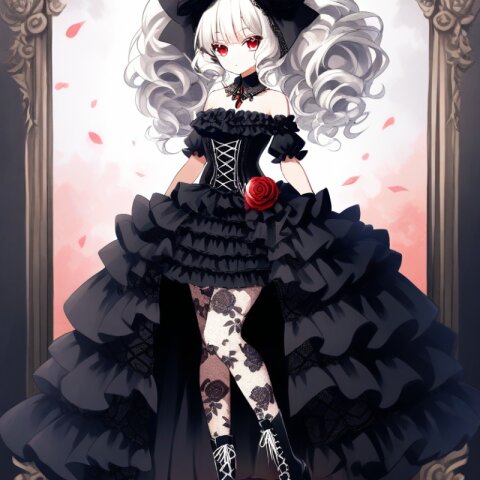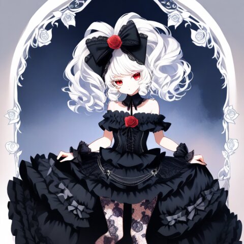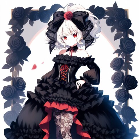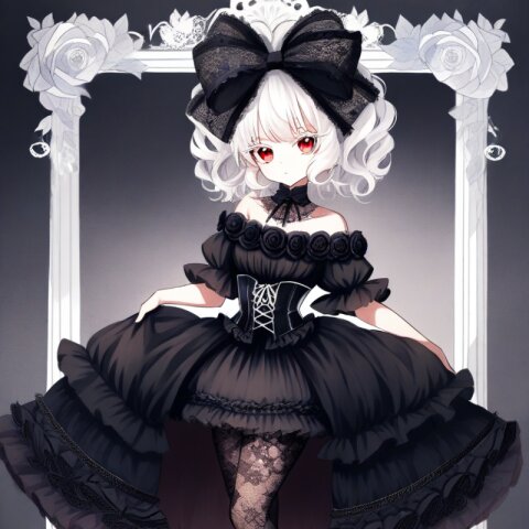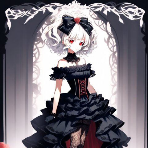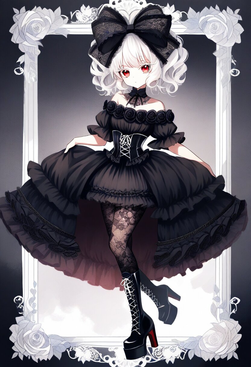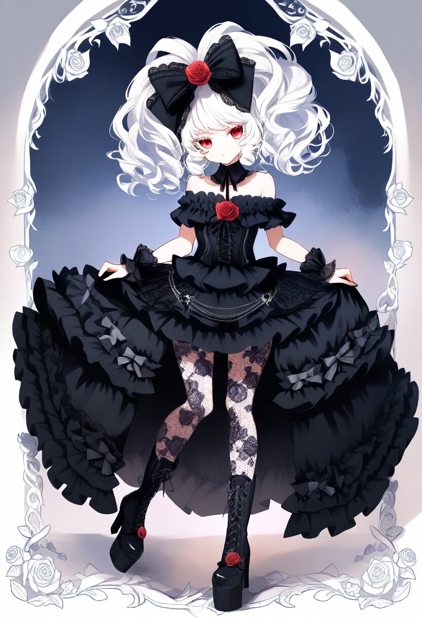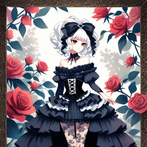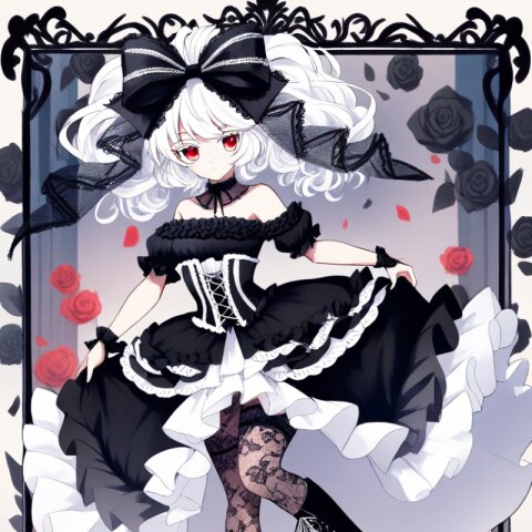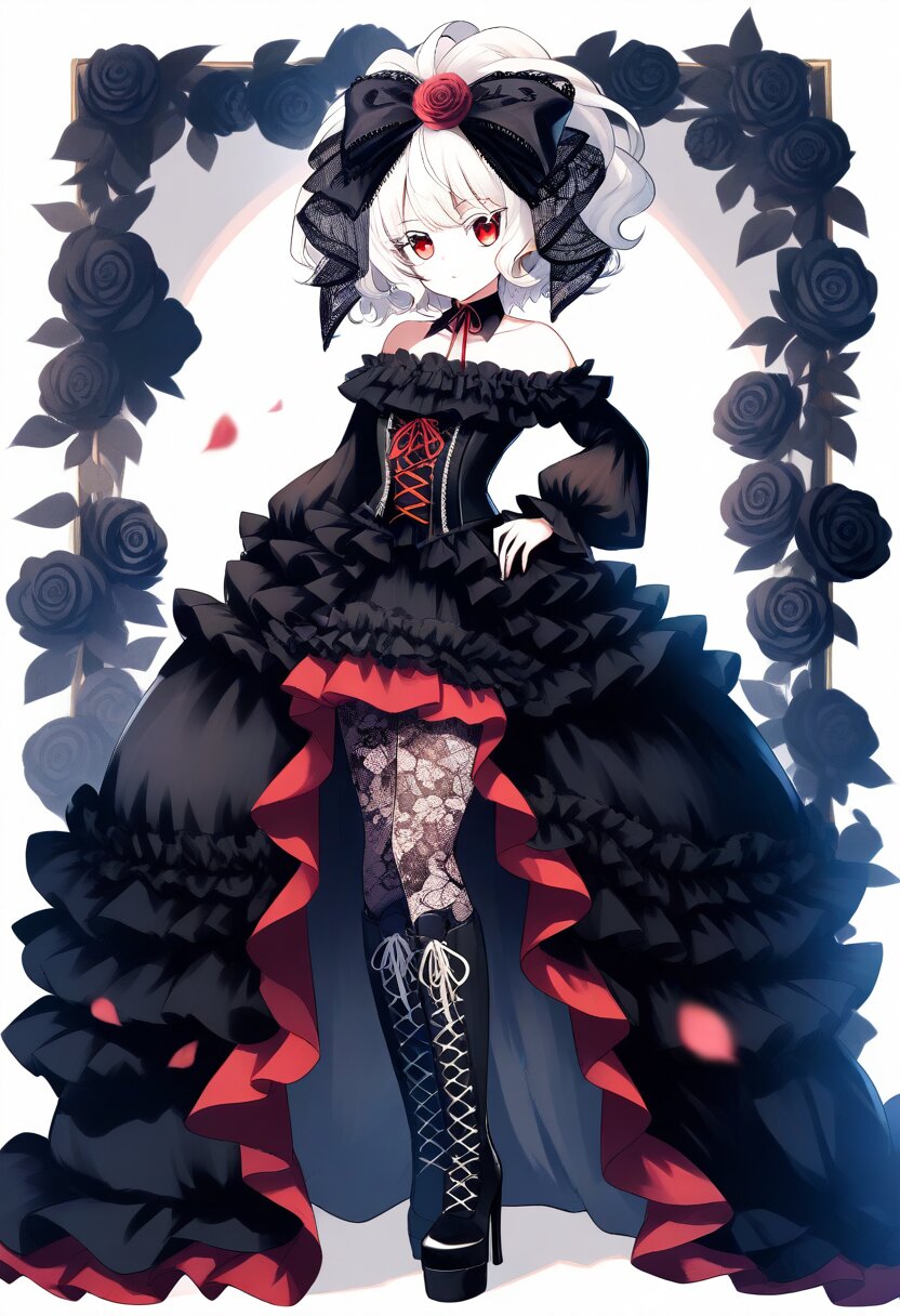 <lora:inmnsylexl4:1>best quality, masterpiece, very aesthetic, general, watercolor painting, 1girl, white hair, short hair, wavy hair, red eyes, large eyes, gothic lolita fashion, offshoulder black dress, black lace-up corset, black and white layered skirt, thigh, (wide crinoline spreading from the waist), black lace tights, black lace-up boots, thick heels, black head frill, big hair ribbon, many frill, many lace, surrounded rose, (decorative border:1.4)