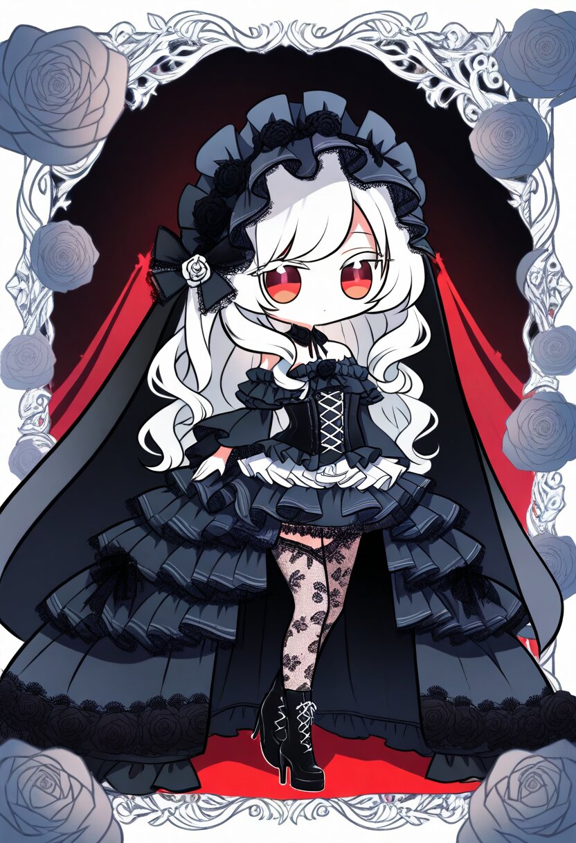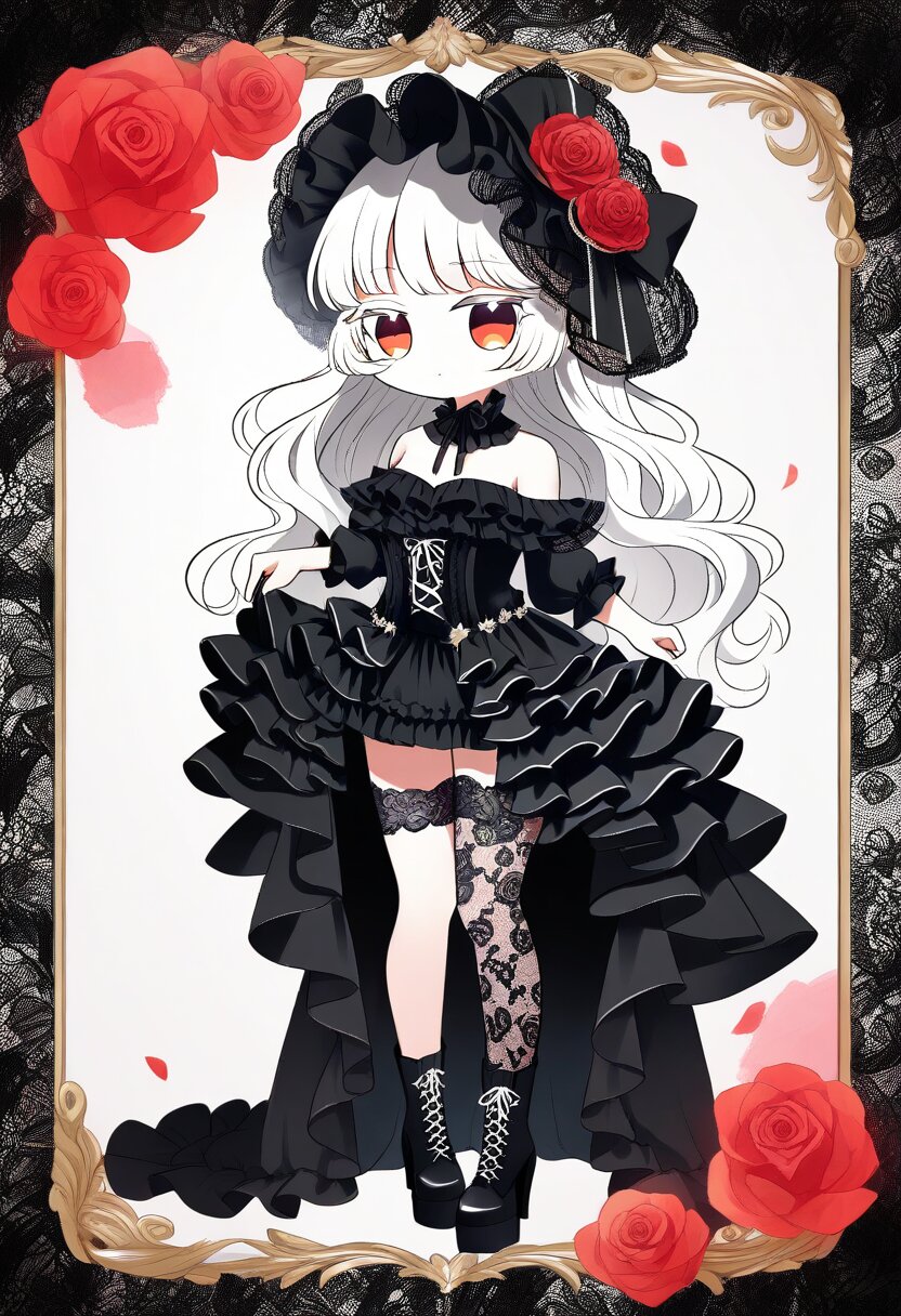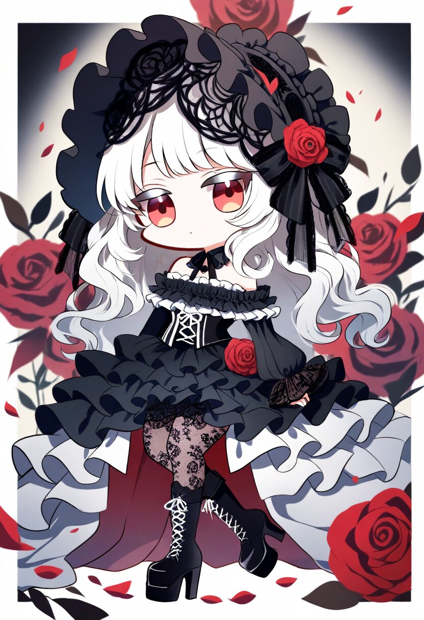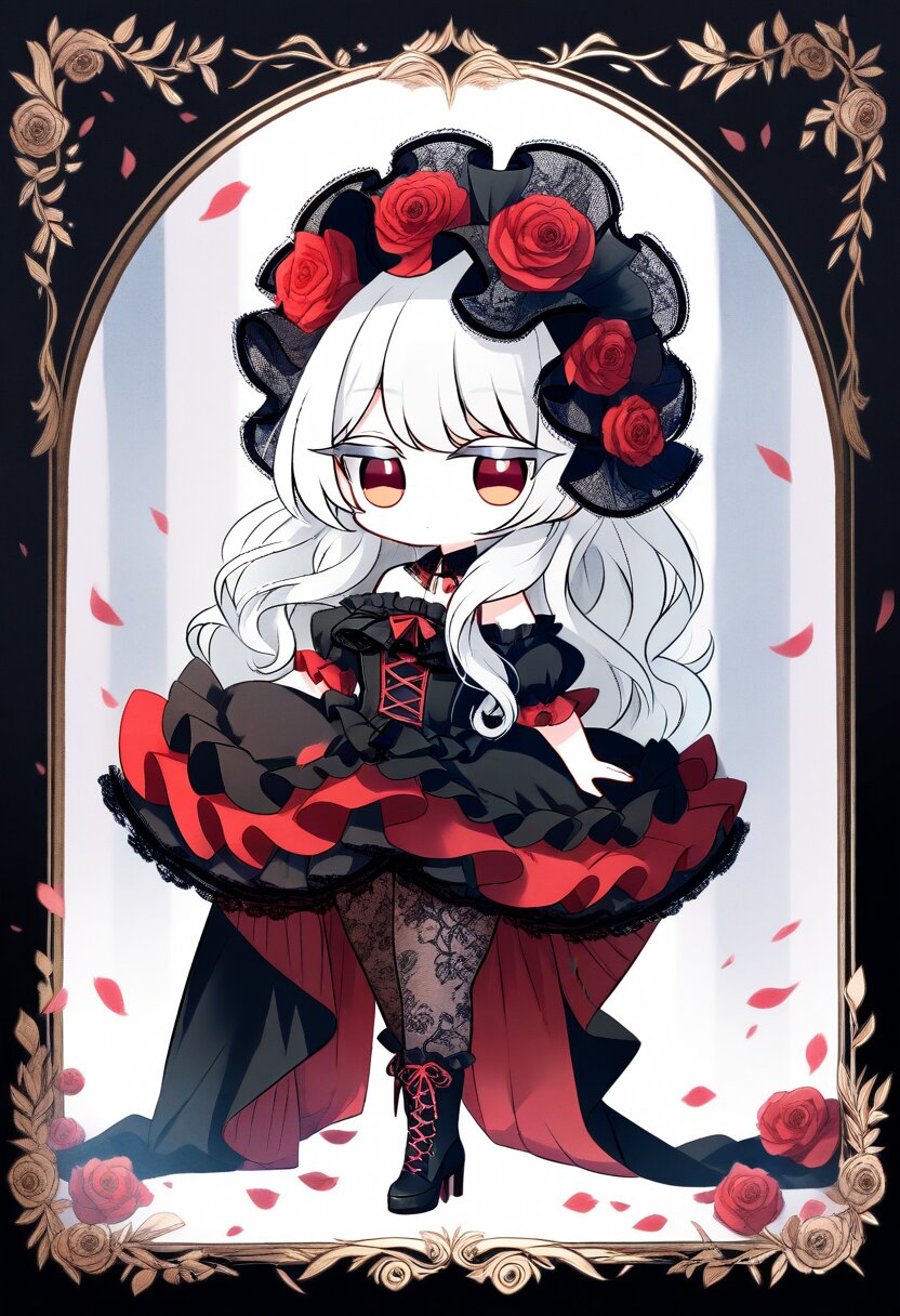 <lora:inmnsylexl4:1>best quality, masterpiece, very aesthetic, general, watercolor painting, chibi, 1girl, white hair, long hair, wavy hair, red eyes, large eyes, gothic lolita fashion, offshoulder black dress, black lace-up corset, black and white layered skirt, thigh, (skirt is voluminous with multiple layers of frills and ruffles, open at the front, revealing legs), black lace tights, black lace-up boots, thick heels, black head frill, many frill, many lace, surrounded rose, (decorative border:1.4)