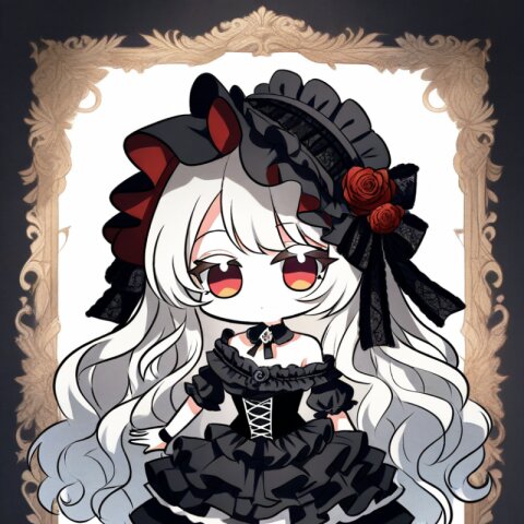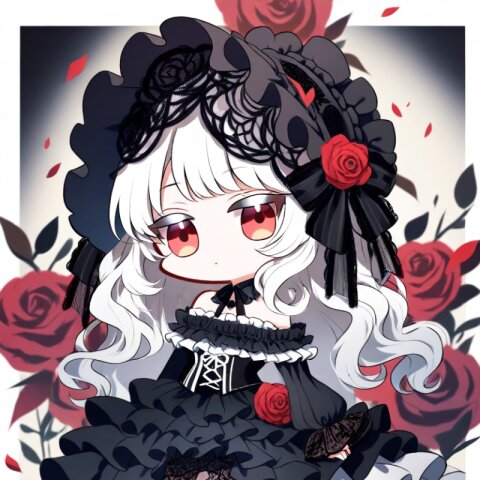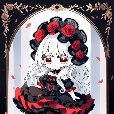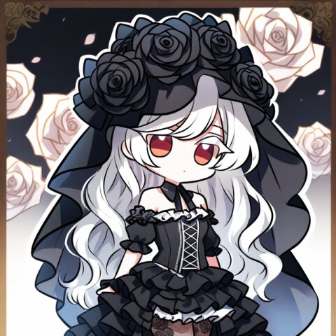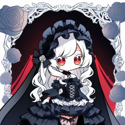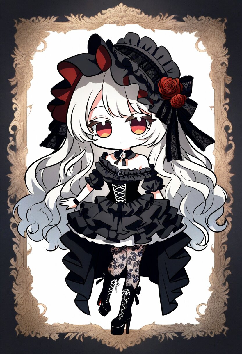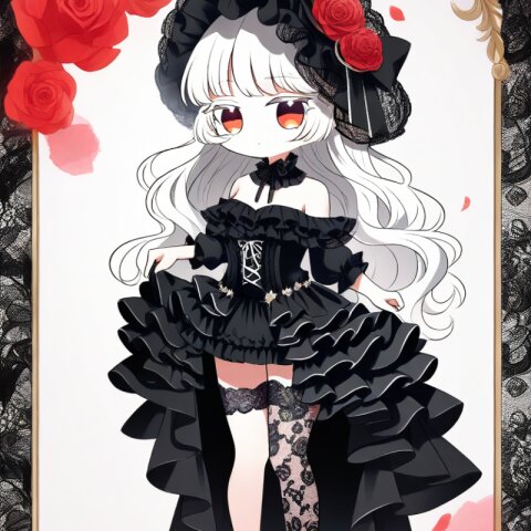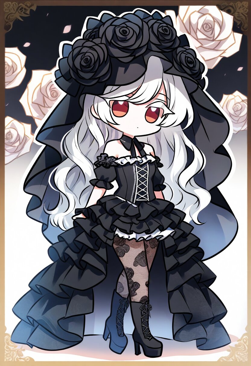 <lora:inmnsylexl4:1>best quality, masterpiece, very aesthetic, general, watercolor painting, chibi, 1girl, white hair, long hair, wavy hair, red eyes, large eyes, gothic lolita fashion, offshoulder black dress, black lace-up corset, black and white layered skirt, thigh, (skirt is voluminous with multiple layers of frills and ruffles, open at the front, revealing legs), black lace tights, black lace-up boots, thick heels, black head frill, many frill, many lace, surrounded rose, (decorative border:1.4)