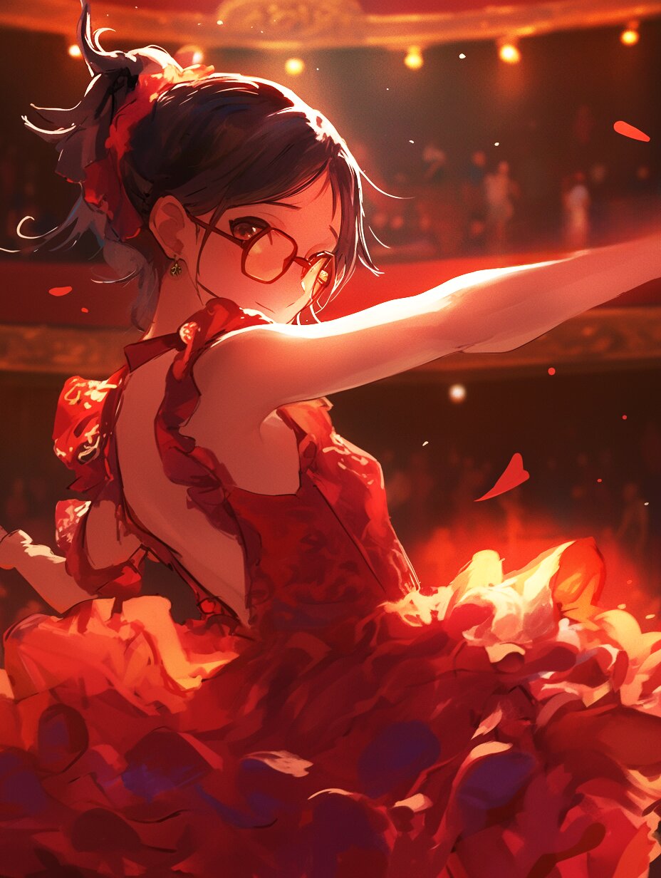 Pull-back view, anime-style, 20-year-old woman, black hair, ponytail, red-rimmed glasses, red flamenco dress, castanet in left hand, theater in background. Dancing flamenco under spotlight.