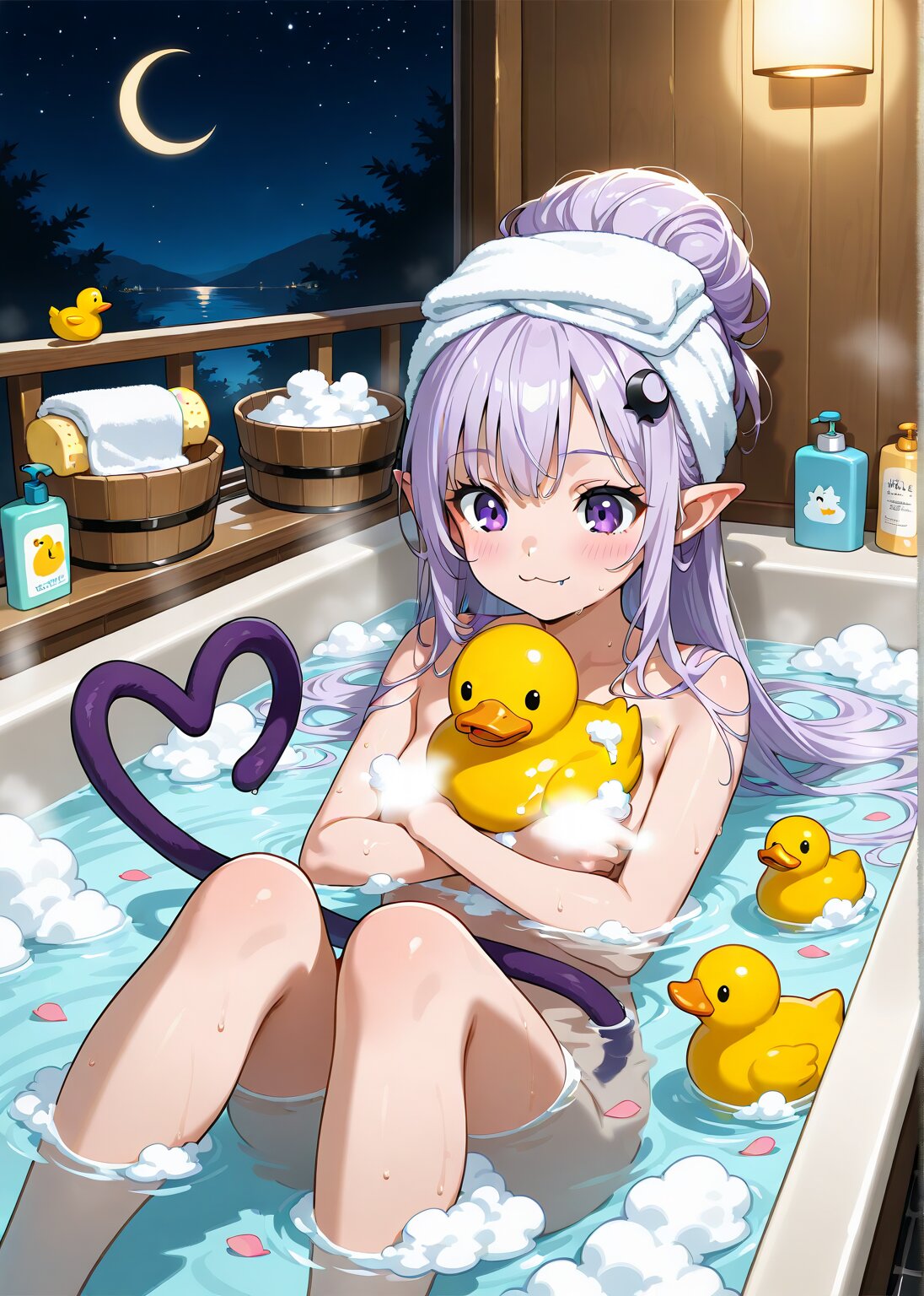 "1girl, :3, afloat, animal, , bath, bathing, bathroom, bathtub, bird, , , blush, bubble, bucket, chick, closed mouth, convenient censoring, crescent moon, duck, foam, hair bun, hair up, knees up, mixed bathing, monkey, , night, nude, onsen, partially submerged, partially underwater shot, petals on liquid, , rubber duck, shared bathing, sitting, smile, soaking feet, soap, soap bubbles, solo, sponge, star \(sky\), starry sky, steam, steam censor, tied hair, tiles, towel, towel on head, toy, water, wet, wet hair, object hug, " "straight hair, medium bangs, naturally flowing hair, left bat hair ornament, Light purple hair, very long hair, purple eyes, pointy ears, fangs, , , small breasts, purple devil's tail, heart tail, "