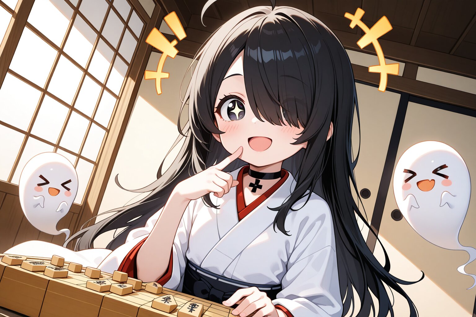 1 little girl, solo, diagonal angle, upper body, masterpiece, best quality, amazing quality, very aesthetic, black hair, long hair, ahoge, (hair over one eye:1.2), black eyes, +_+, open mouth, smile, cheerful, +++, notice lines, choker, white kimono, playing a shogi, finger to mouth, ghost, > <, in japanese room,
