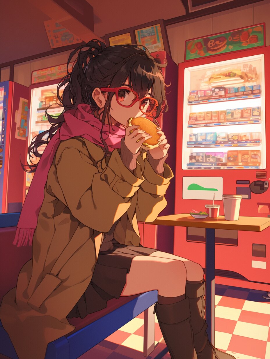 Anime style, 20 year old female, black hair, ponytail, red rimmed glasses, pink scarf, caramel colored coat, off black boots. The background is the interior of a drive-in. Surrounded by video game cabinets and vending machines selling hamburgers and cup ramen, lined up against the wall, she is eating hot sandwich toast at a table.