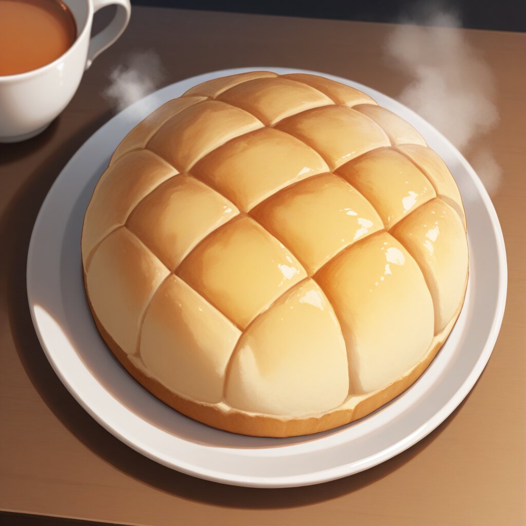 masterpiece,best quality,newest,absurdres,highres,very awa,general,realistic,hot melon bread on plate,steam,hot tea,no humans,