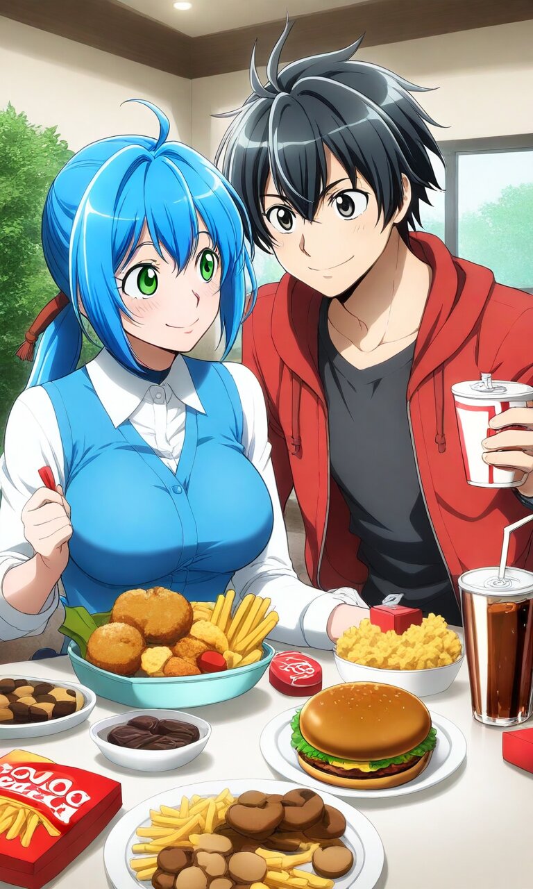 Couple, boy and girl, two people only,absurdres, ultra-detailed, master piece, high resolution, 8k, boy, girl, couple, Valentine's Day, date, food court, hamburger, French fries, fried chicken, cola, cider, chocolate cookie, smile, happy, flirting BREAK the boy(original boy,black hair,short hair, black eyes) BREAK the girl(,akitsu akane, blue hair, green eyes, pony tail, large breasts,, )