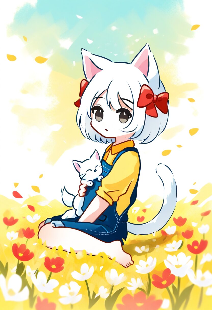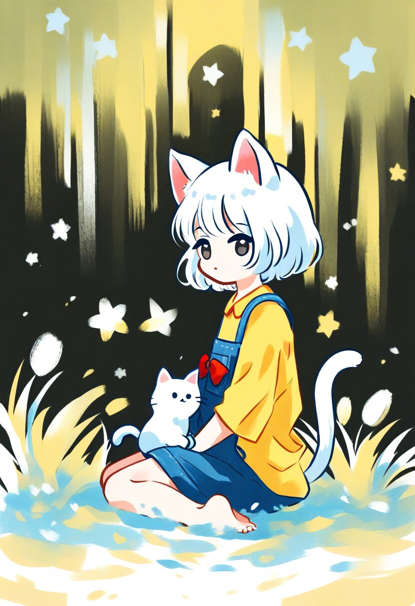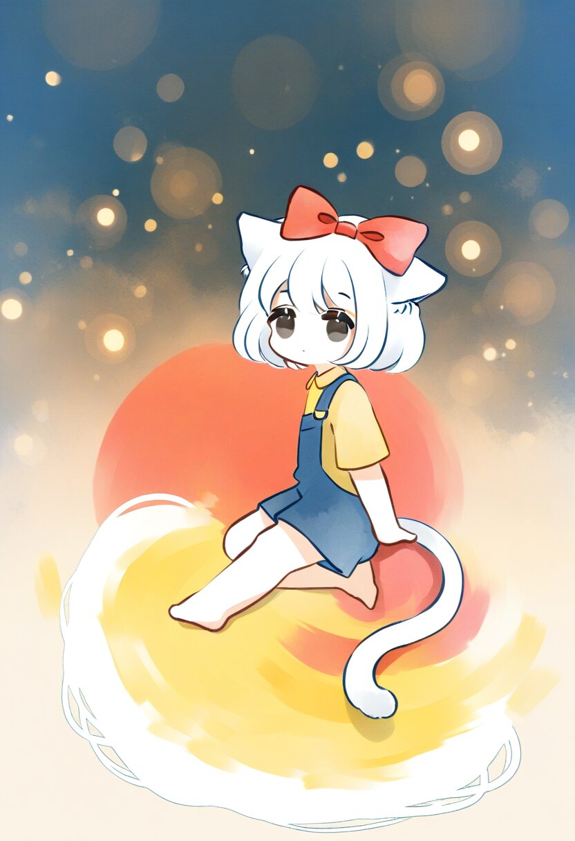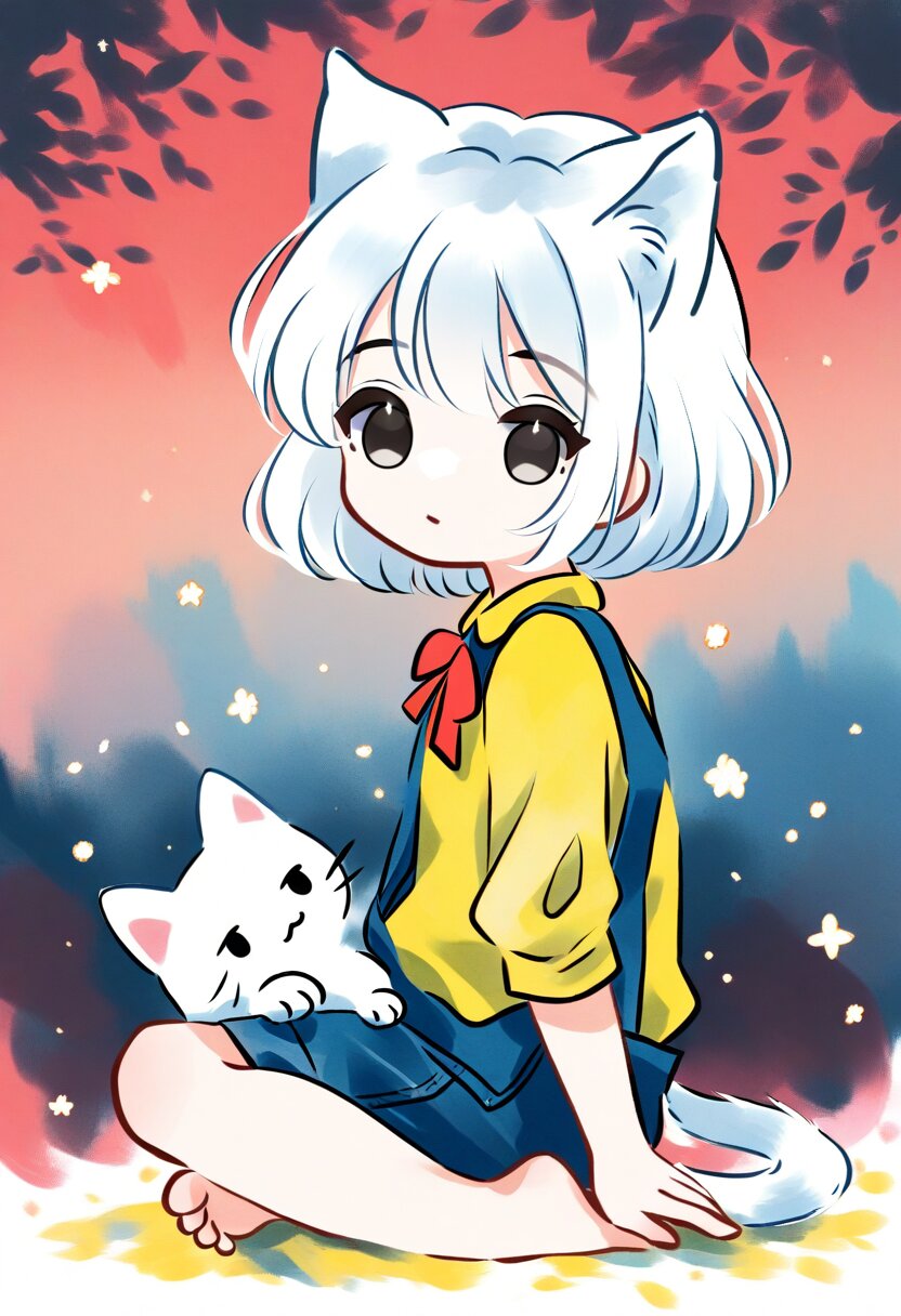 <lora:inmnsylexl4:1>best quality, masterpiece, very aesthetic, watercolor painting, pastelcolors, 1girl, chibi, cat ears with red bow, cat tail, black eyes, yellow shirt, blue overall, barefoot, sitting, from side, looking at viewer, white cat