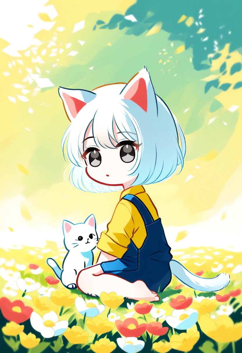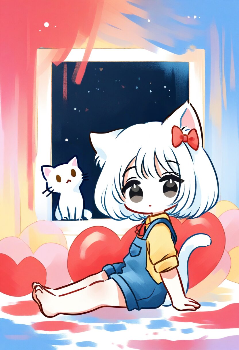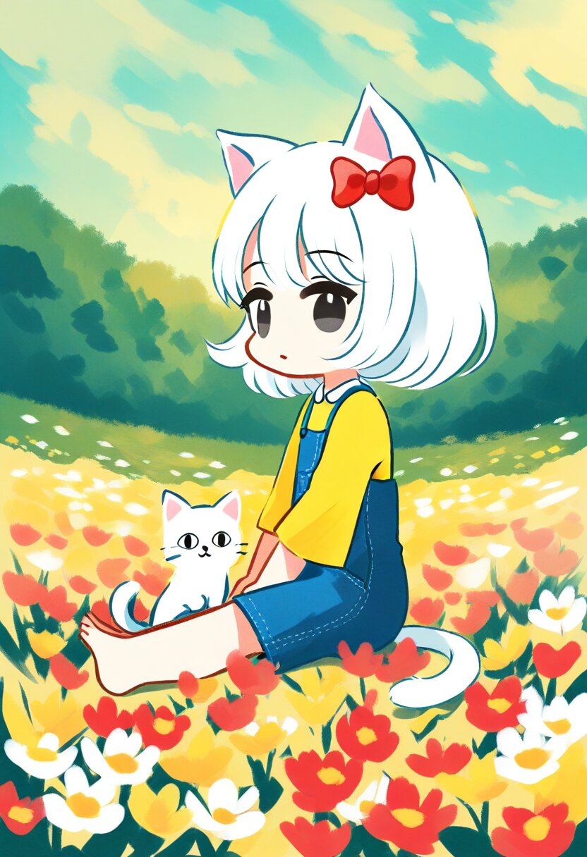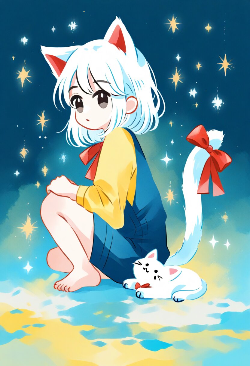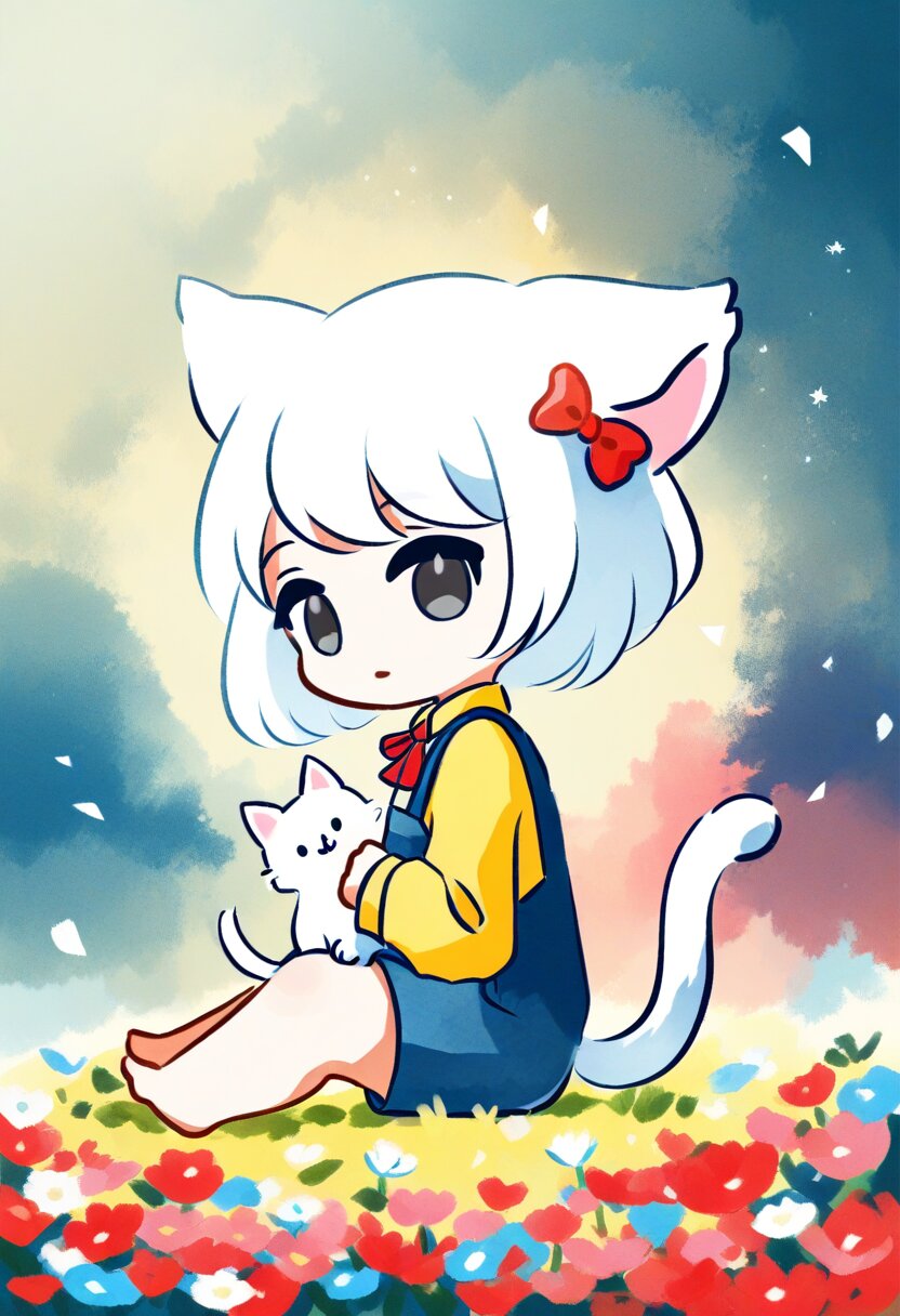 <lora:inmnsylexl4:1>best quality, masterpiece, very aesthetic, watercolor painting, pastelcolors, 1girl, chibi, cat ears with red bow, cat tail, black eyes, yellow shirt, blue overall, barefoot, sitting, from side, looking at viewer, white cat