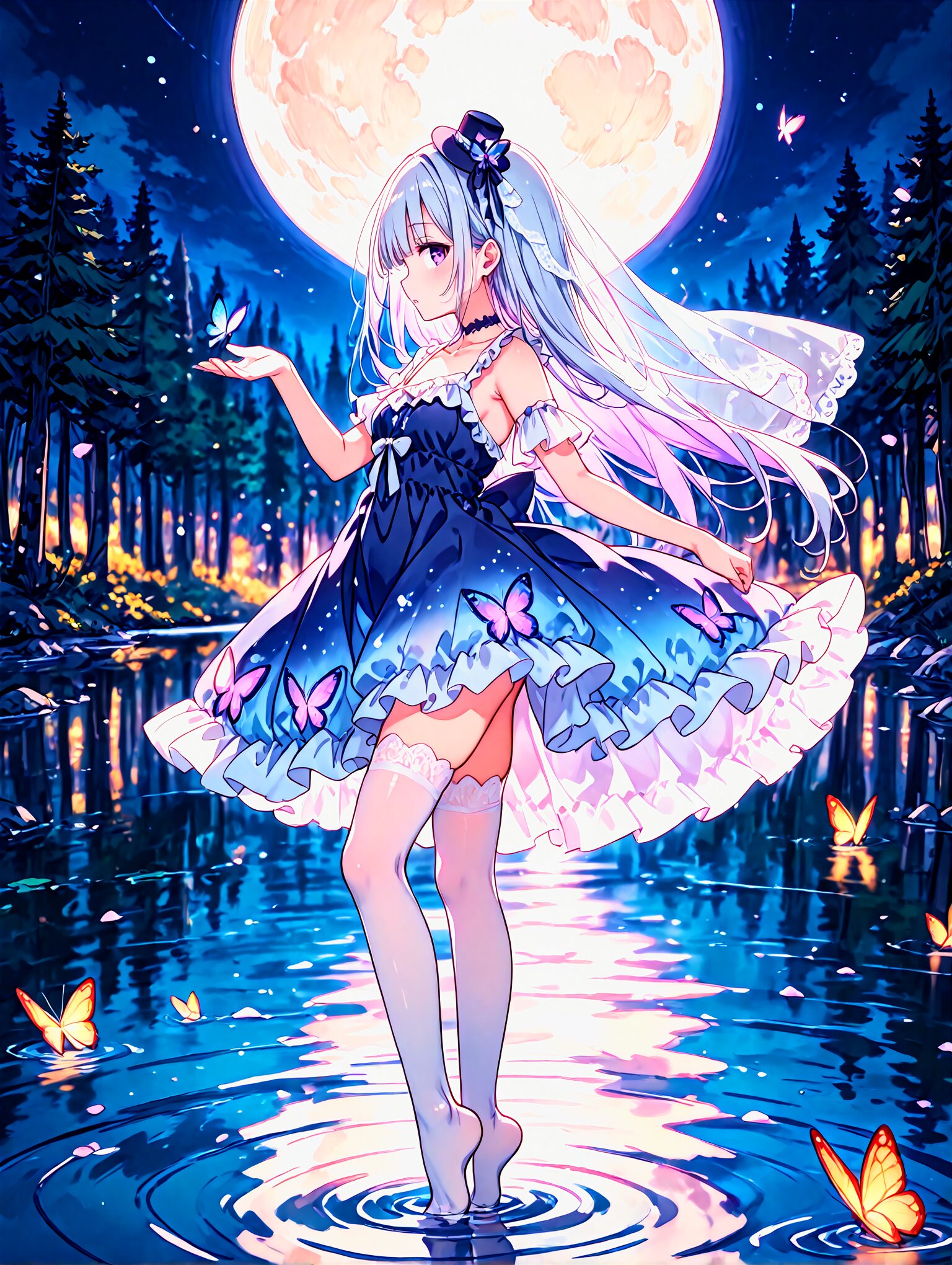 beautiful detailed background, best quality,best quality, pale color . water color, (pastel colors,:0.8), depth of field, blurry background, scenery, detailed, intricate (full body:0.9), portrait, night sky, full moon, collarbone, parted lips,(Expressionless:0.8), big eyes,half-closed eyes, tareme, pale purple eyes, thighhighs, (silver hair:1.1), (dark blue hair colored inner hair:0.8), long hair,very long hair, eyebrows visible through hair, (white and dark blue dress ,:1.1) see-through veil, mini hat, blue strapping ribbon and bow, frills, choker,round lighting, temptation, crystal, water ripples, (dancing:1.1), fairy dance,see-through, lake,forest, butterfly,bubble, (outstretched hand:0.7),contrapposto,left legs,one hand up, outdoors, make a bow, from side,(profile:1.1), looking at viewer, <lora:sdxl2-flat2-512b:-1.3> <lora:noline-16oa:-1.2> <lora:see-through_paru:-1.0>