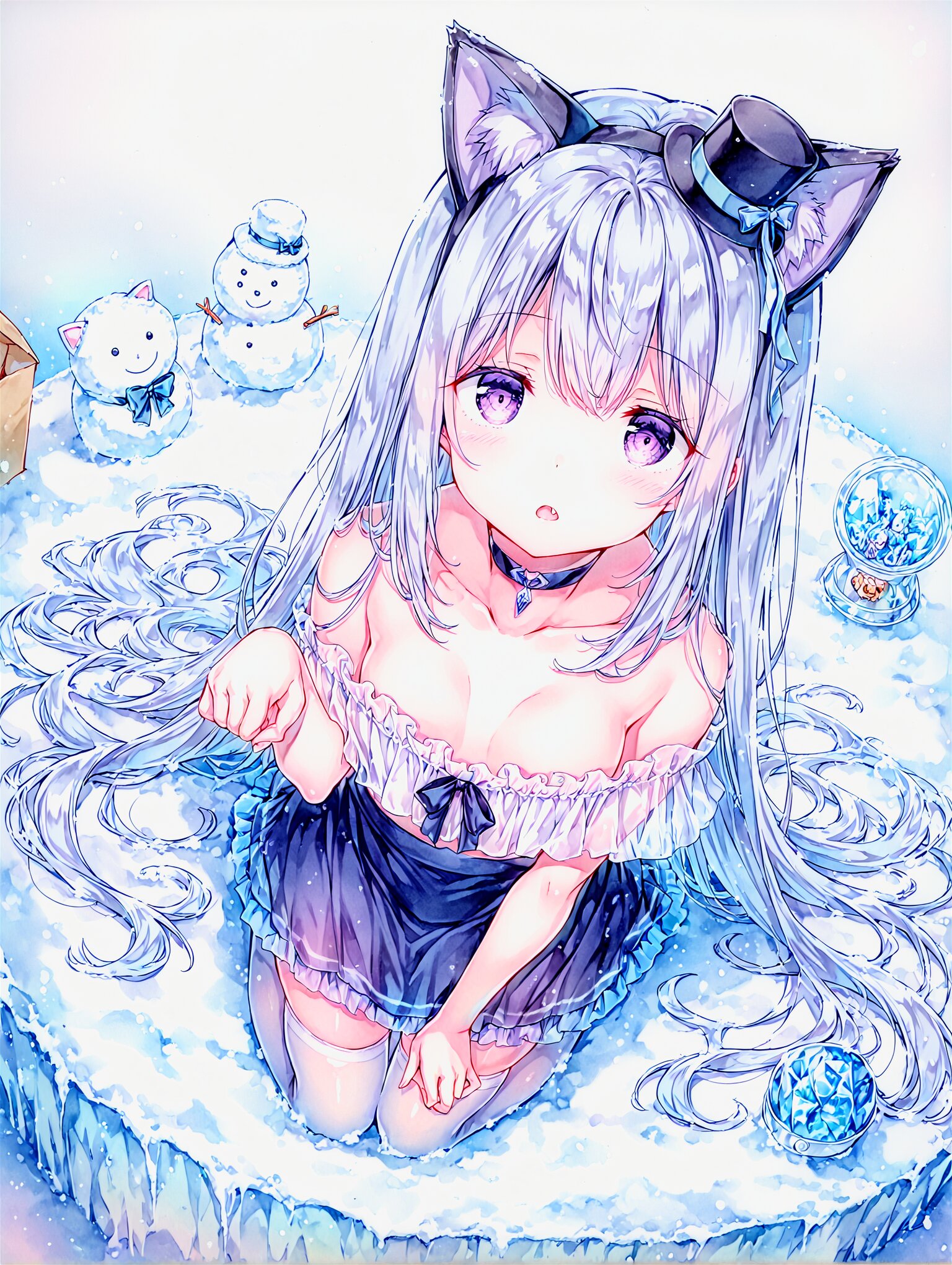 best quality,pale color, (watercolor pencil \(medium\),:0.8) clarity, (pastel colors,:0.9), collarbone, parted lips,(Expressionless:0.8), big eyes,half-closed eyes, tareme, pale purple eyes, (silver hair:1.1), (dark blue hair colored inner hair:0.8), long hair,very long hair eyebrows visible through hair, (white off-shoulder and dark blue skirt,:1.1) see-through veil, mini hat, blue strapping ribbon and bow, frills, strapping ribbon,skindentation,thighhighs, choker, round lighting, temptation, crystal, ice block, cat snowman, looking at viewer, (cat stuffed toy:0.9), cardboard box, purple eyes, fake cat ears, fang, kneeling, from above, dutch angle, pov, paw pose, one hand up, snow globe, snow field, <lora:sdxl2-flat2-512b:-0.5> <lora:noline-16oa:-0.5>