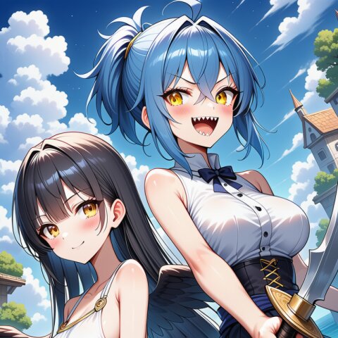 rating:sensitive, {ai-generated}, ai-assisted, {{{Japanese anime coloring}}}, {{year 2024}},2girls,side by side,looking at each other,midday,{in sunny park},dynamic angle, masterpiece, best quality, ultra detailed, perfect fingers, high resolution, absurdres, perfect anotomy, detailed background, unity 8k wallpaper