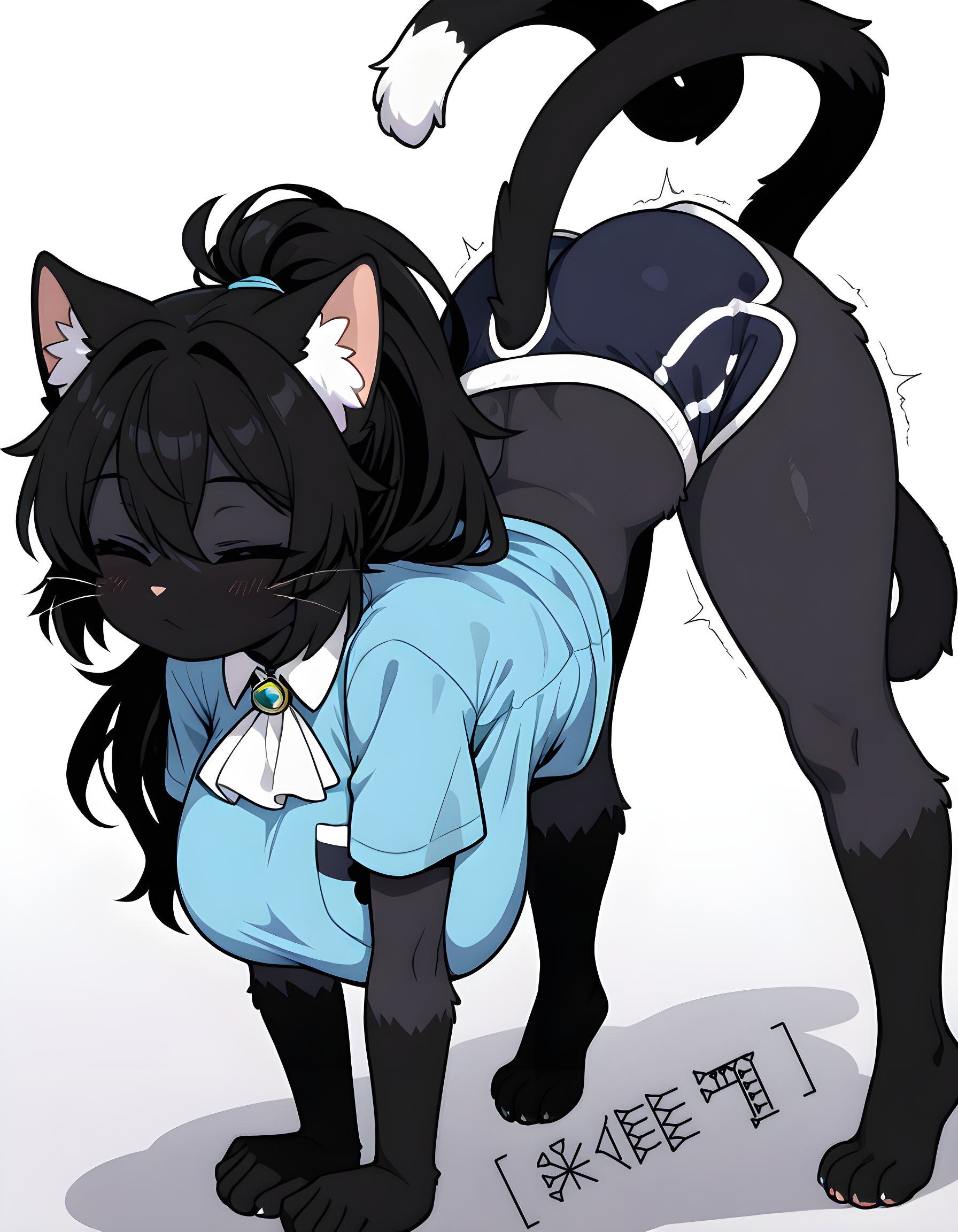 beautiful face,oppai loli,(nekomata),(furry female),(cat girl),loli,(black cat),big breasts,slim,narrow waist,black cat ears fluff,(fluffy body),black cat face,black fur,cat white whiskers,cat eyes,eyes closed,hair between eyes,black hair,ponytail,black cat hands,cat mouth,whisker pad,cat pointy nose,black cat tail,forked tail,indigo polo shirt,breast pocket,white ascot,white dolphin shorts,expressionless,unemotional,trembling,white background,from front,closed mouth,cat stretch,on all fours,arms extended in front,top down bottom up,invisible floor,looking away,from side,(stylized),(kawaii),(anime coloring),(cute),((hands_focus, perfect_hands:1.5)),furry,(two tone fur),(furry body),perfect body,detailed face,visible wide hips,high quality,cute clothes,animal tail,animal ears,solo,big breasts,voluminous thighs,masterpiece,seductive mischievous expression,eductive demeanor,gddw,((correct_anatomy)),flat color