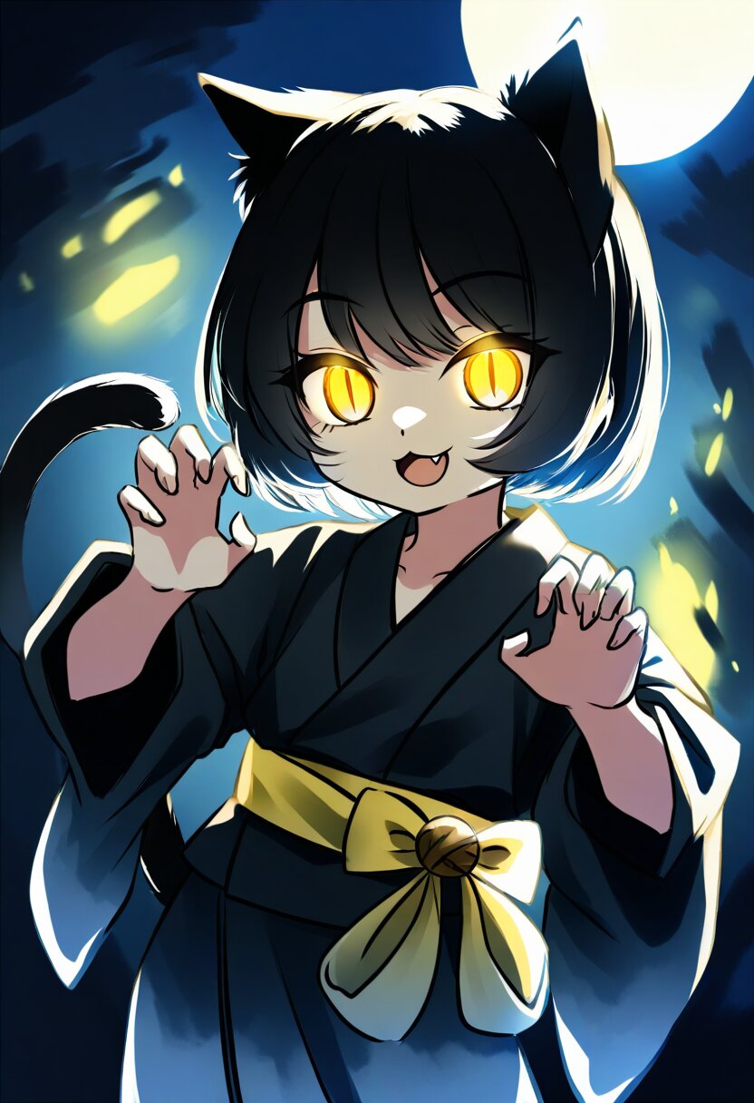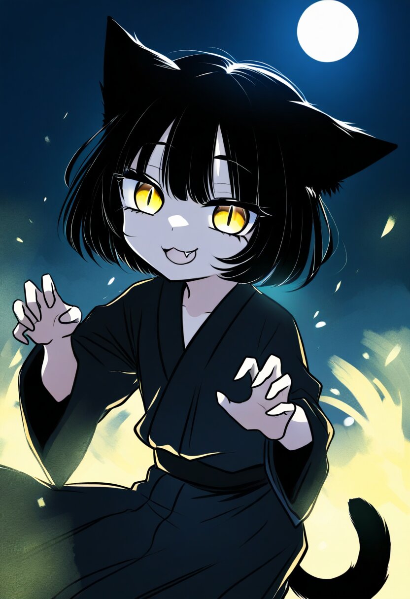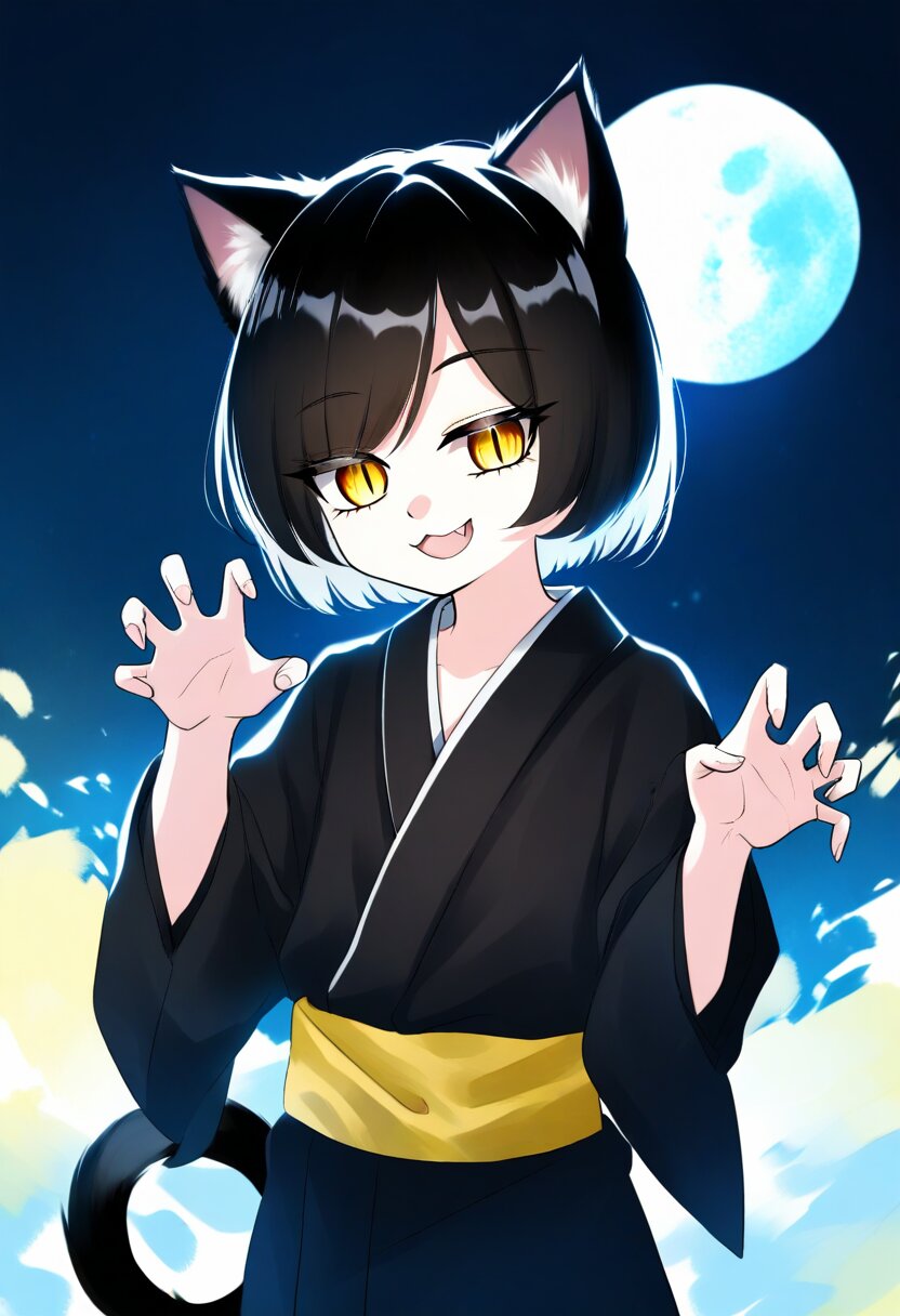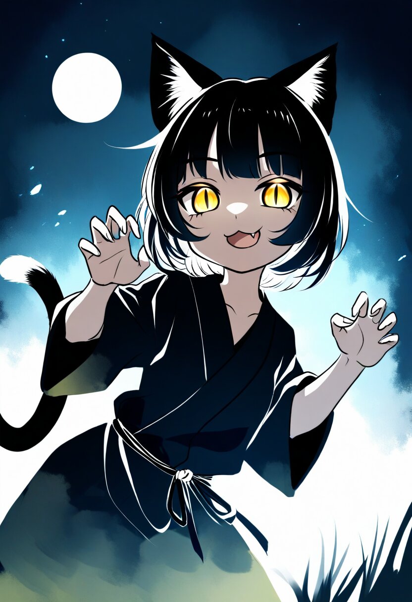 <lora:inmnsylexl4:1>best quality, masterpiece, very aesthetic, general, watercolor painting, 1girl, 10 years old, cat ears, two cat tails, black hair, short hair, black kimono, slit pupils, yellow eyes, glowing eyes, large eyes, claw pose, smug, fang, night, full moon
