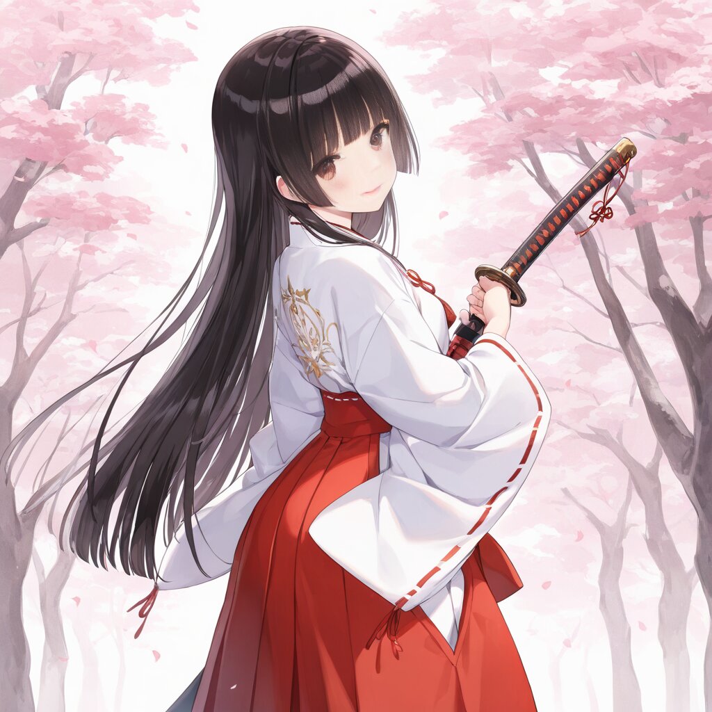 (best quality, high resolution:1.2), (solo:1.2), miko attire, red hakama, miko attire with long hem and length, katana, Japanese sword, decorated knife, smile, closed mouth, pink lipstick, blush,embroidery, cherry blossom, standing, turning around, blunt bangs, blunt cut back hair, straight hair, very long hair