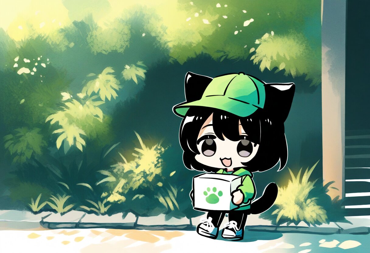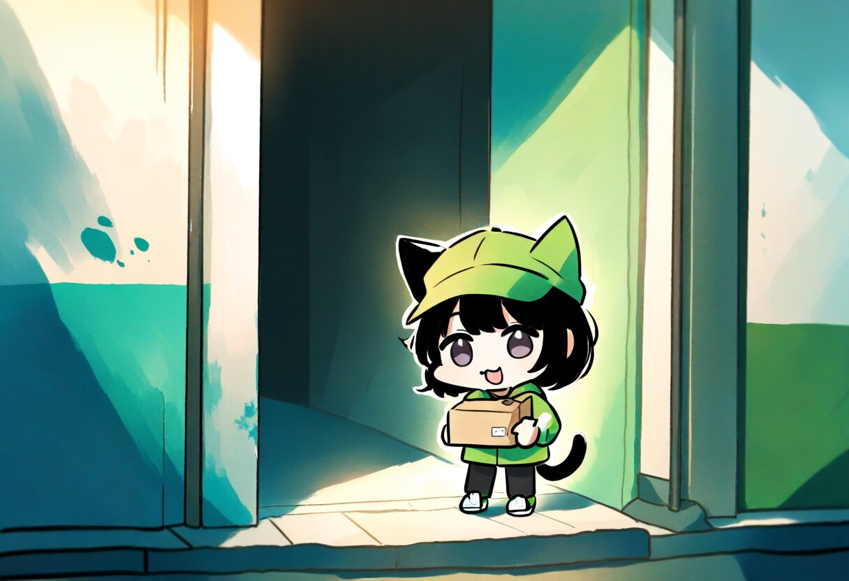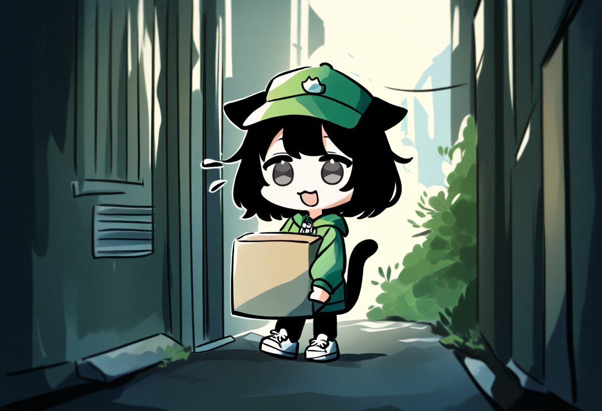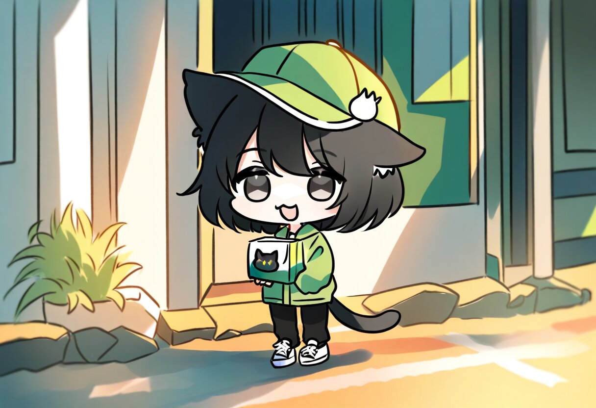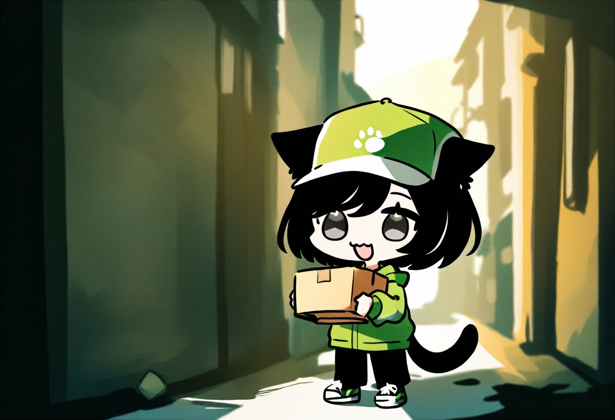 <lora:inmnsylexl4:1>best quality, masterpiece, very aesthetic, watercolor painting, 1girl, solo, chibi, cat ears, cat tail, :3, smile, open mouth, short hair, black hair, black eyes, green cap, holding cardboard box, green jacket, black pants, white sneaker, waking, street, black cat