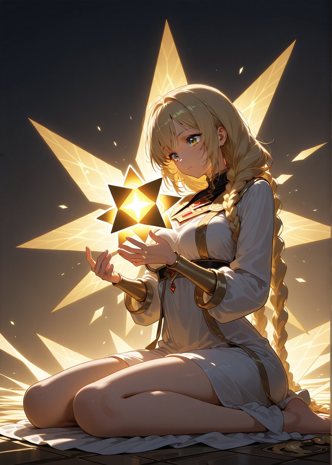 shining, glowing, 1girl, solo, upper body, wariza, sitting, The hair is carefully braided or twisted before being secured into these unique looped shapes,