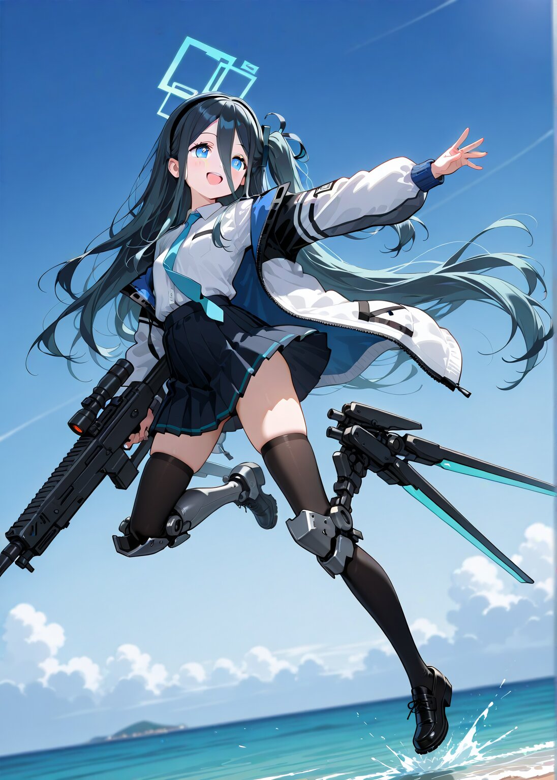 Tendou Aris, blue archive, aris-default,aris \(blue archive\),blue eyes,one side up,absurdly long hair,hair hair between eyes,black hairband,halo,white jacket,necktie,pleated skirt,black socks,sneakers, armed, , armor, armored boots, , , , , mecha musume, mechanical wings, open mouth, , , , thighhighs, , , weapon,