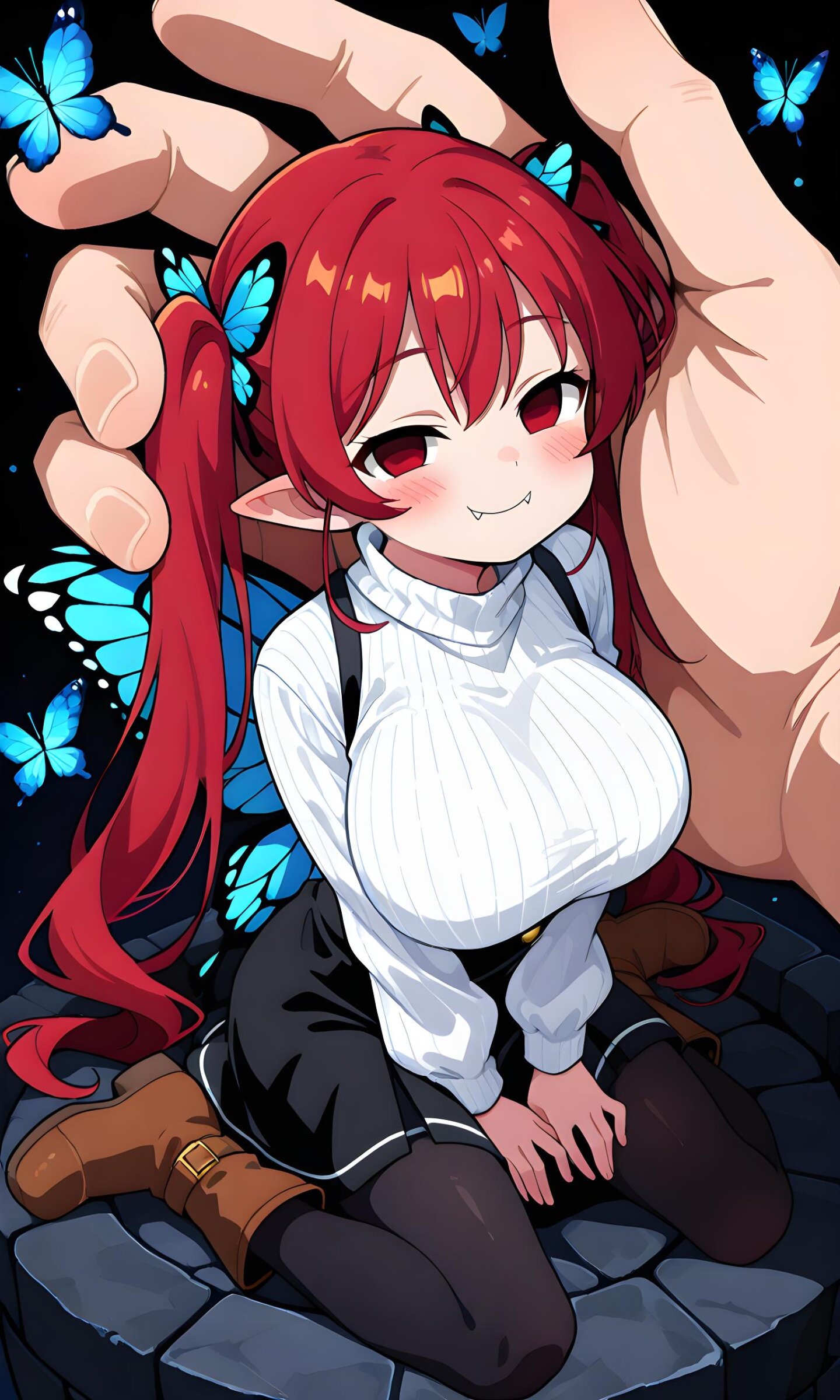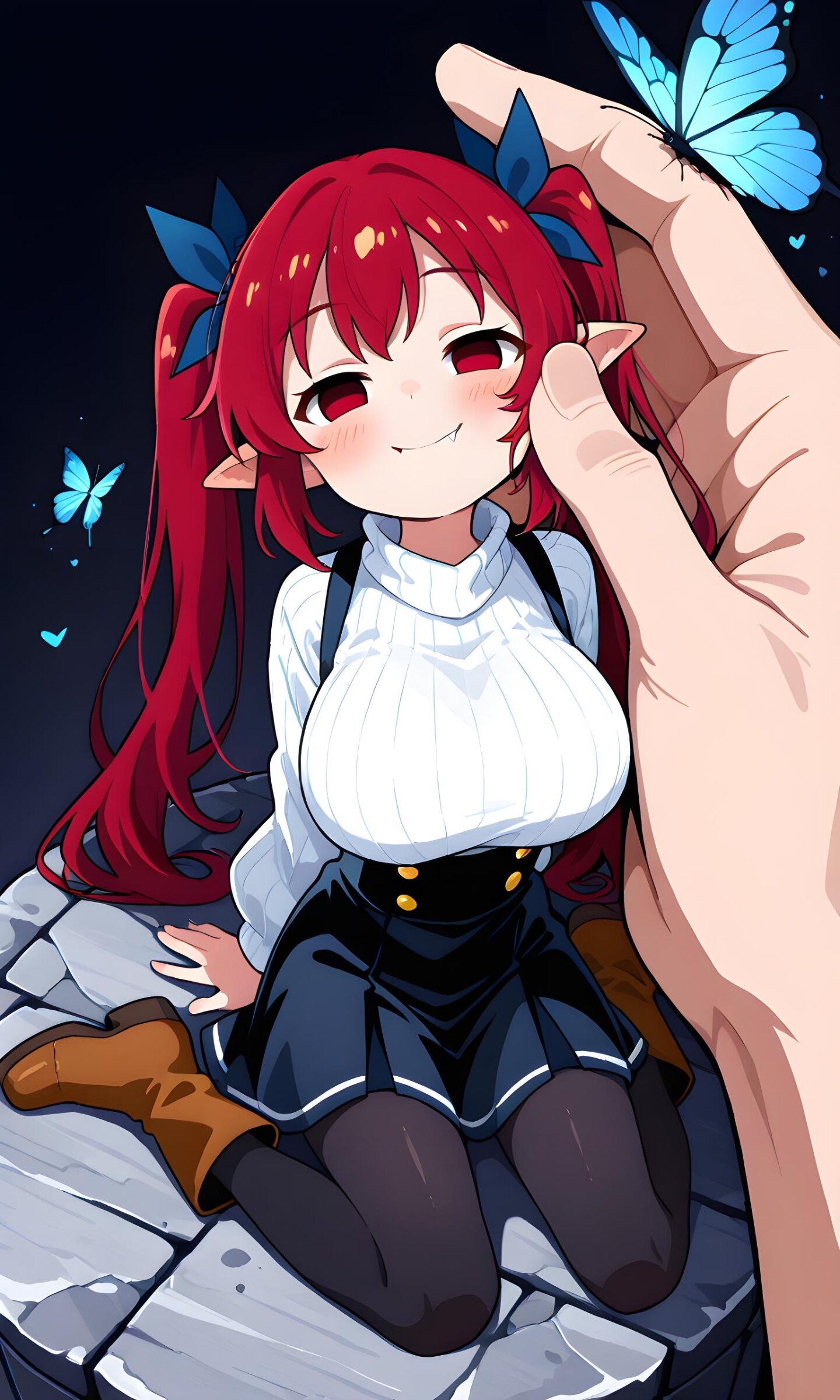 Yandere,elfin,mini person,minigirl,(oppai loli),10 years old,huge breasts,well-groomed hair,long hair,red hair,pigtails,pointy ears,red eyes,empty eyes,half-closed eyes,smile,blush,spreading a blue butterfly wings behind back,white knit-sweater,black high-waist skirt,suspender skirt,black pantyhose,brown boots,fangs,closed mouth,wariza,steepled fingers,floating hearts,in palm,pov finger on her cheek,black background,gradient shadow,size difference,from above,pov hands,(stylized),(kawaii),(softy illustration),(2.5D),(cute), ((hands_focus, perfect_hands:1.5)),gddw,((correct_anatomy)),no lines, simple style, vibrant colors, good light, paint style