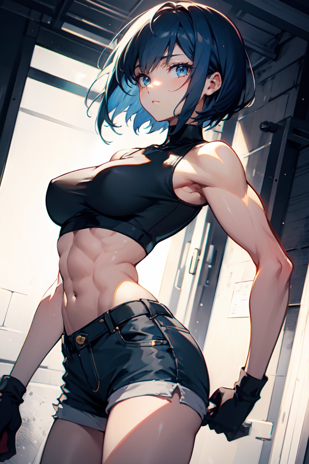 absurdres,detailed and intricate, (best quality), BREAK,solo,1girl,muscular, BREAK,blue hair,extra short hair, BREAK,crop top,low-leg shorts, BREAK,(dynamic Angle:1.2),