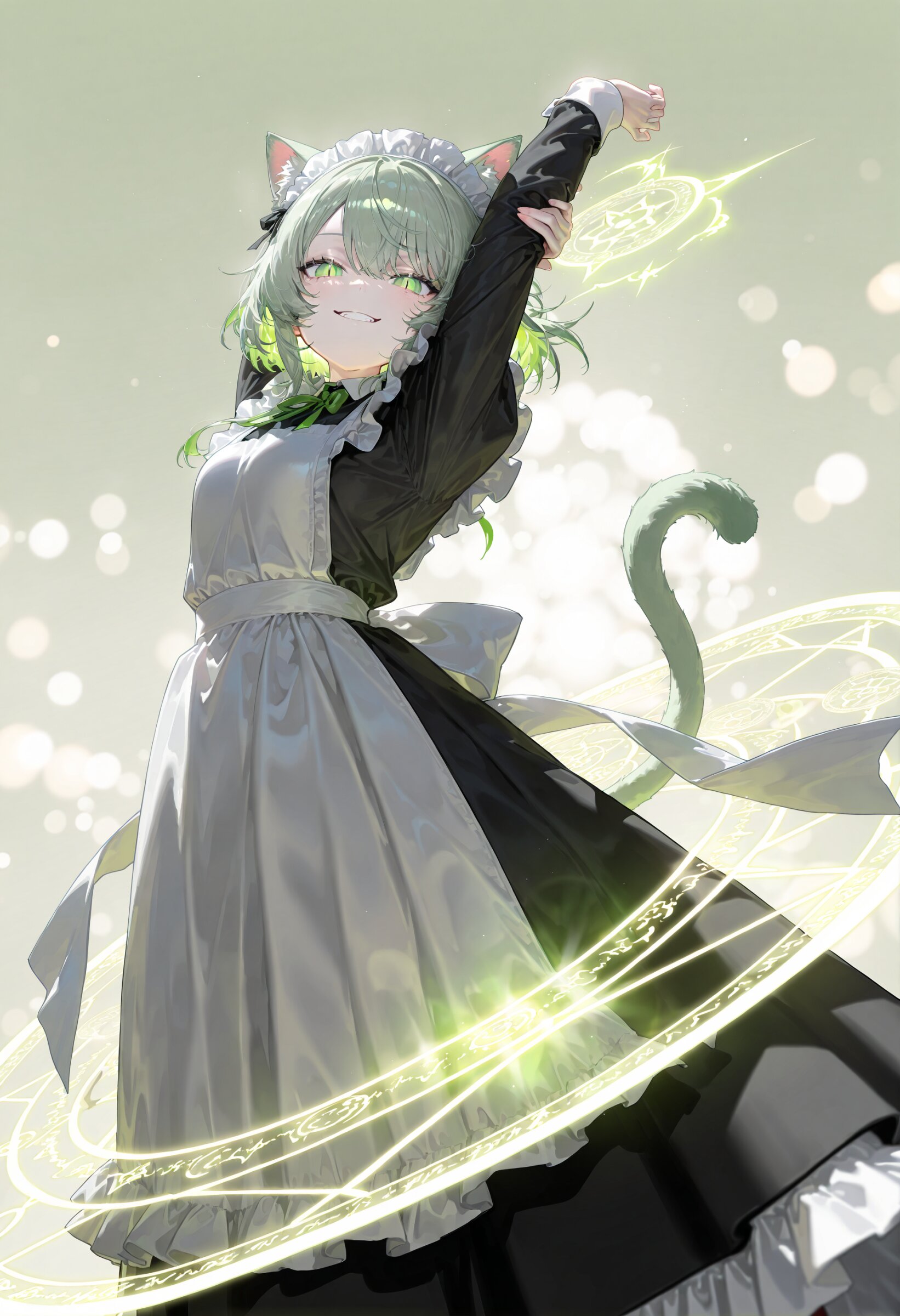 (face:1.2) from below, looking down (absurdres absolutely resolution:1.2),texture, official art, ultra detailed, unity 8k wallpaper, dark theme, (simple green beige background:1.2), 1girl, (ultra-detailed), solo, maid, pale skin, pale green beige hair, (beautiful slit pupils, naughty face:1.0), long sleeves classic maid uniform, long skirt, maid headdress, maid apron, luminous effect lens flare lotion shiny-glistening cute girl solo ,pinhole lens, (cat girl, cat ears, cat tail, slit pupils, stretching:1.1), (ultra detailed floating glowing magic circle:1.2), (high saturation) depth of field, bokeh, super fine concept art, hard surface, 8K, unreal engine, masterpiece, best quality, amazing quality, very aesthetic, absurdres, you can add scenery, (volumetric lighting), To make the background more distinctive. professional art lots of details, , overexposure, shiny-glistening, (watercolor style:1.0), (pastel color style:1.0) <lora:noline (1):-0.5> <lora:sdxl2-flat2-512b:-0.5> <lora:facelightup_xl_v10:0.5>