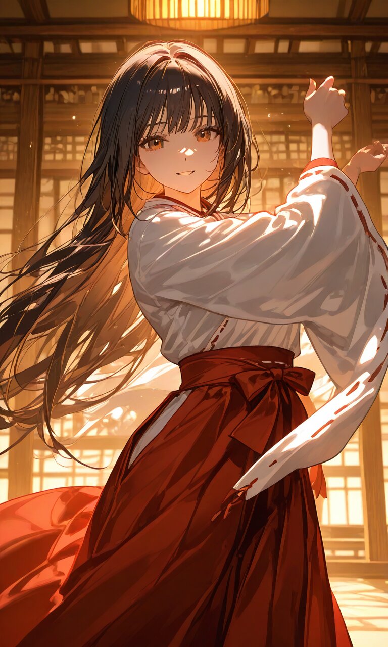 1 lady, long hair, black hair, ((miko, dancing, shirine)),cowboy shot, Japanese shrine,
