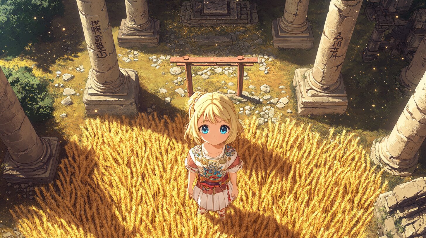 このイラストは「日本×ローマ」の融合をテーマに描きました。特にポンペイ遺跡を意識し、古代の栄華と儚さを表現しています。黄金色の麦畑に佇む少女が見上げる先には、時を超えて残る遺跡の柱。もしかしたら、この次の瞬間、大噴火が訪れるかもしれない——そんな自然の脅威と隣り合わせの刹那的な時間の中で、私たちは生きているのだという思いを込めました。過去と未来が交錯するこの風景から、どんな物語を感じるでしょうか?