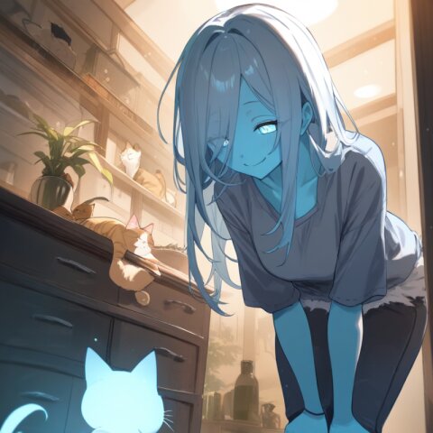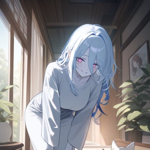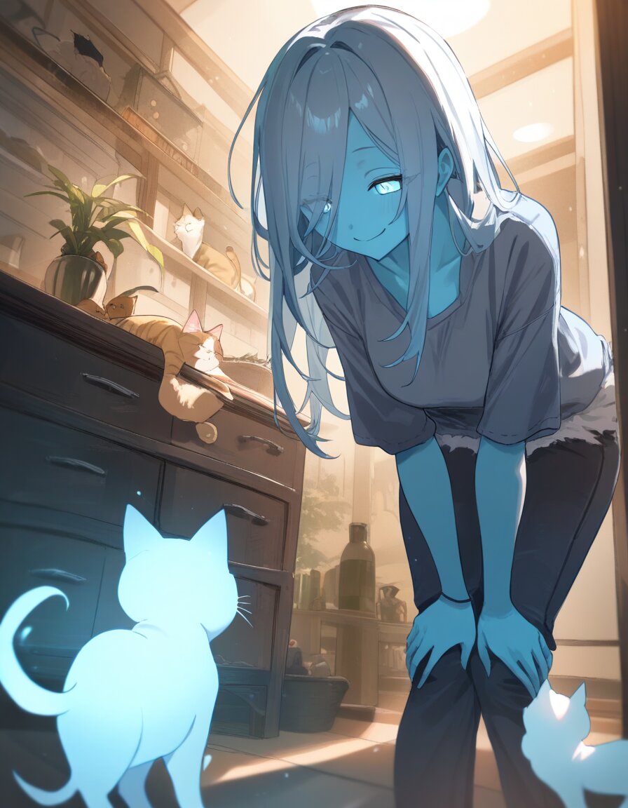 ghost girl, smile, indoor, leaning forward, hands on own knees, cat, masterpiece, high score, great score, absurdre