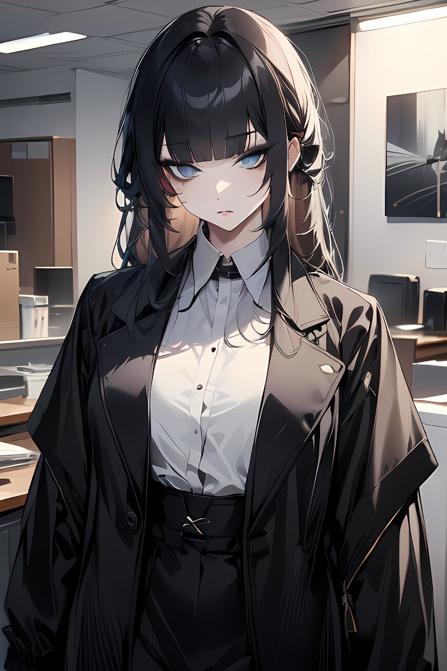 1 lady, long hair, black hair, blunt bangs, ,((eye shadow)), (black jacket, white shirt, office cloth, tired), cowboy shot, Art Style 2.0