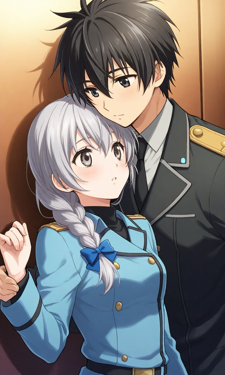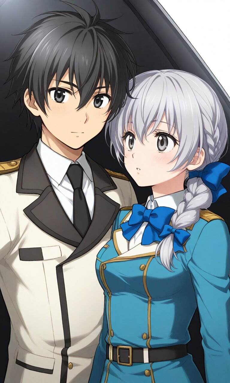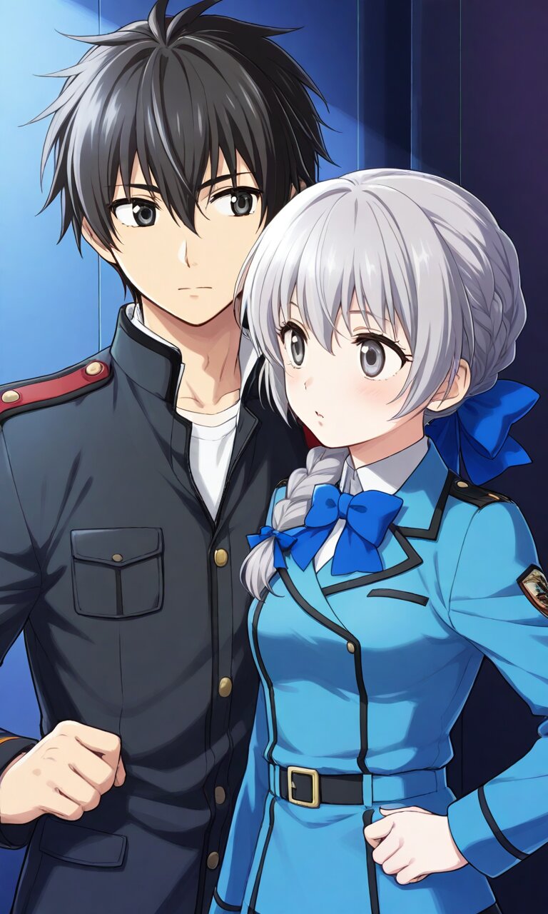 Couple, boy and girl, two people only,absurdres, ultra-detailed, master piece, high resolution, 8k, Boy, girl, couple, inside a submarine, karaoke contest, in military uniform BREAK the boy(original boy,black hair,short hair, black eyes) BREAK the girl( telethacapn, grey hair, braid, hair bow, grey eyes, braided ponytail, blue bow, hair over shoulder, ),,