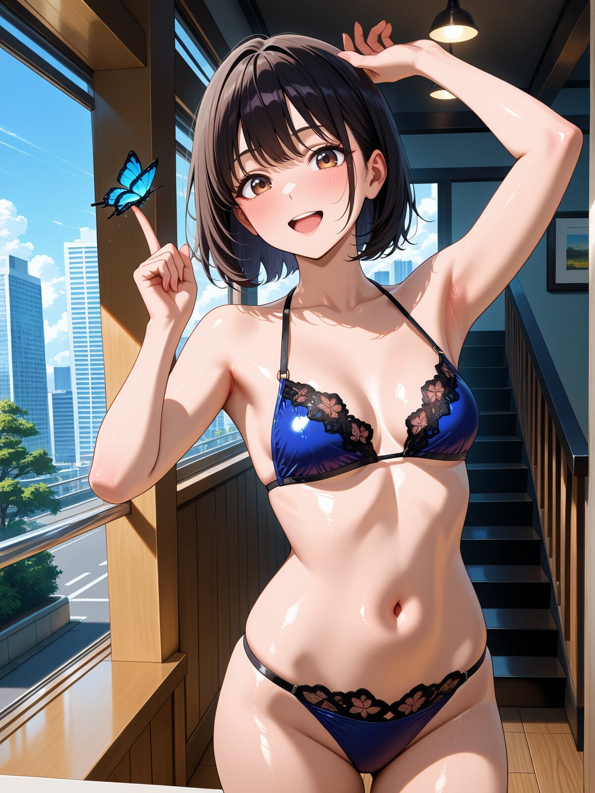 score_9, score_8_up, score_7_up, score_6_up, score_5_up, score_4_up, source_anime,rating_explicit,masterpiece,best quality,amazing quality,very aesthetic,anime coloring,absurdres,newest, BREAK, 1girl,beautiful woman,29-year-old woman,cute,kawaii, beautiful hair,black hair,short hair,straight hair,bangs,brown eyes, small medium breasts,curvy,shiny skin,gleaming skin, (embarrassed:0.5),(guilt,blush:0.3),(smile:0.2), BREAK, Random angle,dynamic angle, restaurant,window,wooden floor,lights,cityscape,plant,road,skyscraper,stairs,street,