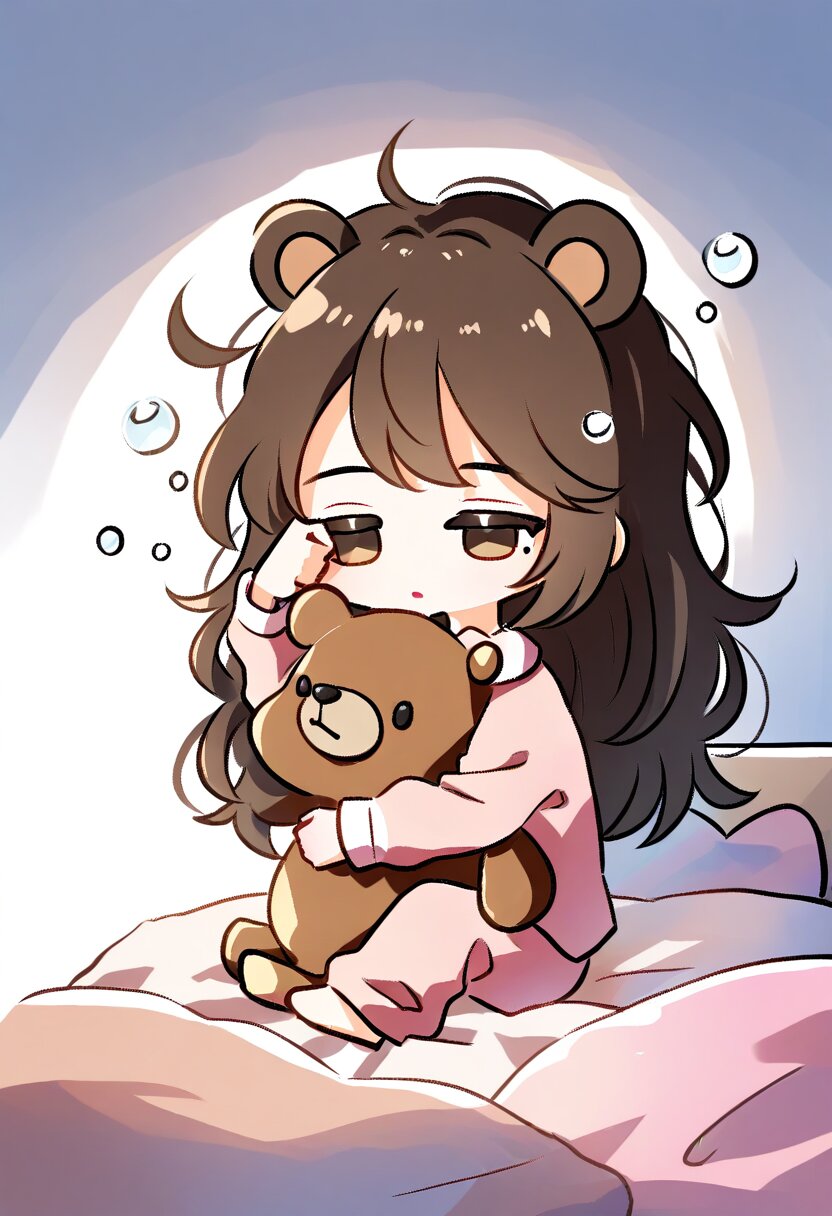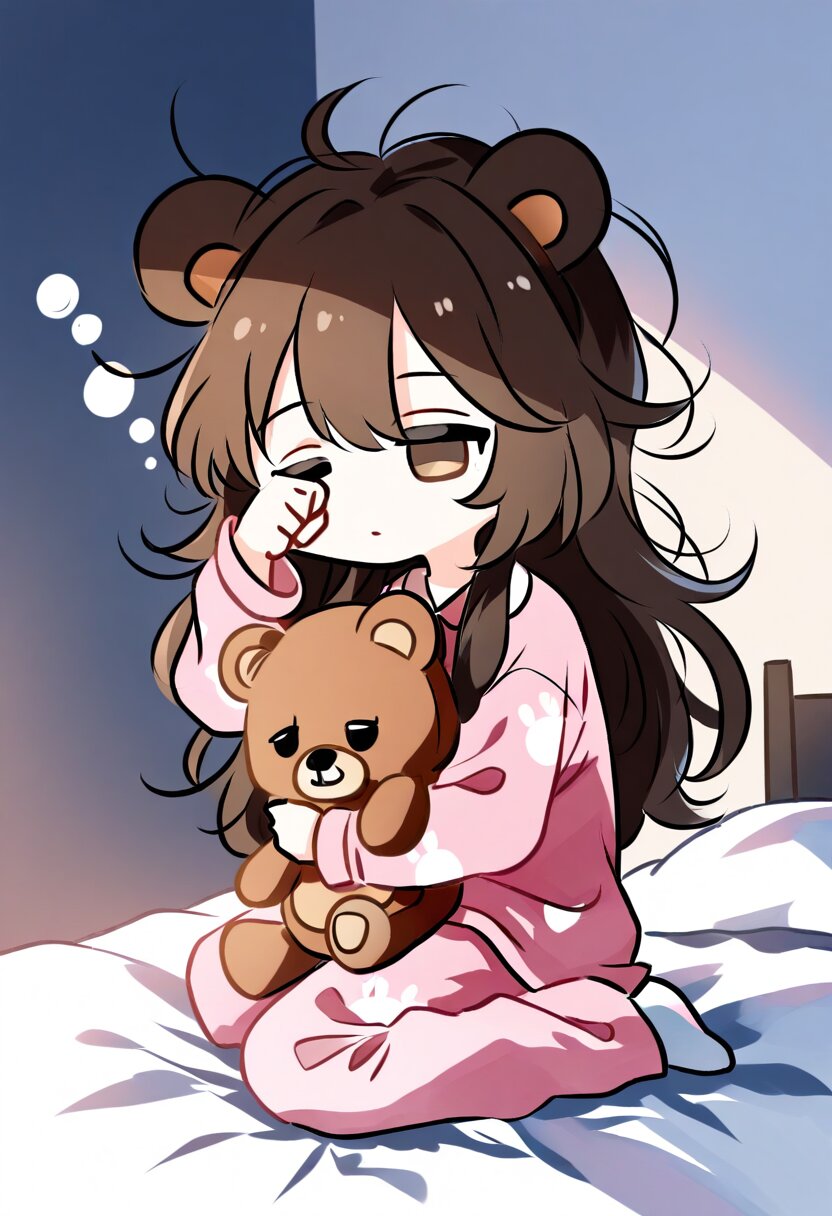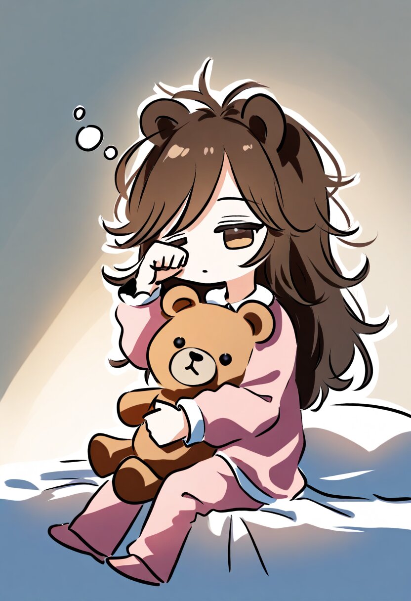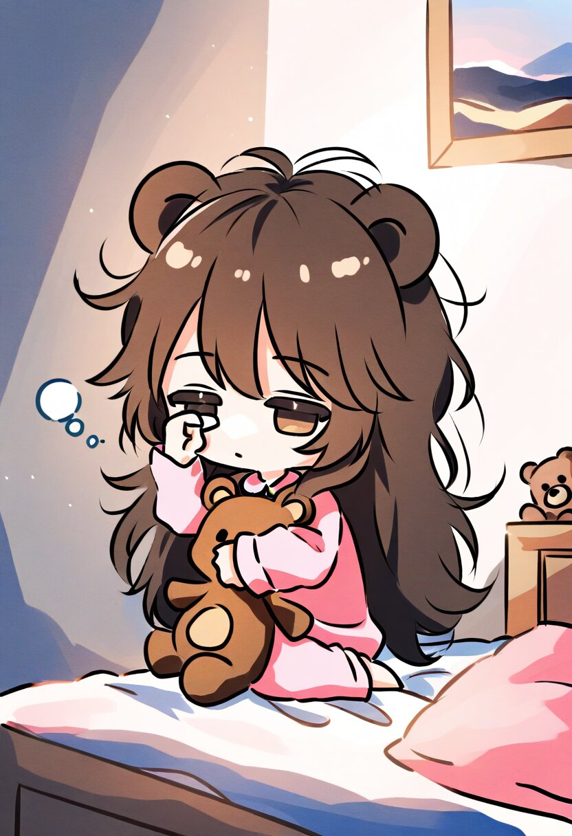<lora:inmnsylexl4:1>best quality, masterpiece, very aesthetic, general, watercolor painting, chibi, solo, 1girl, bear ears, brown hair, long hair, messy hair, brown eyes, half closed eyes, rubbing eye, pink longsleeves pajamas, hugging teddybear, squeans, bed, room, sitting