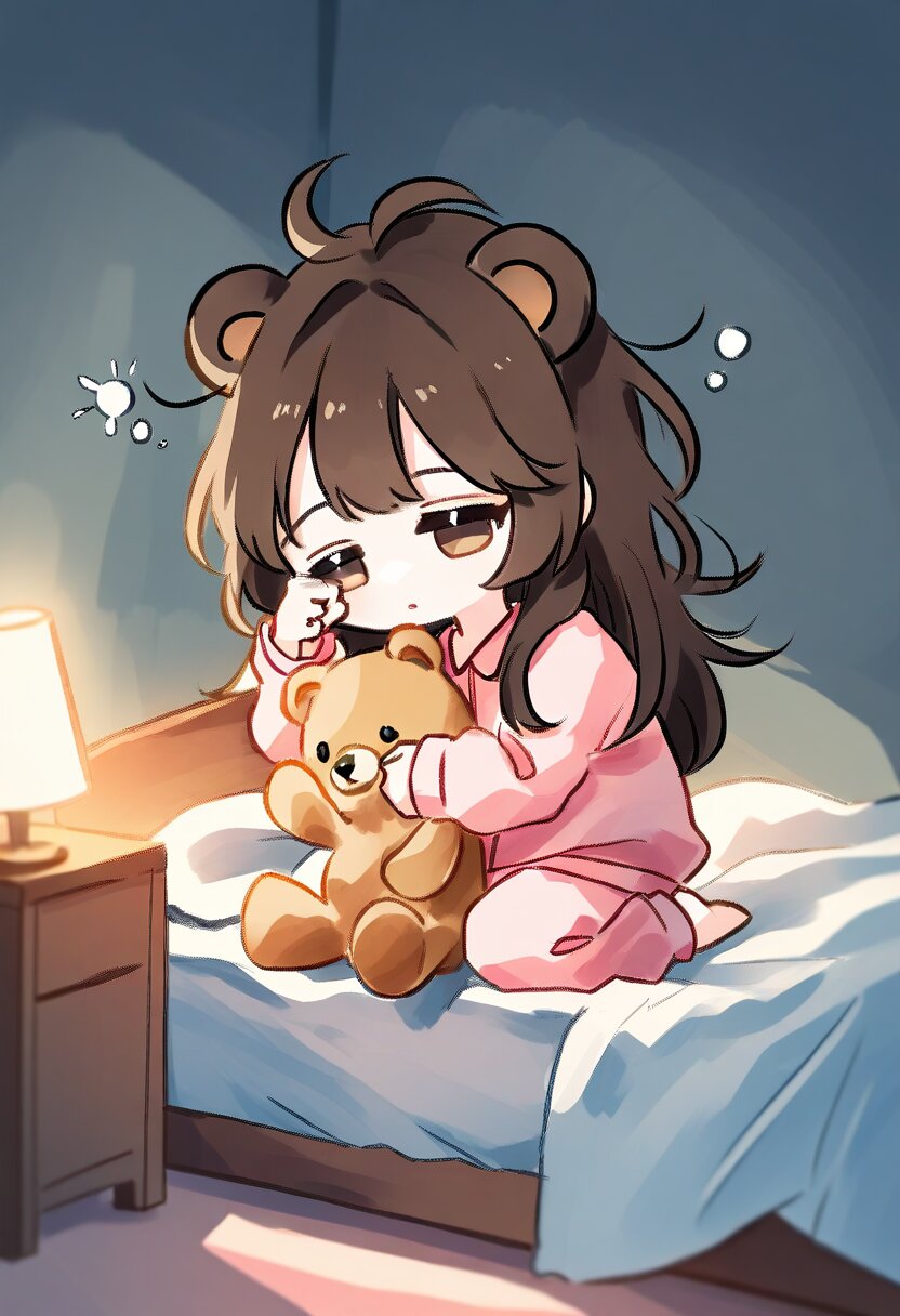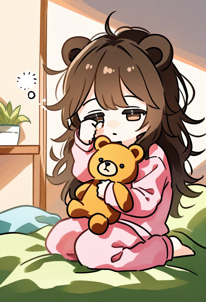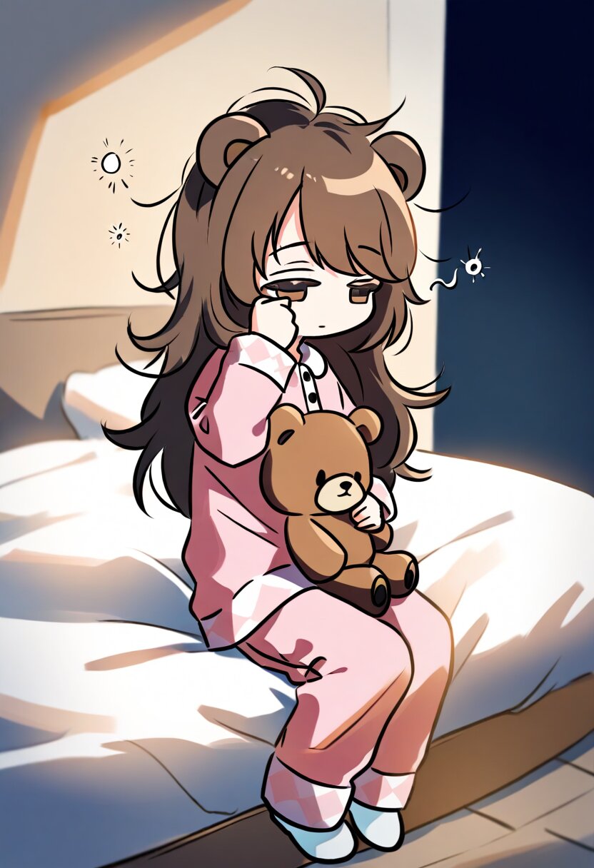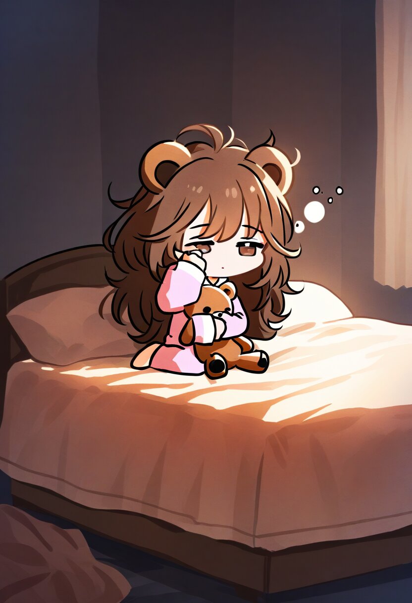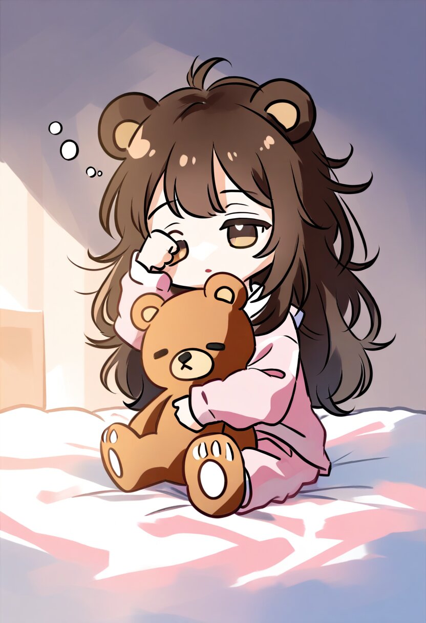 <lora:inmnsylexl4:1>best quality, masterpiece, very aesthetic, general, watercolor painting, chibi, solo, 1girl, bear ears, brown hair, long hair, messy hair, brown eyes, half closed eyes, rubbing eye, pink longsleeves pajamas, hugging teddybear, squeans, bed, room, sitting