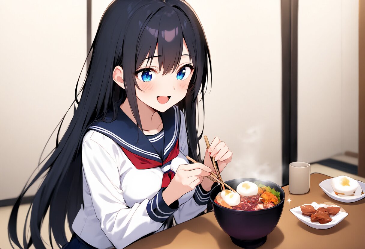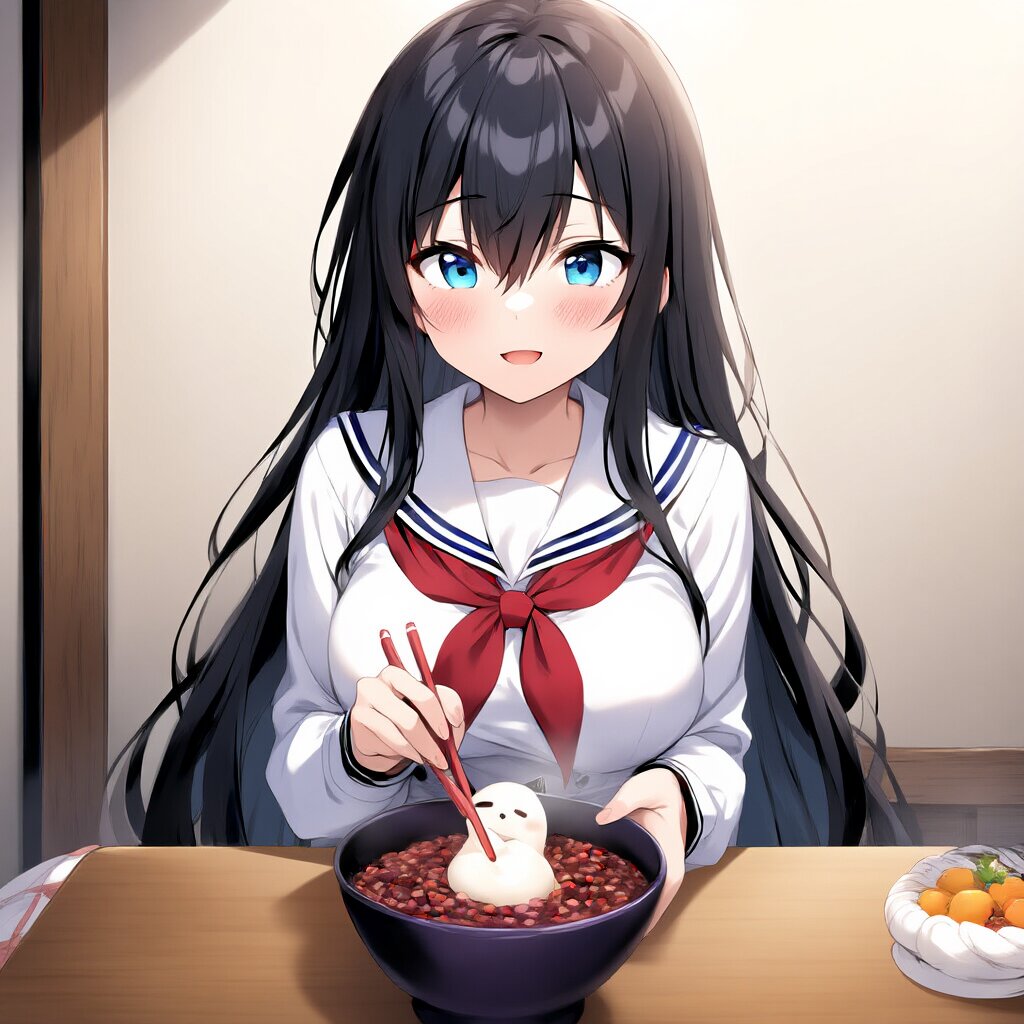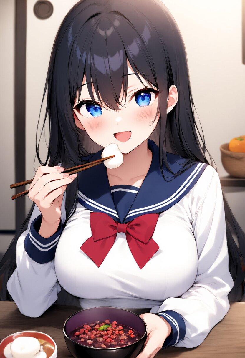 {{{highly detailed}}}, {{{interspecies}}}, {{{beautiful detailed}}}, style of ai-generated, 1girl, solo, blue eyes, very long hair, black hair, hair between eyes, large breasts, smile, open mouth, {{{school uniform, white sailor suit, red sailor ribbon, blue skirt, long sleeves}}}, upper body, food, in food, {{{hold one's chopsticks}}}, {{oshiruko, sweet red beans, dark purple soup, mochi rice cake}}, eating, {{{japanese-style room, kotatsu}}}, {{{masterpiece}}}, {{{best quality}}}, {{{very aesthetic}}}, {{{ultra-detailed}}}, {illustration}, {{{extremely detailed}}}, {{{an extremely delicate and beautiful}}}