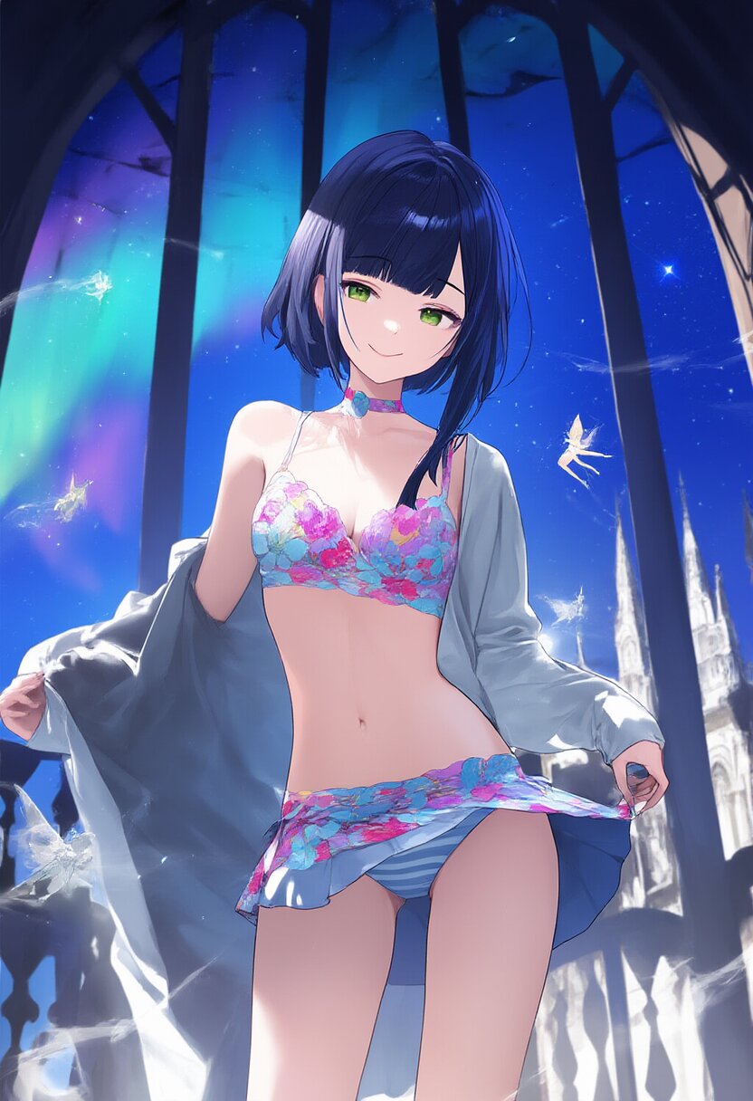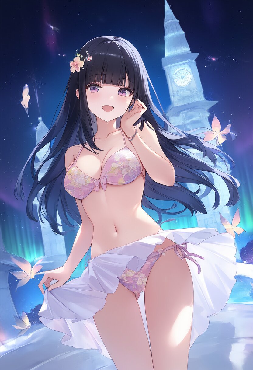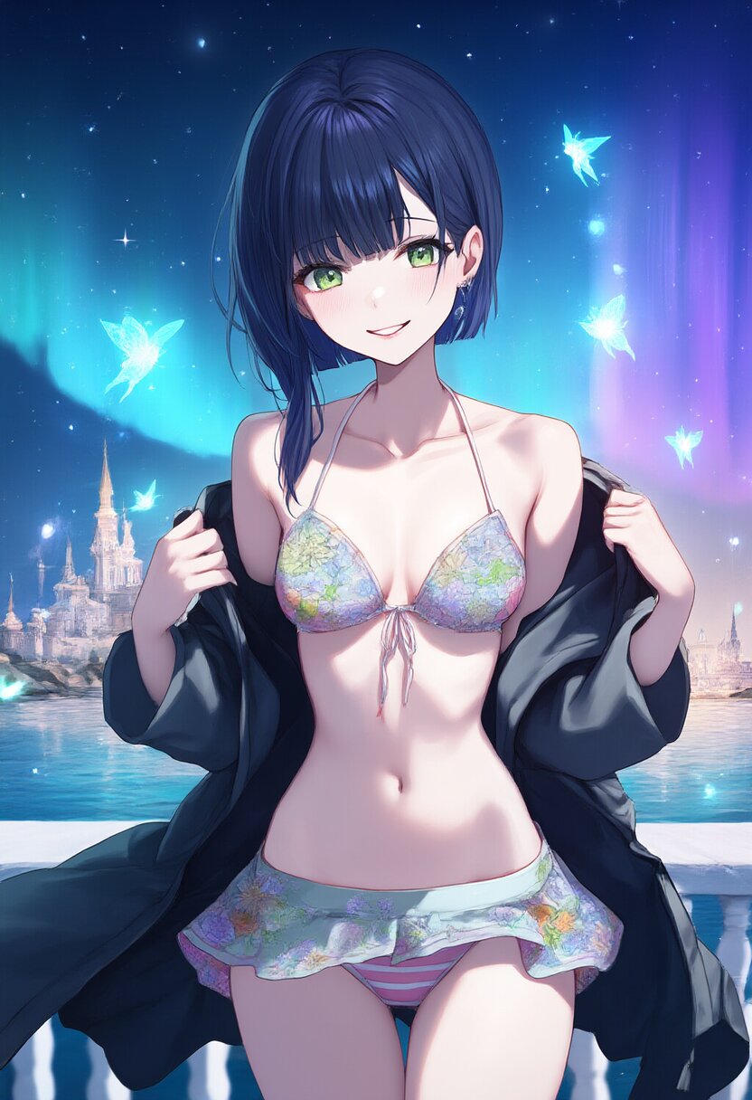 In a grand palace illuminated by cinematic lighting, a girl with long black hair and blunt bangs adjusts her pastel-striped bikini adorned with floral embroidery. The wind playfully lifts her skirt as she smiles, surrounded by floating fairies and shimmering auroras visible through the large windows., rating:general, best quality, very aesthetic, absurdres