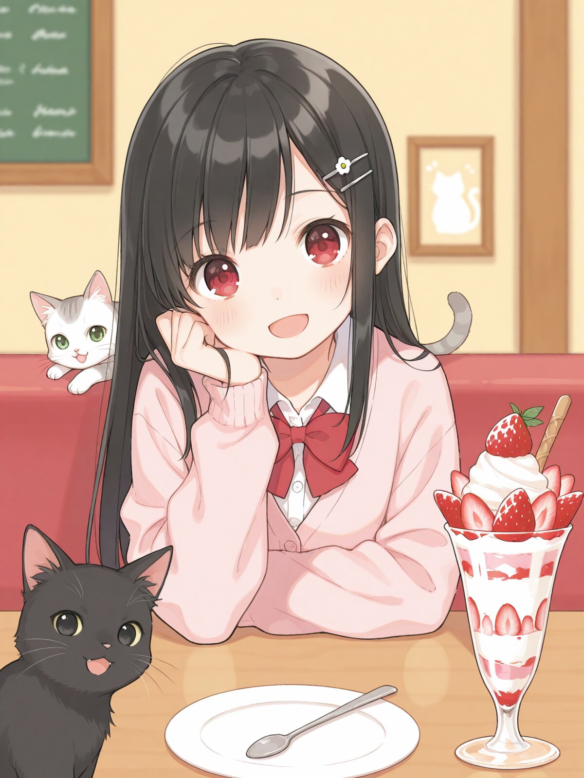 (flat color:0.4),(watercolor \(medium\):0.4), (sketch:0.2),(tareme:0.3),cute girls, (a cat:0.9),ruby eyes, straight hair ,black hair,( hair flower:0.4) , hairpin,kawaii, (pastel theme :0.5), (depth of field:1.3), (bokeh:0.6),(perspective:0.3),:D,(:o:0.5), (head tilt:0.8),(head rest:0.8), BREAK (cat on table:1.3) , hand up, looking at viewer, pale pink cardigan, parfait, cafe, red bowtie, (from side:0.3),( from above:0.4),refined composition, nostalgic mood, (pastelcolor:0.2)