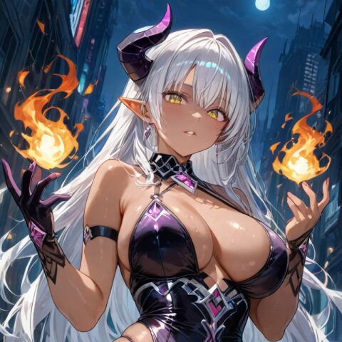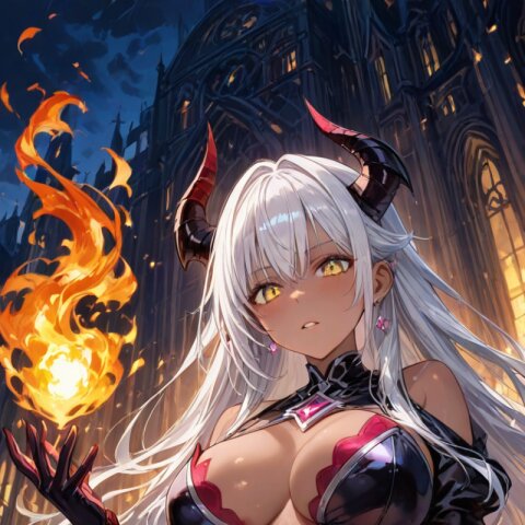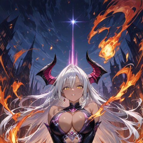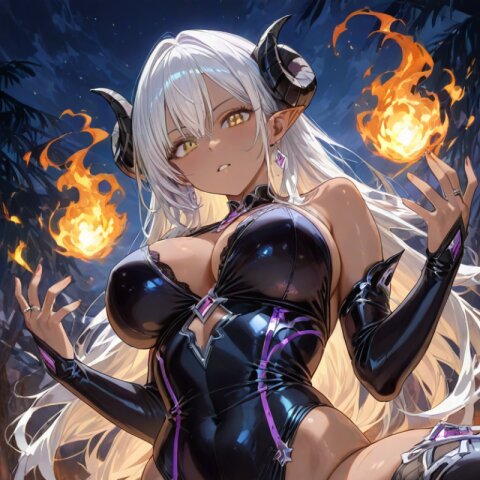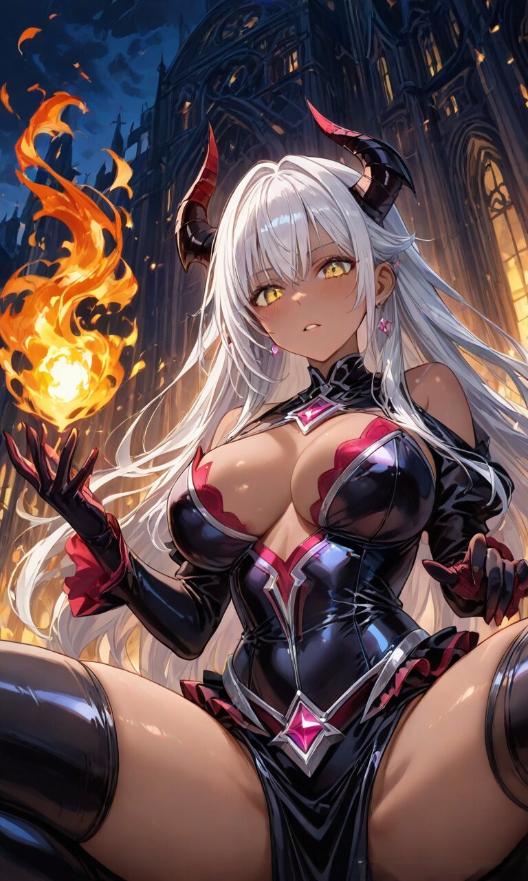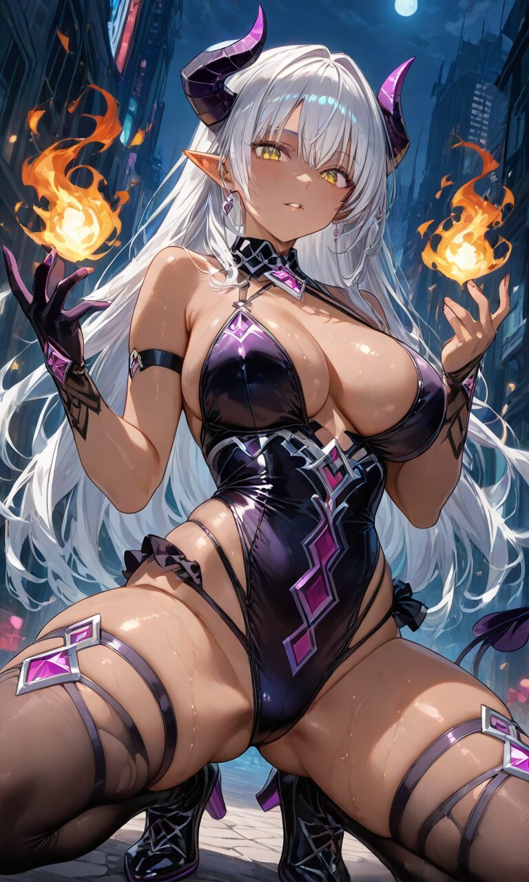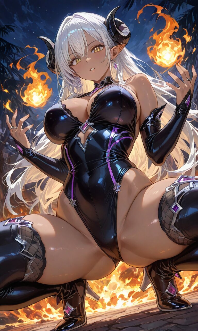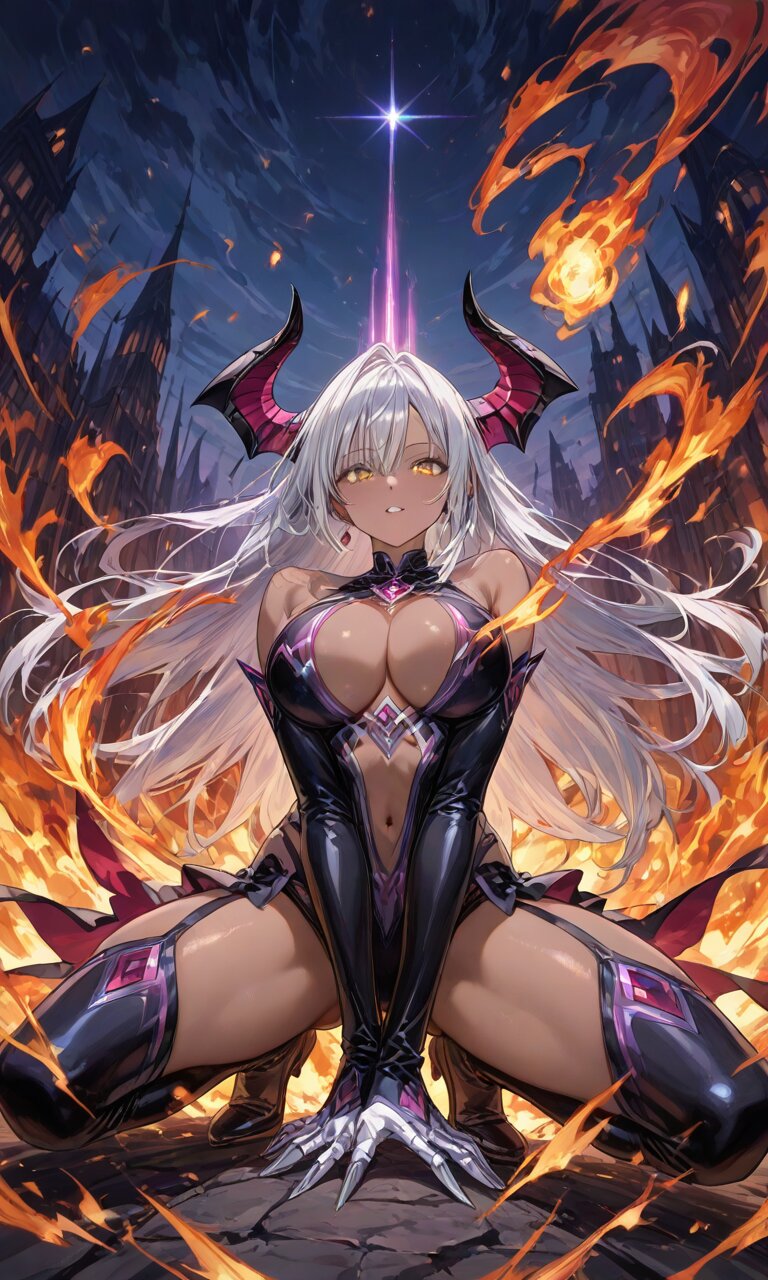 score_9, score_8_up, score_7_up, source_anime, masterpiece, best quality, very aesthetic, detailed background, official art, 2d, semi-realistic, chibi style, sharp focus, nice hands, perfect hands, perfect anatomy, perfect structure, outdoors, (1girl, solo), cowboy shot, gaze at me, low angle, from below, BREAK (A blazing magical flame field). BREAK (Illustration, Dynamic compositions and scenes like the last scene of a movie. She wears an little devil fashion. squatting. spread legs. evil pose), BREAK beautiful eyes, ultra detailed lips, cute, kawaii, adorable, little devil girl, golden eyes, (dark skin:1.4), dark-skinned female:1.4, (shine silver hair:1.3), medium-large breasts, wide hip,