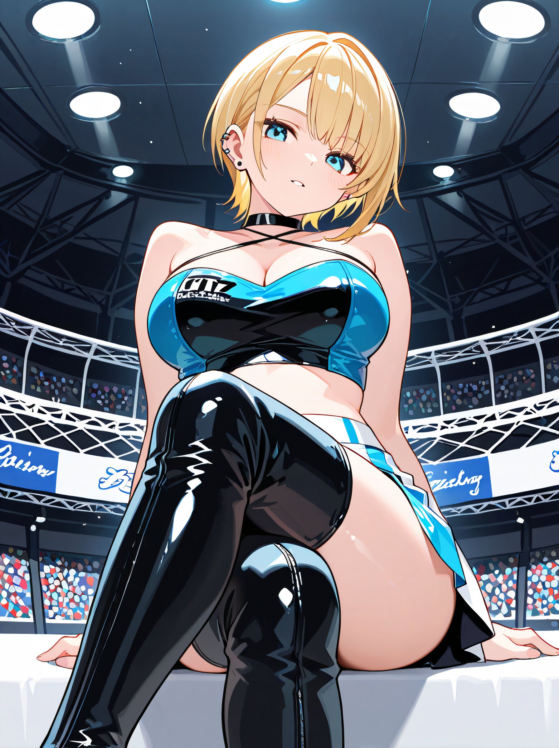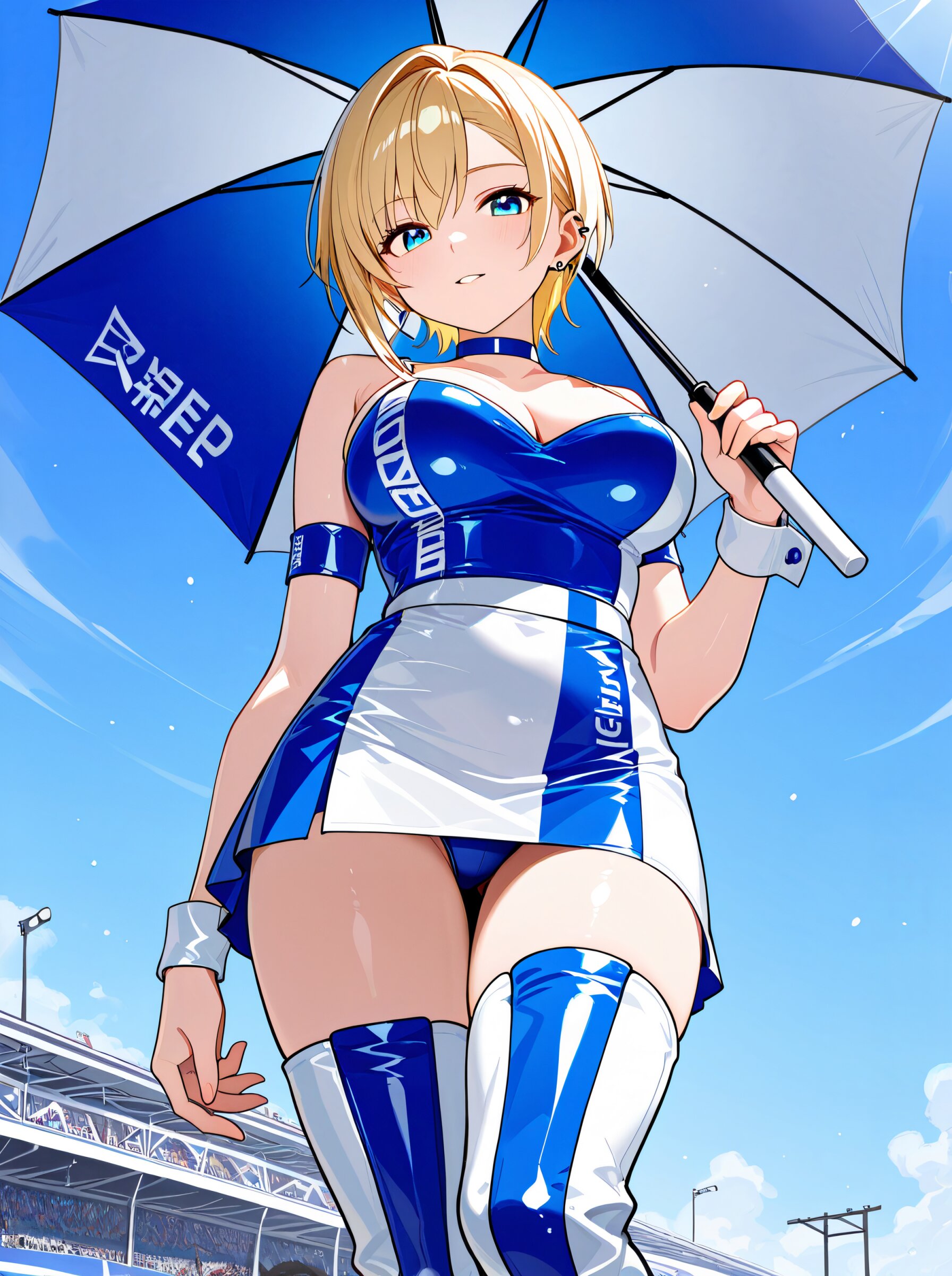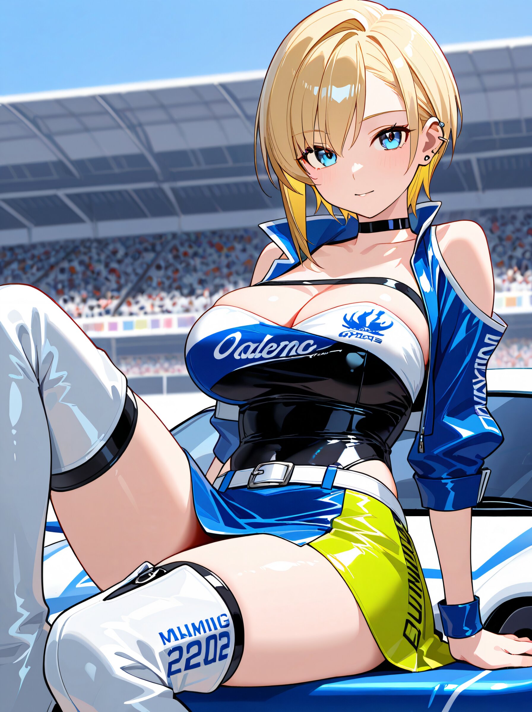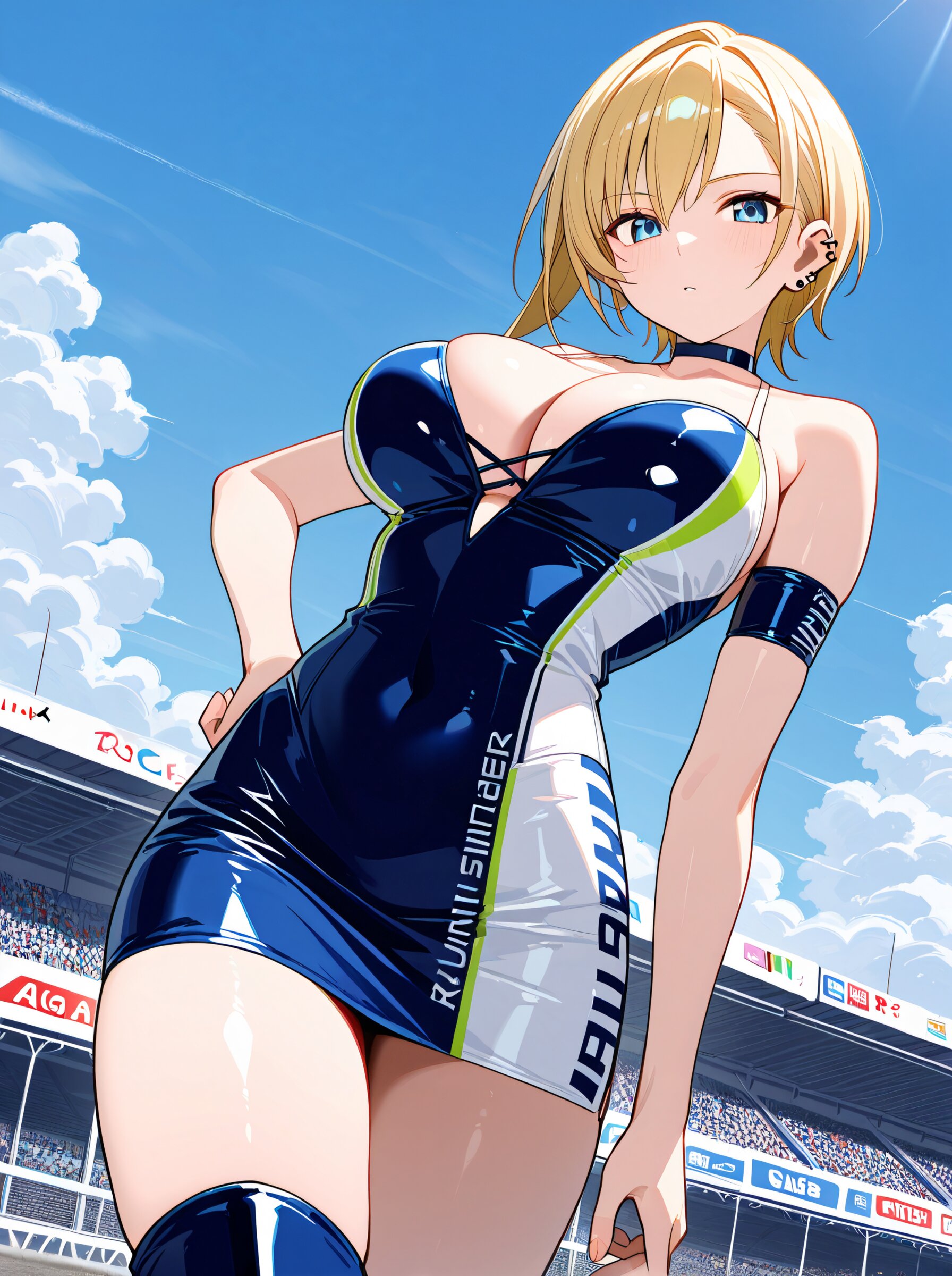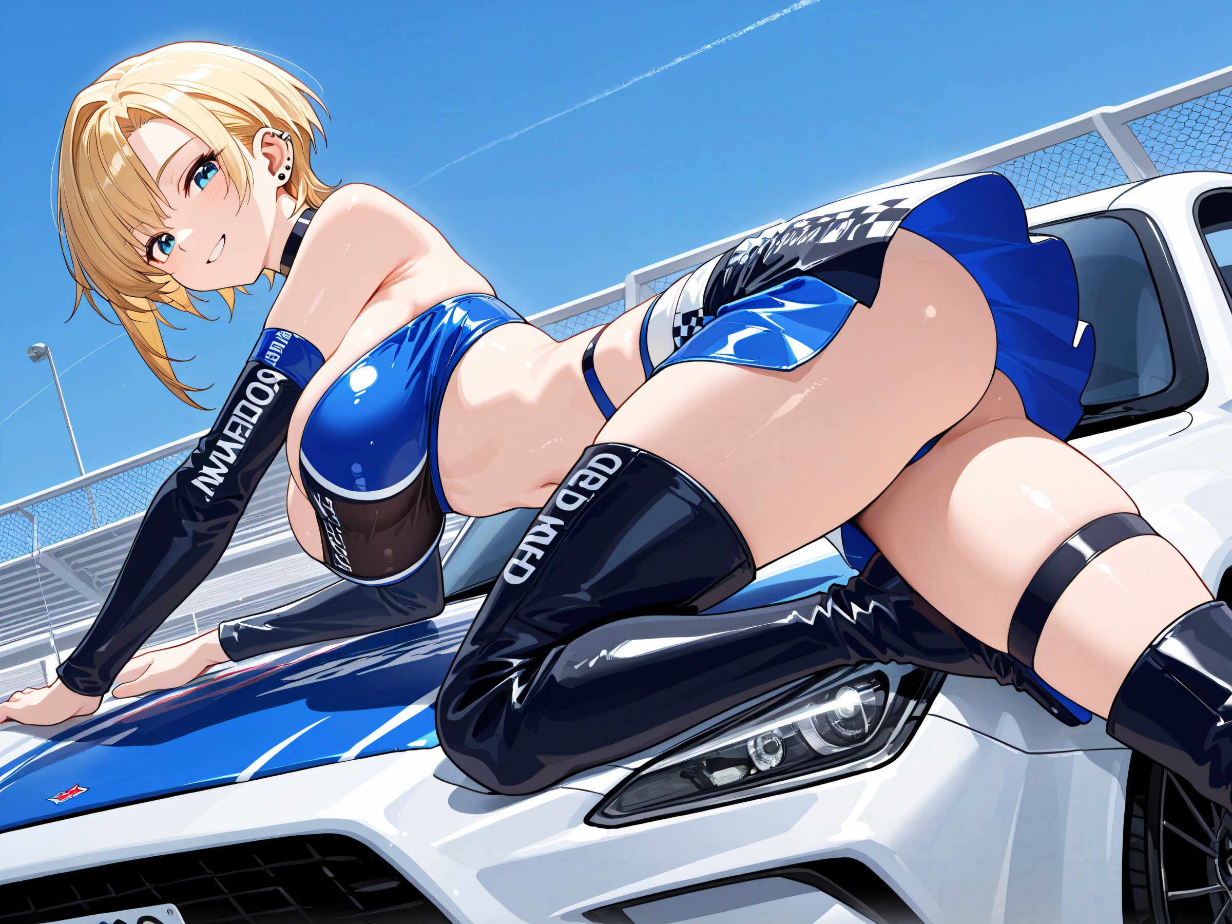 masterpiece,best quality,amazing quality,very aesthetic,high detailed skin,alluring high resolution,intricate detail,8k, rating safe, large breasts,blonde hair,short hair,asymmetrical sidelocks,choker,ear piercing, leg focus,close at viewer, dynamic pose,from behind blue sky, race_queen, two-tone_skirt, thigh_boots, hands on car,smile