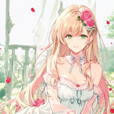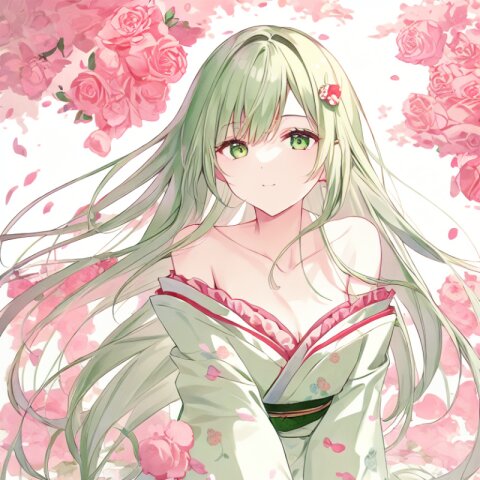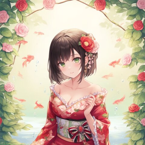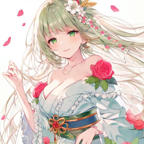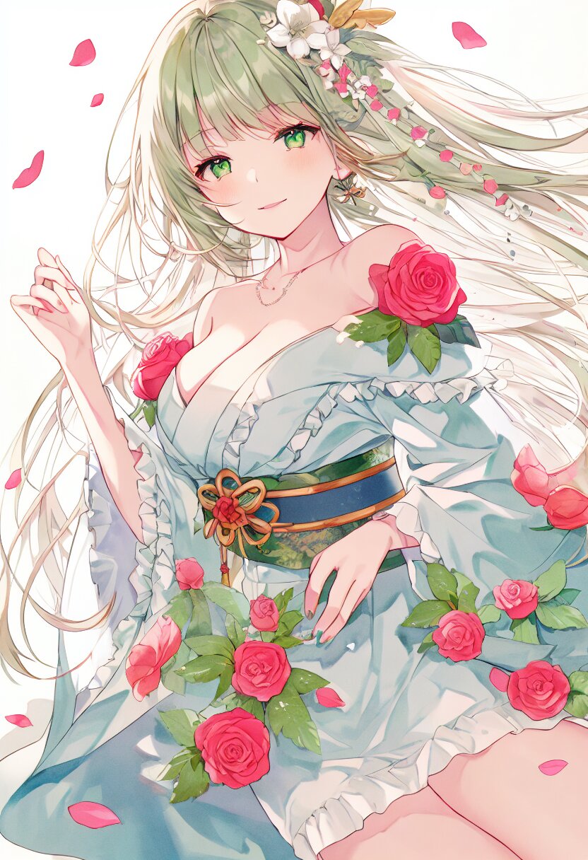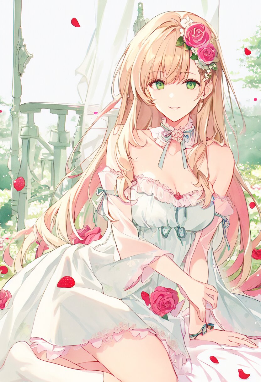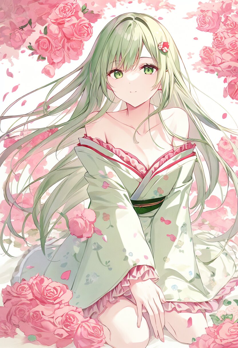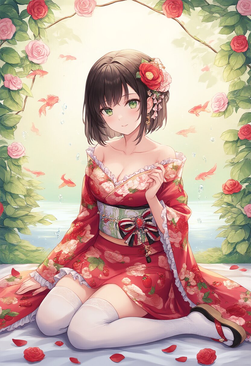 very aesthetic, best quality, absurdres, In a Japanese palace garden surrounded by delicate vines and blooming flowers, a girl in a watercolor dress with strawberry and rose patterns kneels gracefully. Her light green eyes shimmer as her frilled kimono slips off one shoulder. The serene backdrop of soft sheets, floating fish, and cascading petals completes the scene, blending purity and traditional elegance with a touch of fantasy.