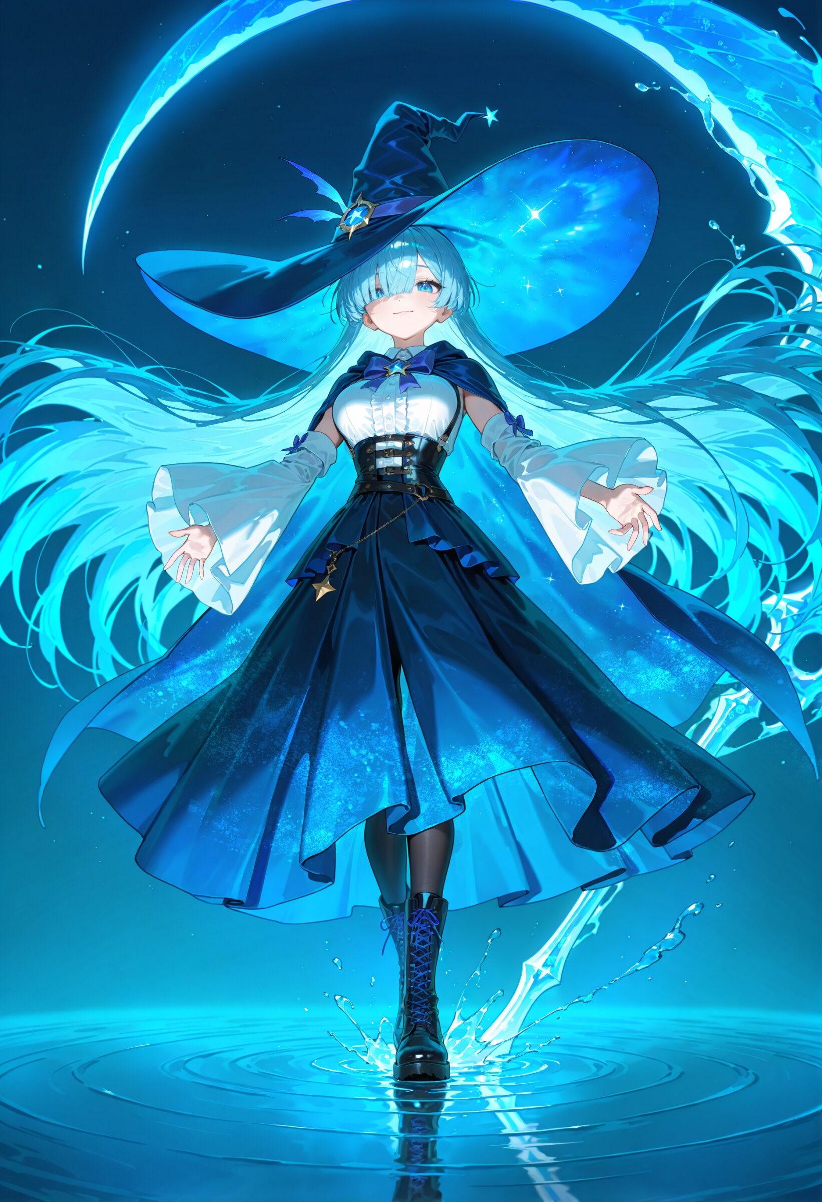 (upper body:1.2) from below, looking down looking at viewer, 1girl, witch girl, blue eyes, beautiful iridescence eyes, beautiful detailed eyes, beautiful light blue hair, long bangs, long disheveled beautiful hair, first-rate female bodies, perfect body, beautiful breasts, framed breasts, cool face, (Beautiful Lips:0.7),, (stylish beautiful witch dress:1.2), detached sleeves, (cute blue and dark blue witch girl costume:0.9), (white blouse:1.3), bow tie, witch long skirt (overskirt:1.1) white cape, (blue galaxy witch hat:1.1), lace-up boots on feet, stockings and suspenders,, mysterious face, disappointment,light smile , water magic, ripples, reflective water, floating huge scythe, , 8K, unreal engine, masterpiece, best quality, amazing quality, very aesthetic, absurdres you can add scenery, (volumetric lighting), To make the background more distinctive. professional art lots of details, , overexposure, shiny-glistening, (watercolor style:1.0), (pastel color style:0.0) <lora:noline (1):-0.5> <lora:sdxl2-flat2-512b:0.15> <lora:facelightup_xl_v10:0.5>