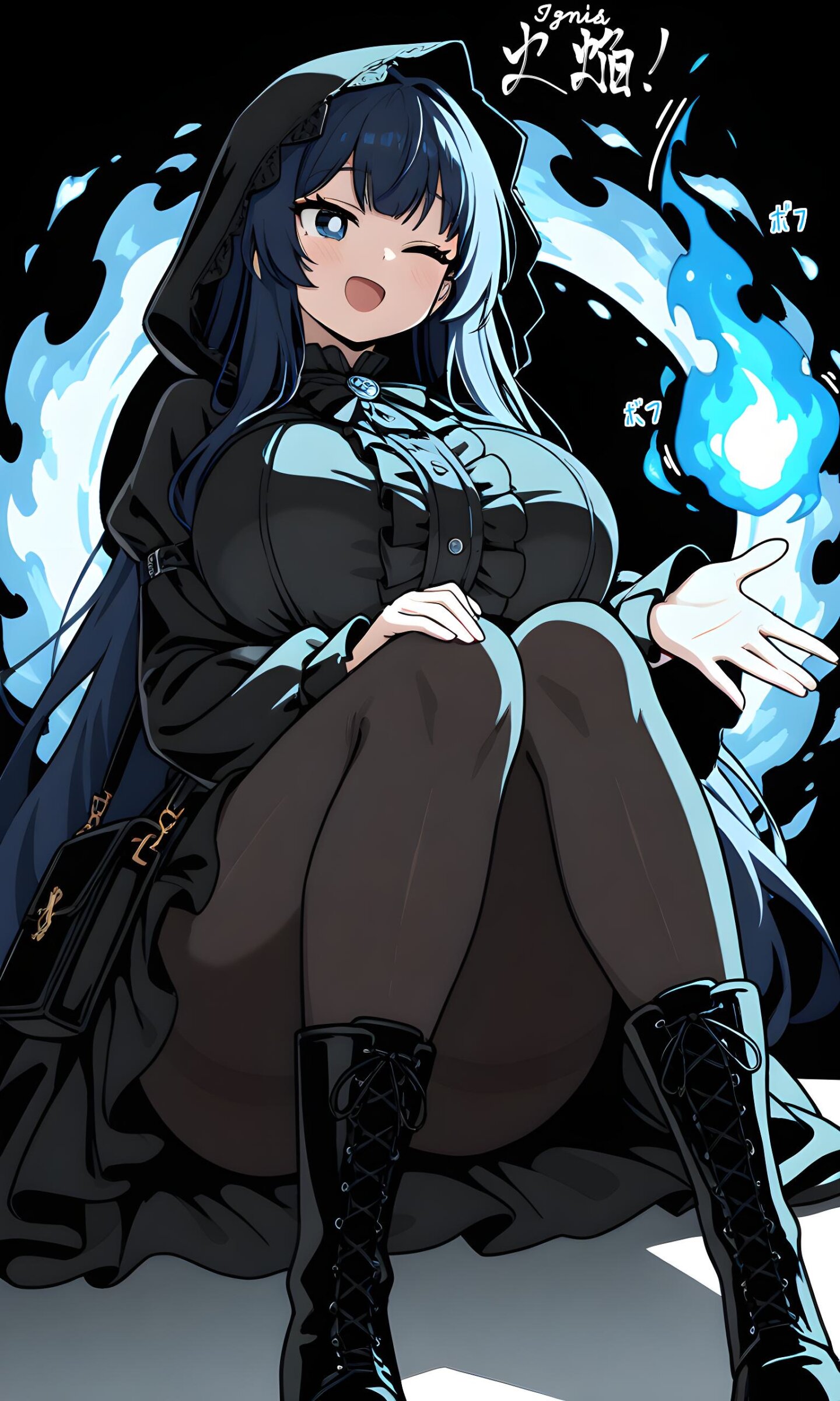 1girl,(huge breasts),narrow waist,thick thighs,long legs,black robe,black hood,long sleeves,gothic black dress,long dress,center-frills,long gothic shoulder bag,dark black pantyhose,black knee boots,dark blue hair,well-gloomed hair,dark blue eyes,tsurime,wide eyes,one eye closed,smile,open mouth,sitting,knees up,knees to chest,hugging own knees,outstretched arm,outstretched hand,magical fire on hand,blue fire,black background,grayscale,invisible floor,from front,((high contrast)),(stylized),(kawaii),softy,(cel rendering),cel shading,(2D),(cute),((correct_anatomy)),gddw