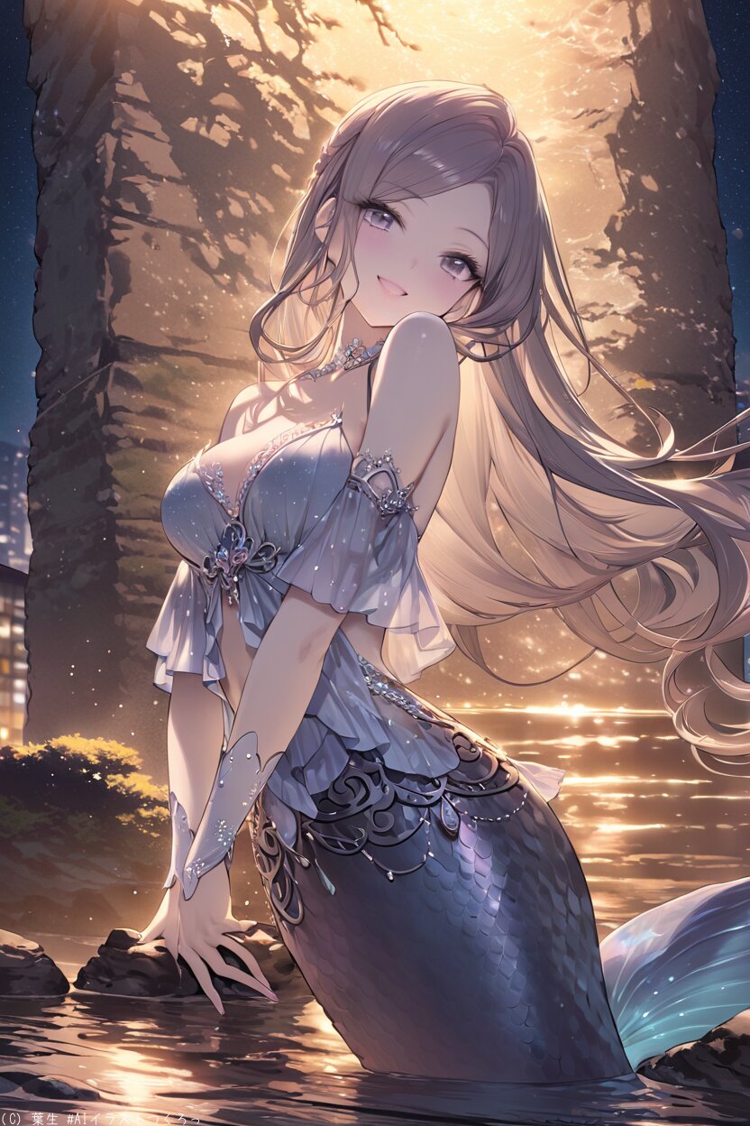 (best quality),(masterpiece),(ultra detailed),1 lady, (mermaid) smile, night, cowboy shot, (on rock)